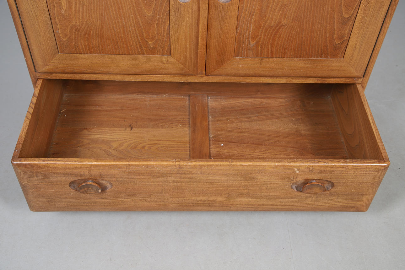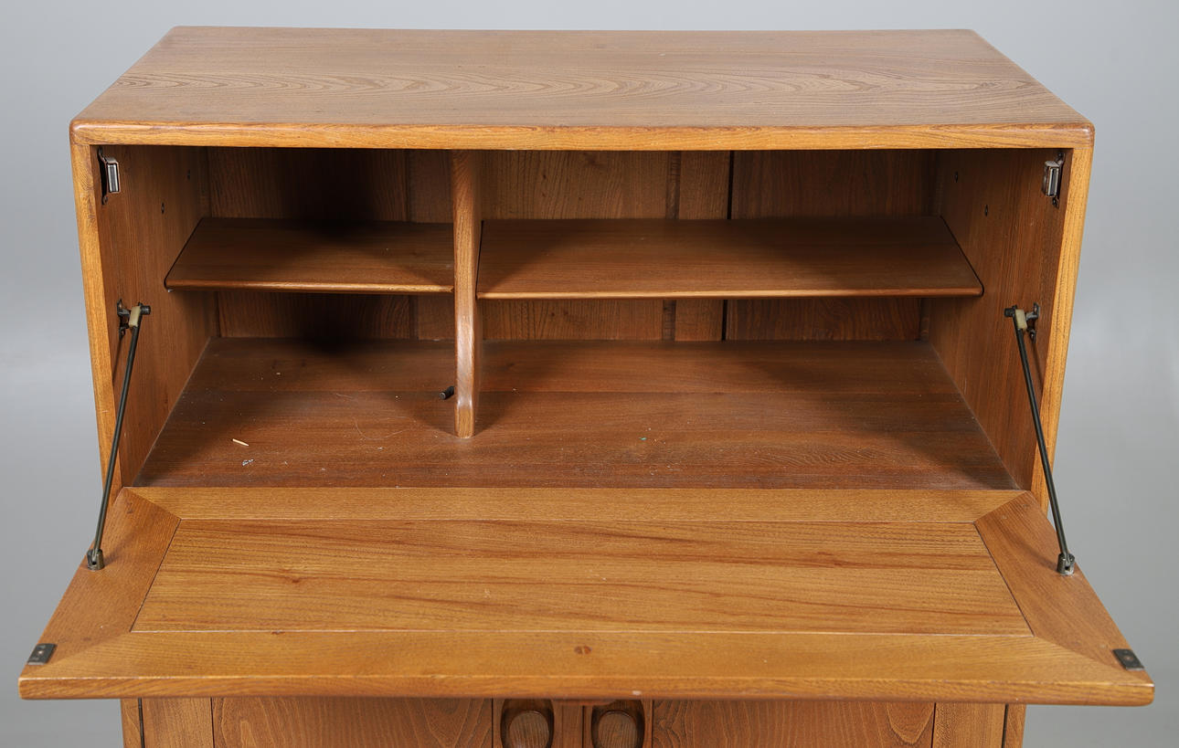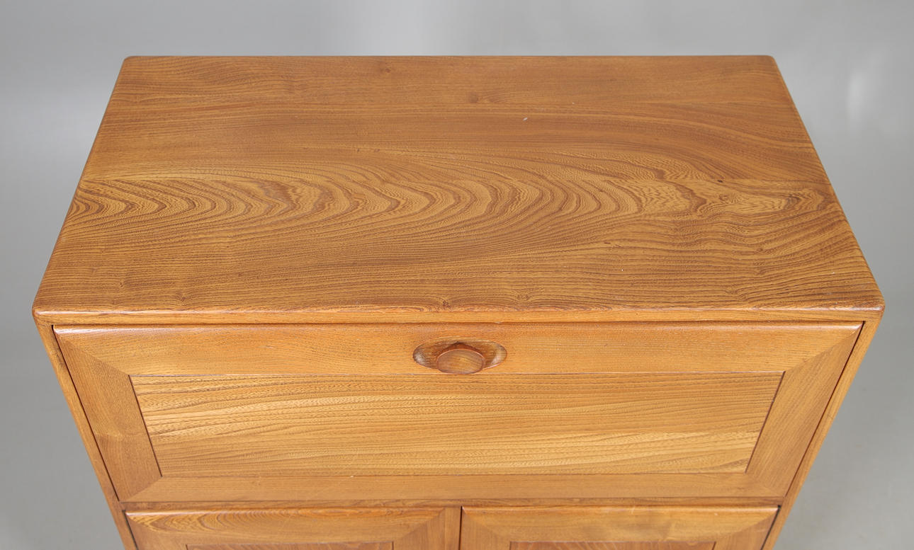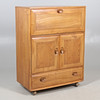 An Ercol light elm bureau with a drop down flap, and a two door cupboard over one long drawer. With an Ercol label to the interior. 110cms high, top 82cms by 43cms.