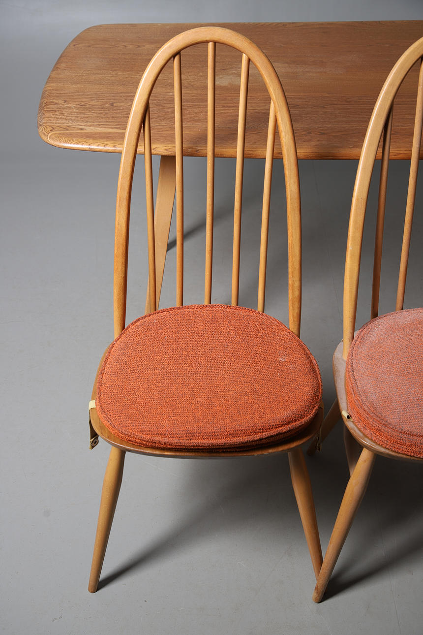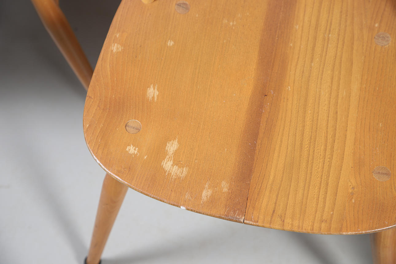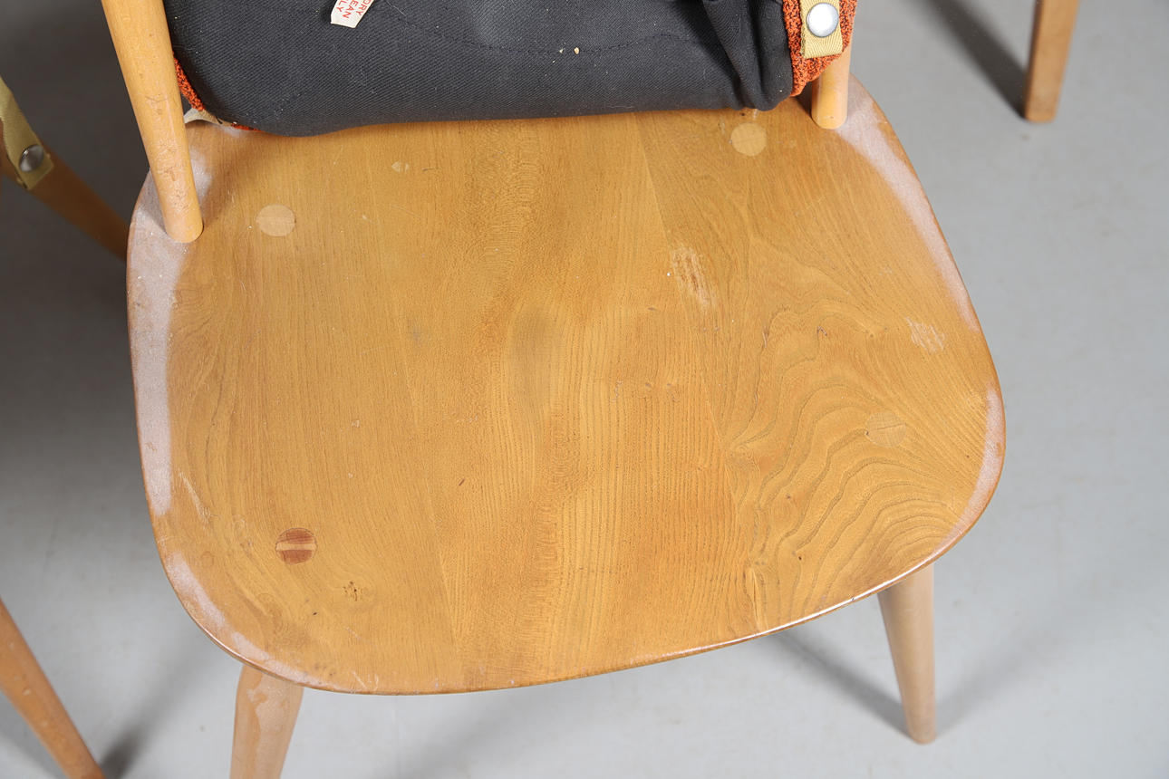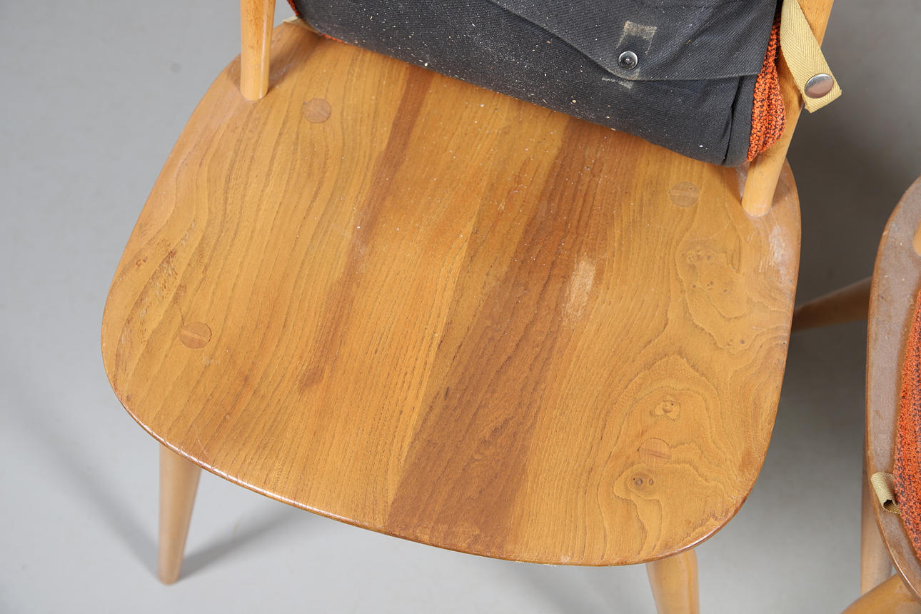 chairs, 4 chairs are generally fine with some marks and wear to the seats and backs, two have splits to the top rail (one has an upright reglued into place), 4 have cushions.