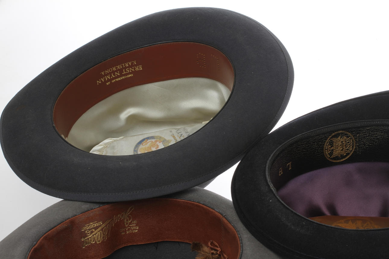 The hats are marked as follows: Joseph E Ward, Stockport, England - PUB Stockholm Import Pall Mall, Made in England - Imported by Ernst Nyman Karlskrona.