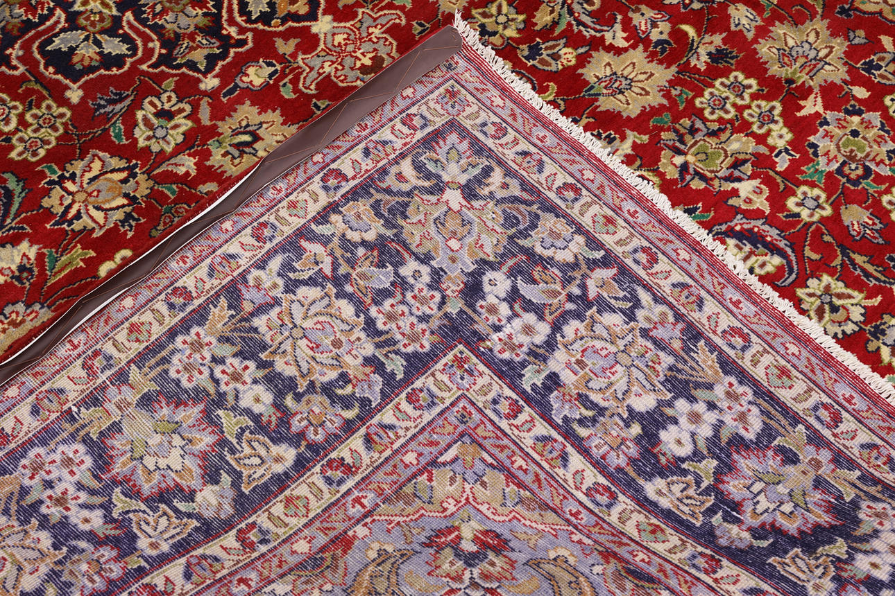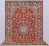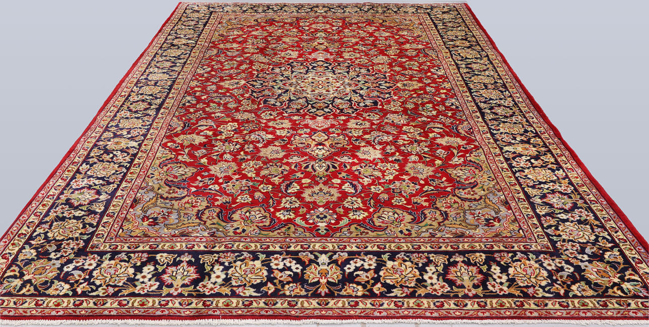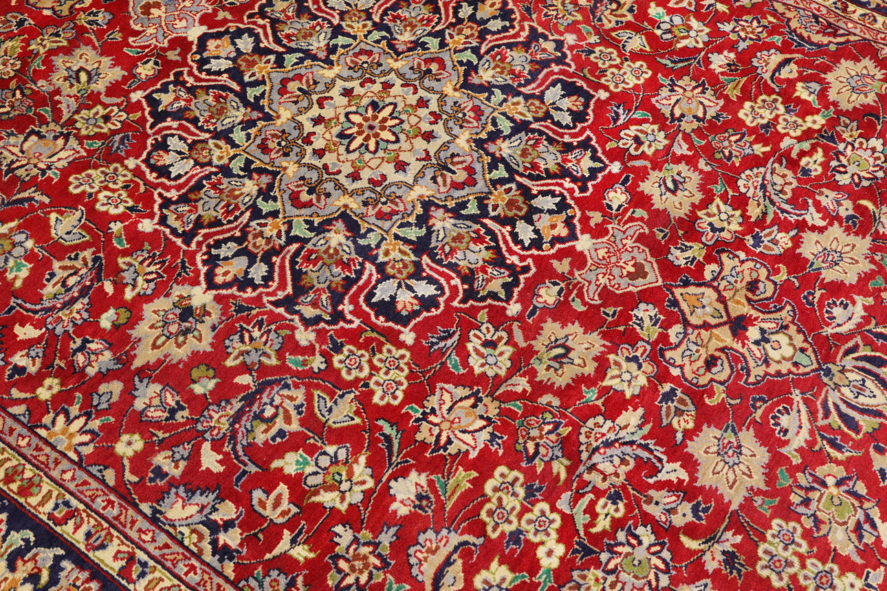 Nadjafabad with red base color and a floral medallion in beige, blue and lighter tones. The center field is densely decorated with flowers, palmettes and creepers, and framed by a dark border with similar motifs. The forelock is made of wool and the warp is of cotton.