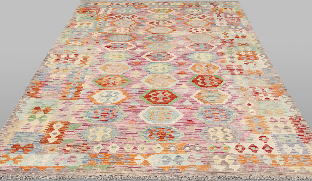 Hand-woven Kelim in classic design with geometric pattern in polychrome color scale.