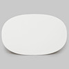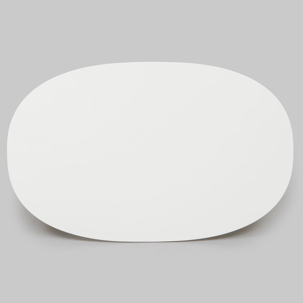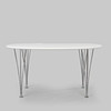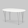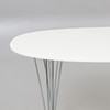 White lacquered disc on clamping legs in chromed steel. Labelled, manufactured under license agreement with Fritz Hansen, Denmark. Length 135 cm, width 85 cm, height 70 cm.