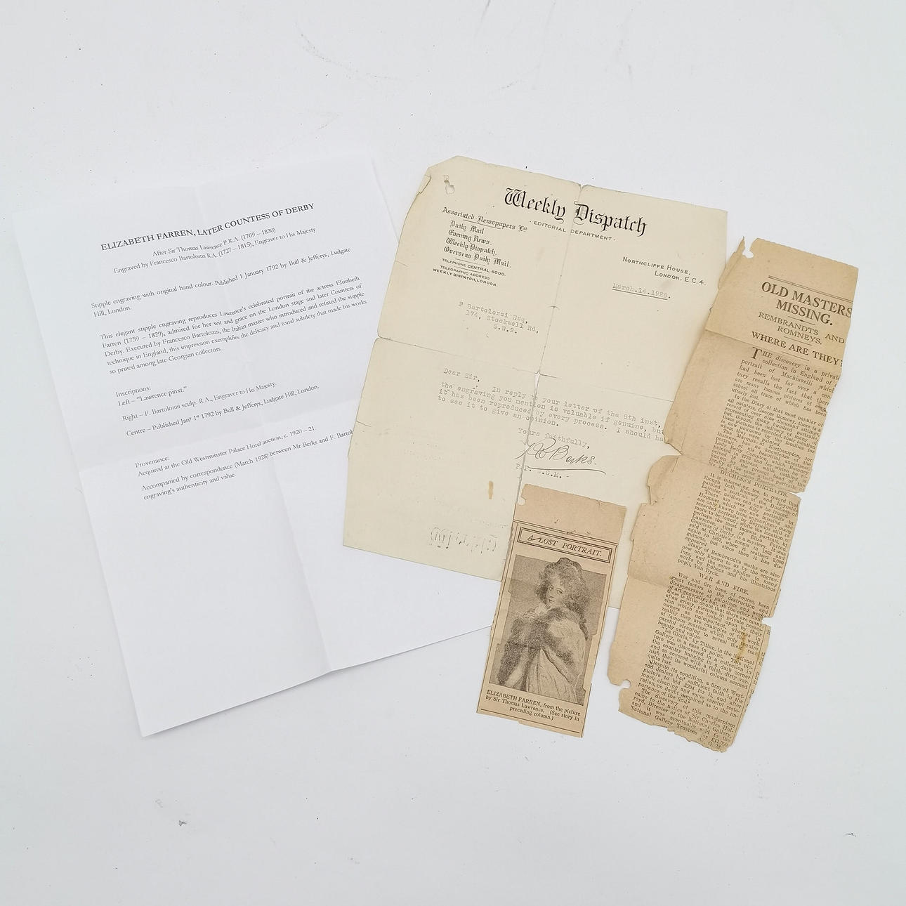 Has some cuttings and 1928 headed letter regarding the subject and the engraving has some surface marks.
