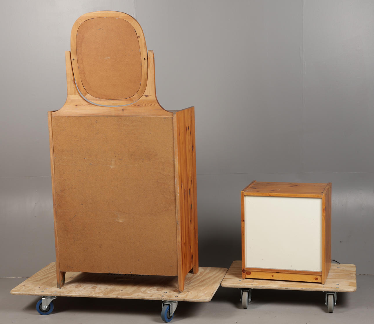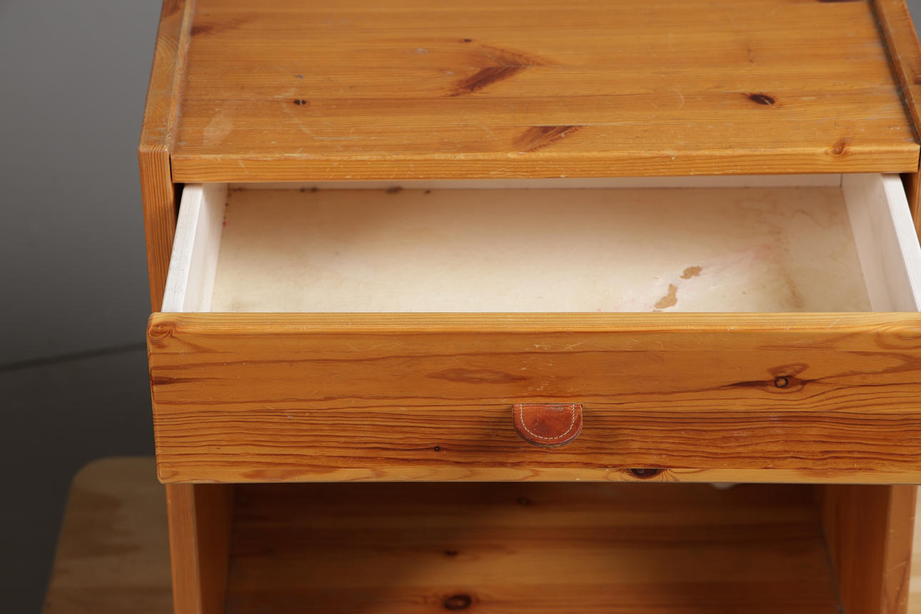 Dressing table with expected wear, two stickers and some heavier marks to surface. Bedside cabinet also with wear and marks.