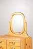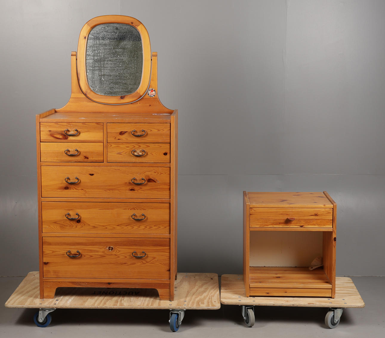 The rounded square mirror above three short and four long drawers, 160cm height, 76cm width, 42cm depth, together with a pine bedside cabinet with leather drawer pull, measuring 54cm height, 50cm width, 37cm depth. (2).