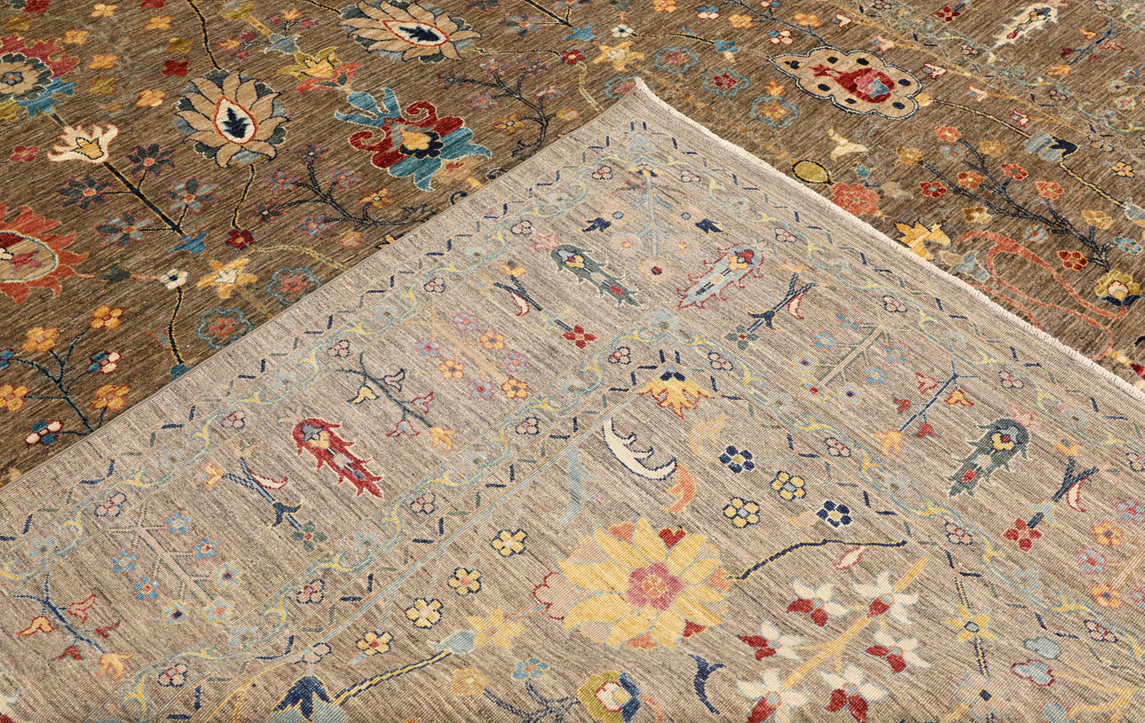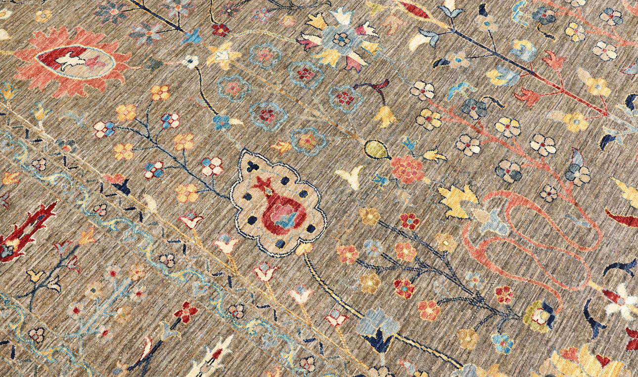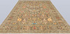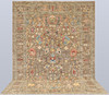 Zigler design with warm beige base color and symmetrical composition of stylized palmettes, flowers and plant motifs in muted blue, red and yellow tones. The border has matching bottom color and additional floral and tree motifs. The bangs are made of wool and the warp is made of cotton.