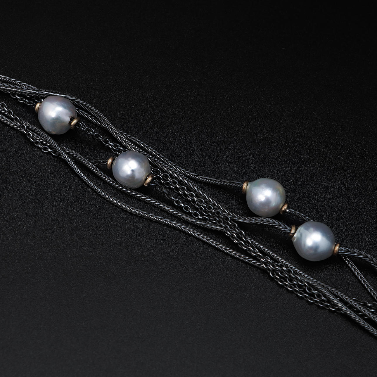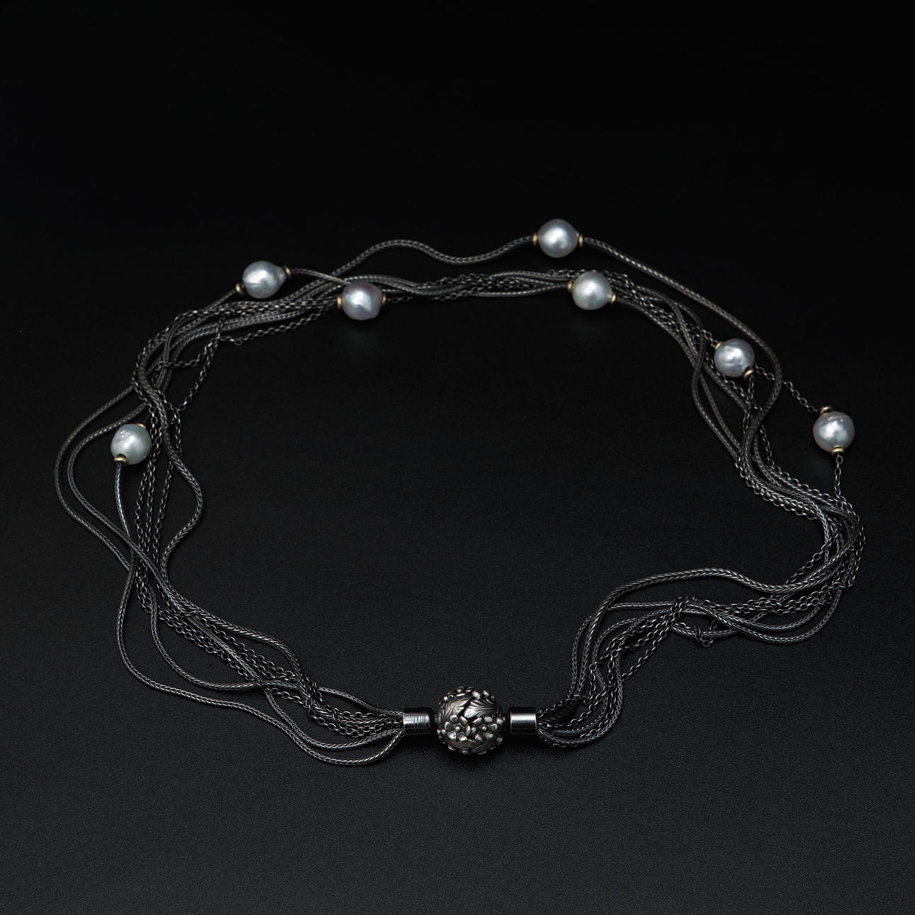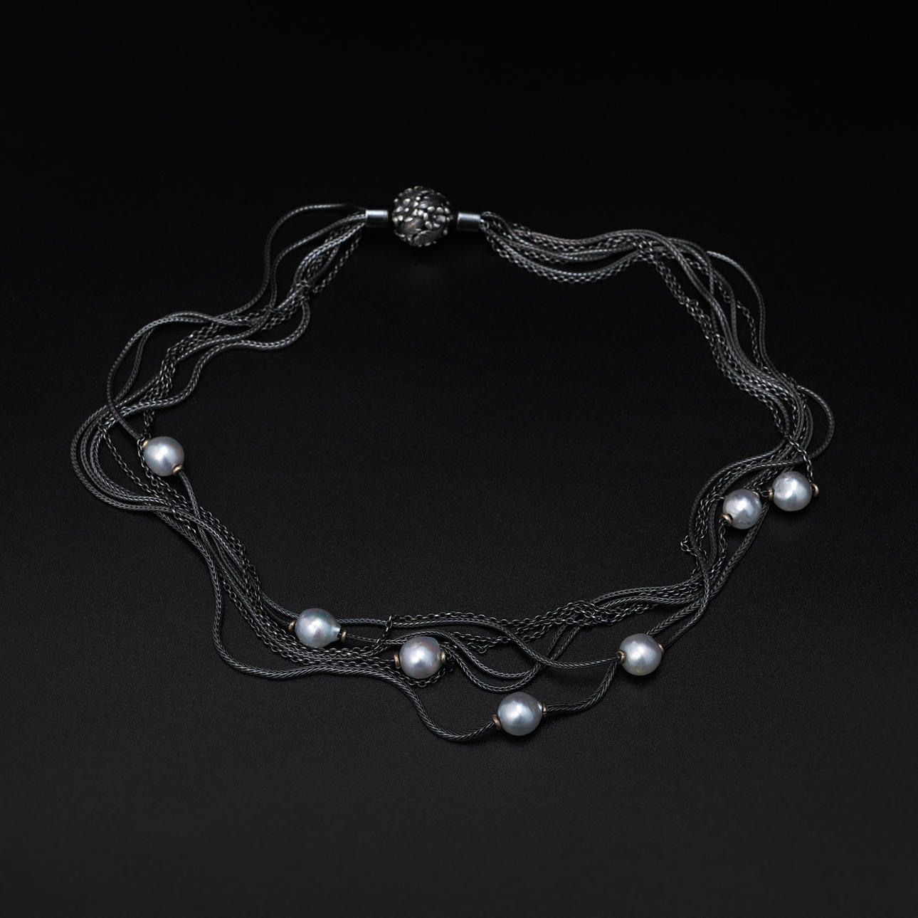 7-row necklace in oxidized silver with light gray pearls and ball clasp. Length approx. 44 cm.