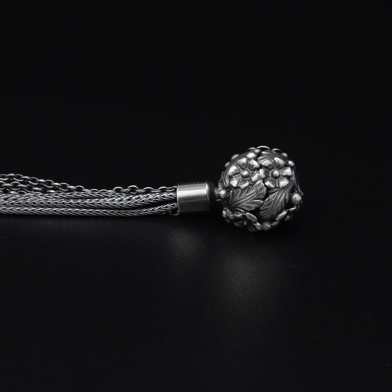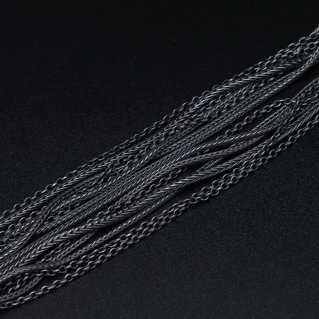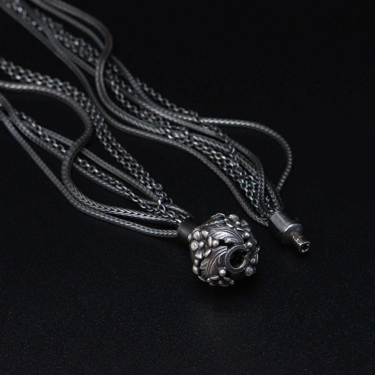 7-row necklace in oxidized silver with light gray pearls and ball clasp. Length approx. 44 cm.