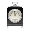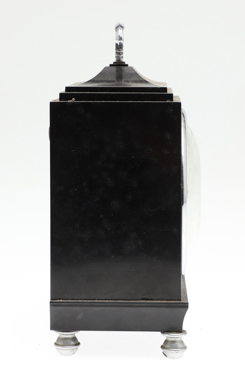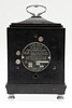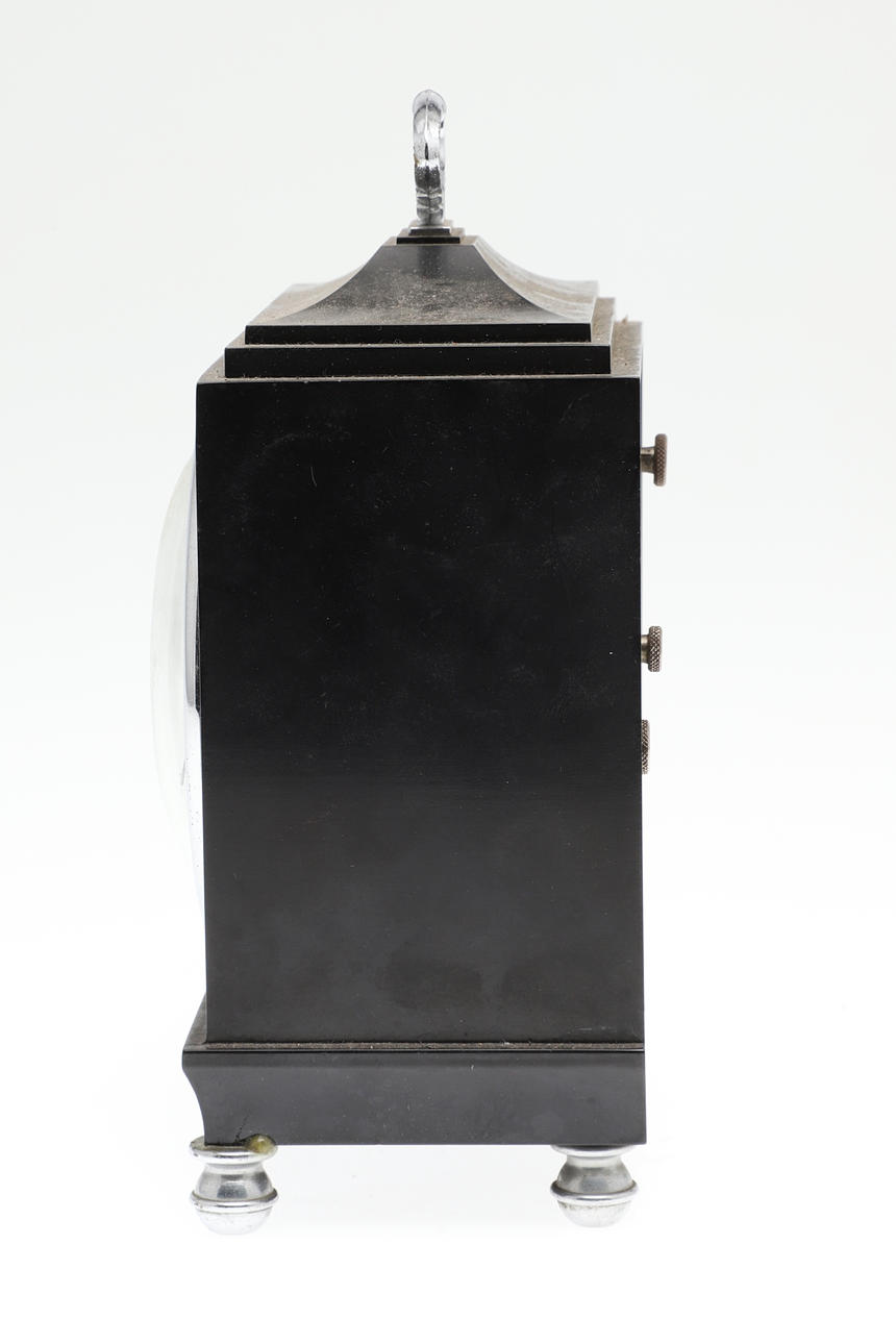 the 3.5" silvered dial with days of the week and date of the month apertures, within a black case with caddy top and chrome carrying handle, manufacturer's operating instructions verso, 12cm x 8cm x 20cm high.