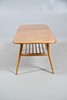 model 459, with a rectangular shaped elm top supported on beech legs, with spindle shelf underneath for storage, 104cm x 44cm x 36cm high.