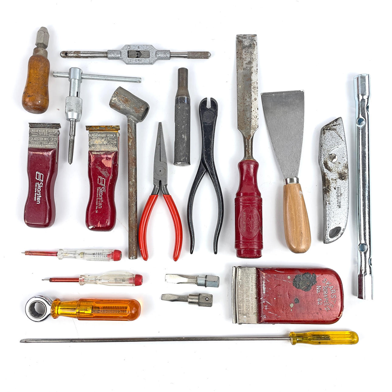 Consisting of: files, pliers, screwdrivers, hammers, hand saws, water passes, etc. Dimensions of the whole lot: about 70x41x20 cm.