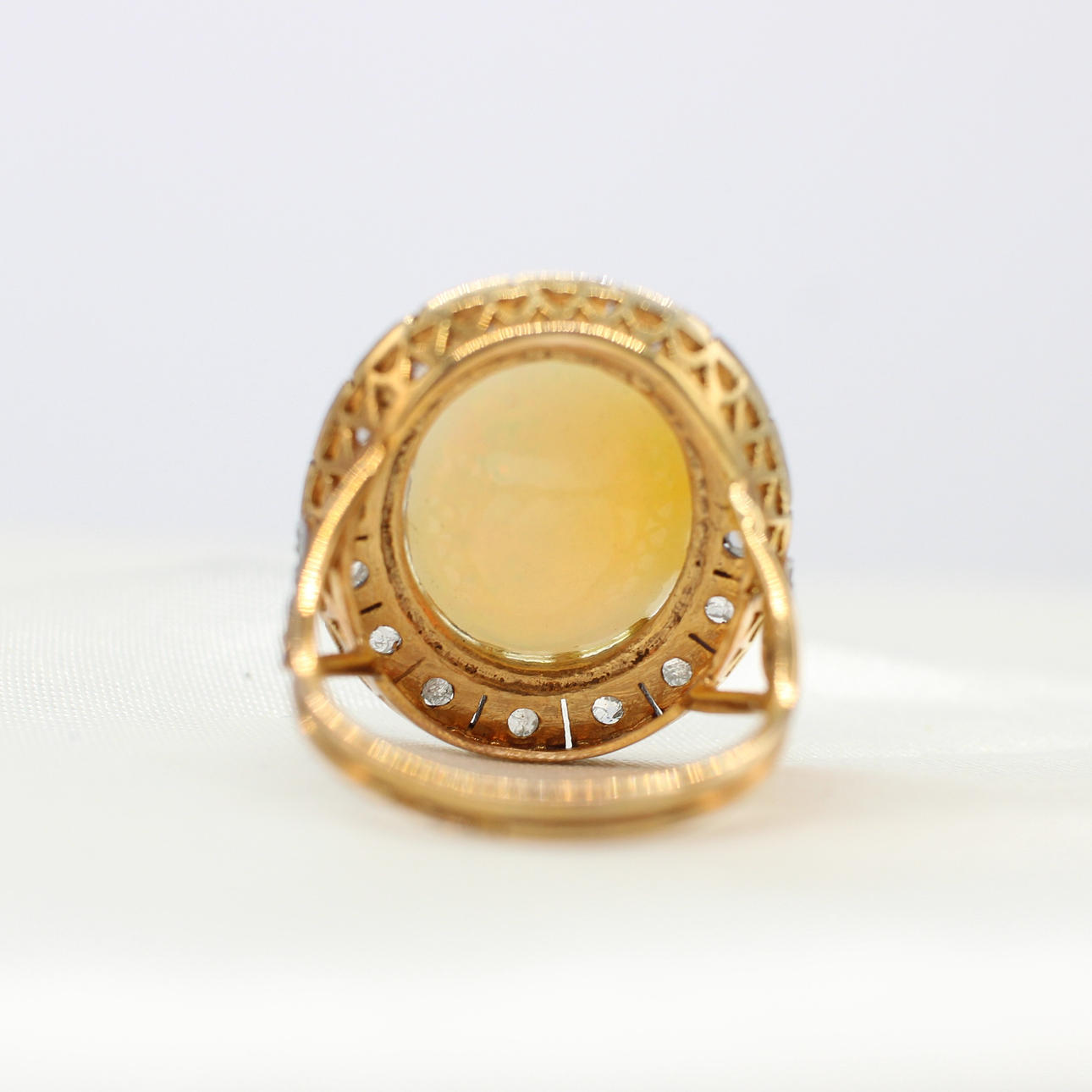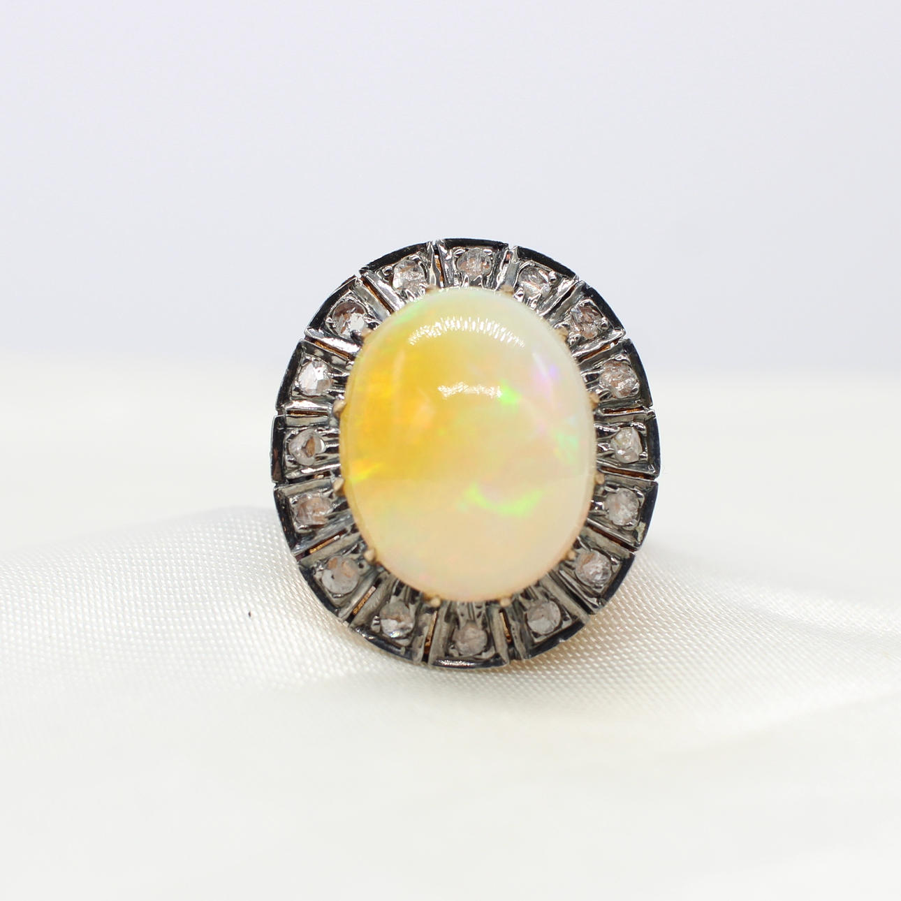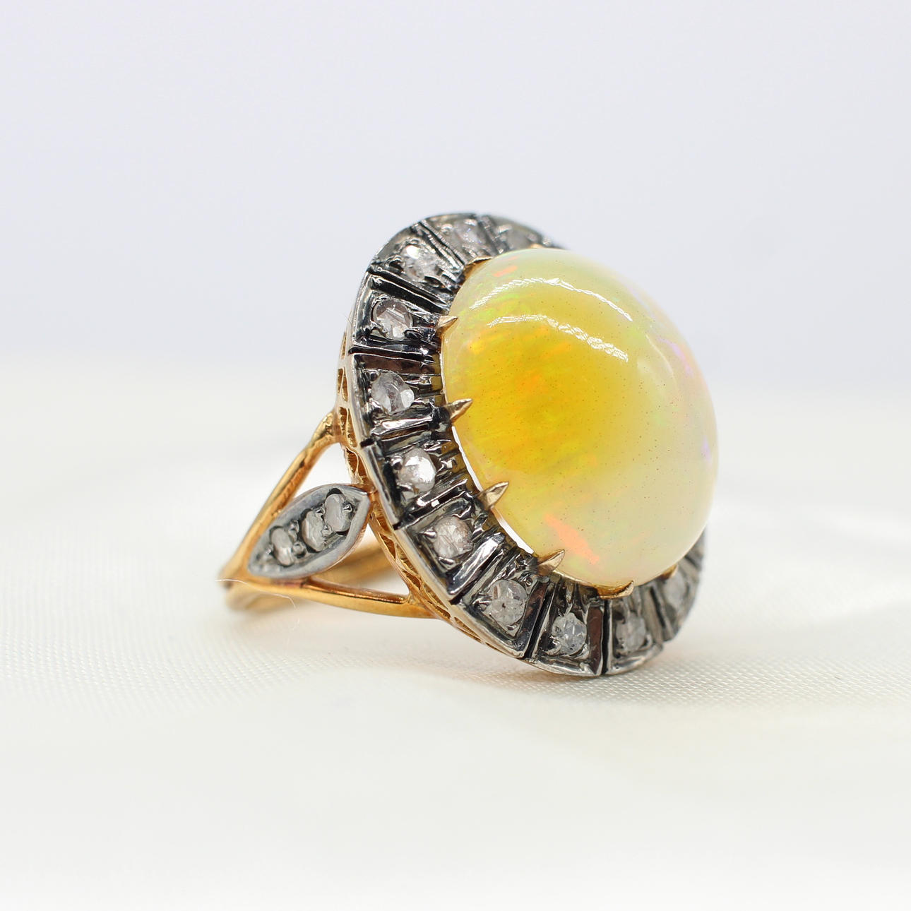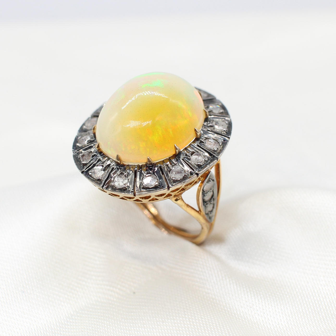 A 14K vintage style yellow gold (stamped 585) and silver (stamped 925) cabochon Ethiopian opal and rose cut diamond ring.