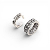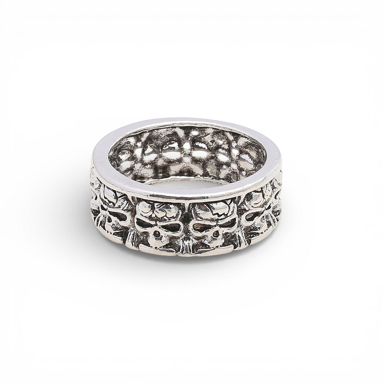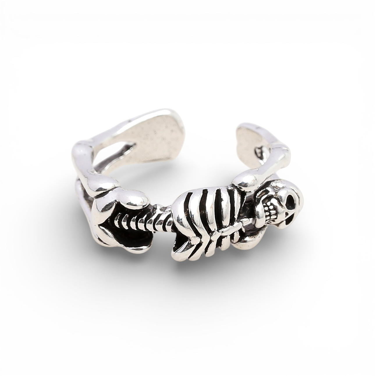 Two skeleton-shaped rings and skulls.