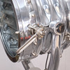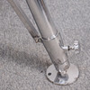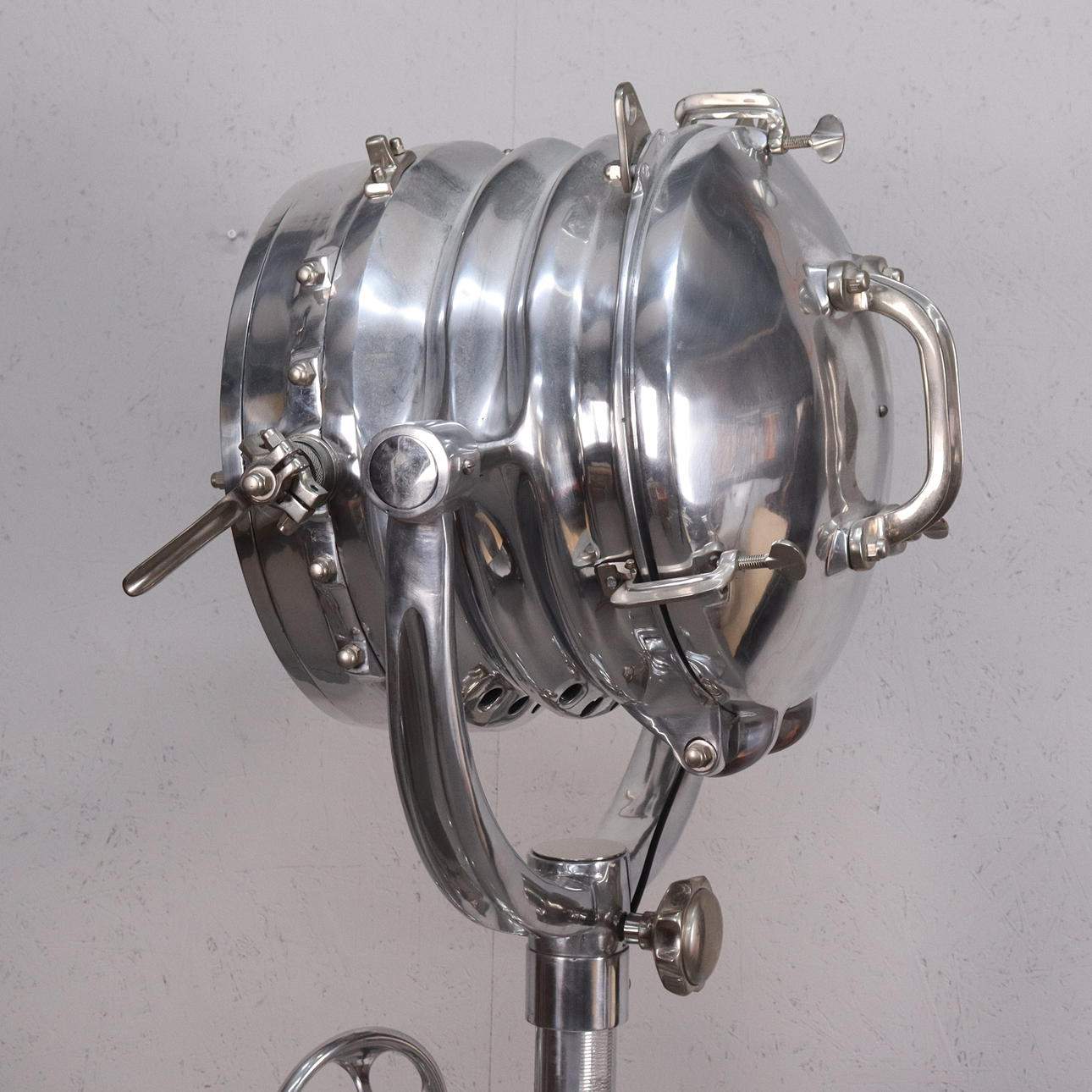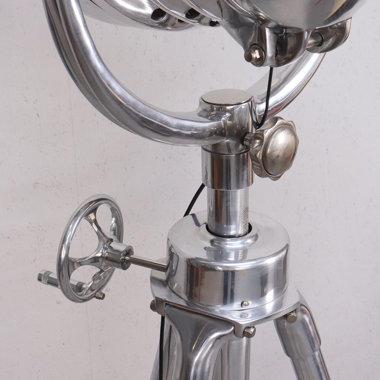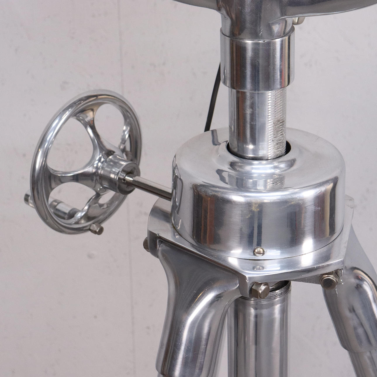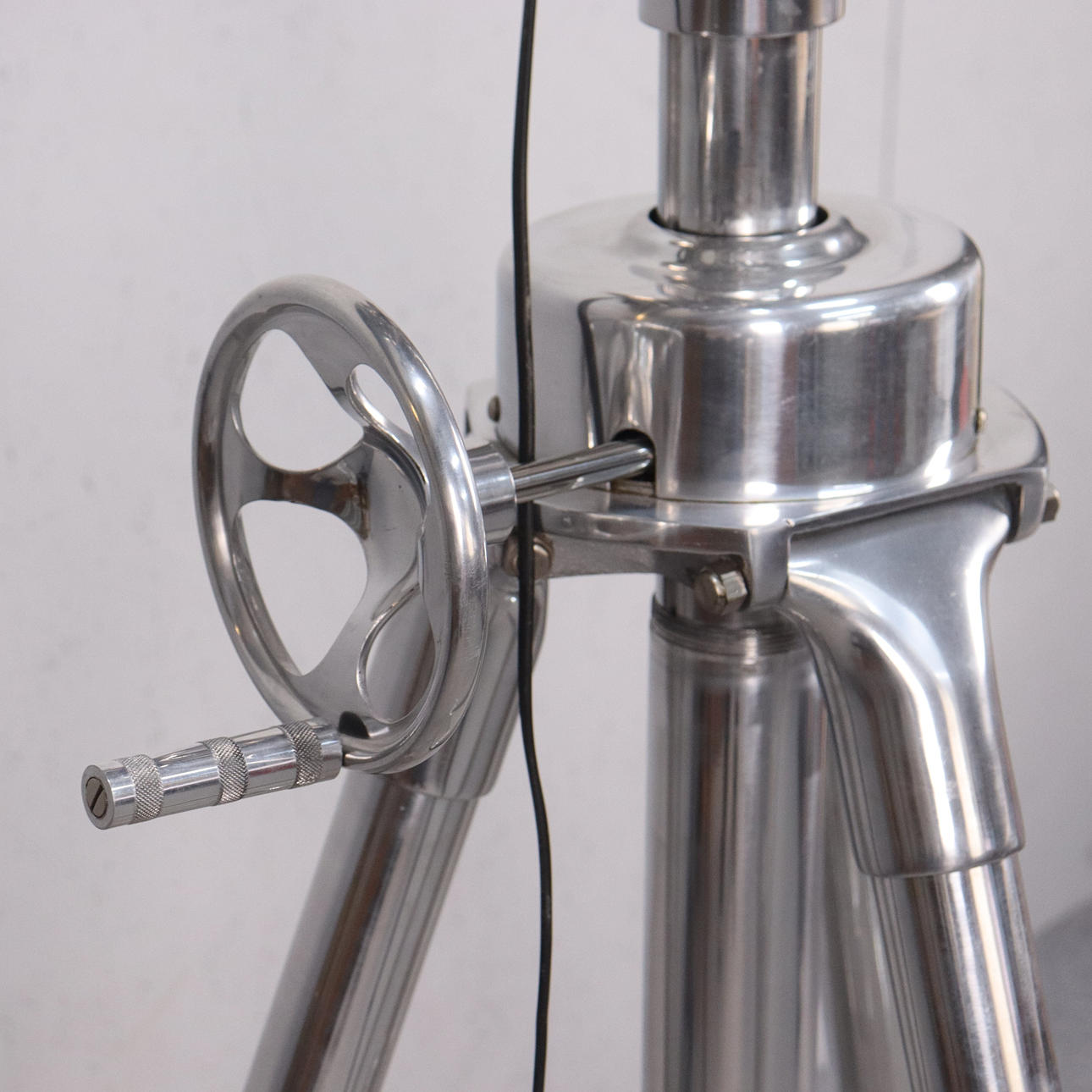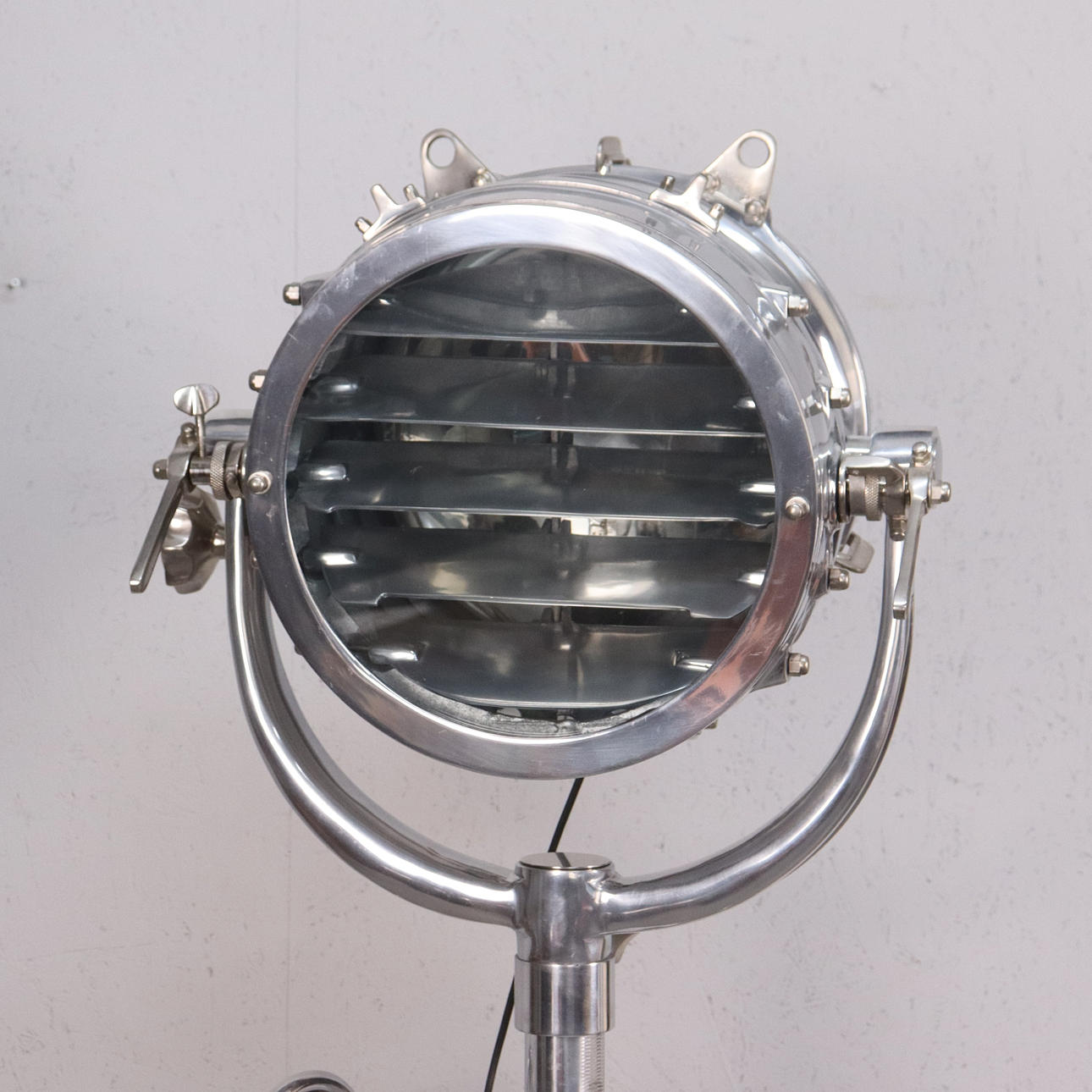 Sturdy floor lamp made of polished aluminium, adjustable tripod base and movable slats.