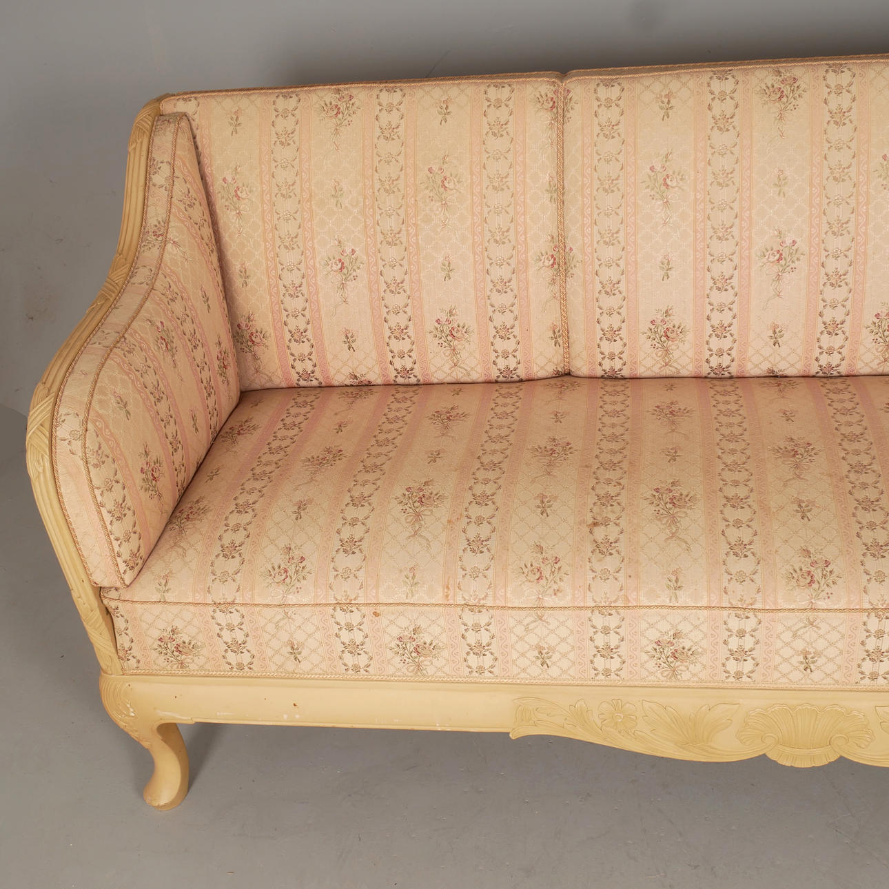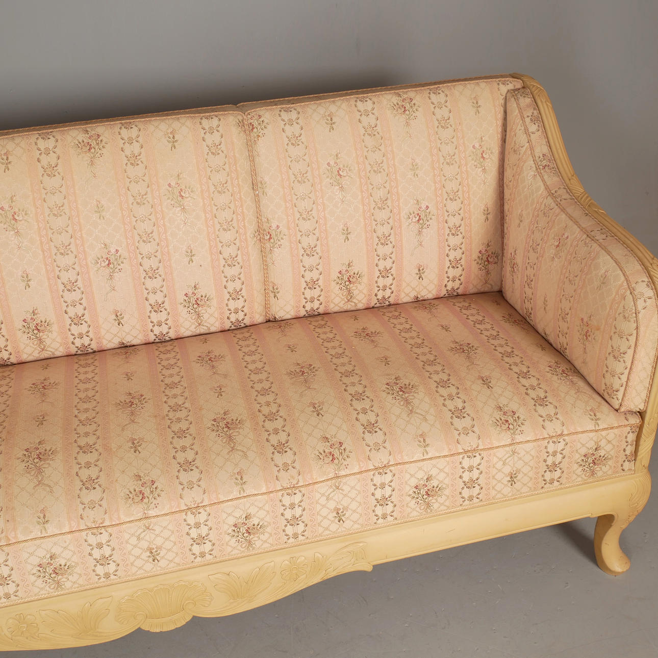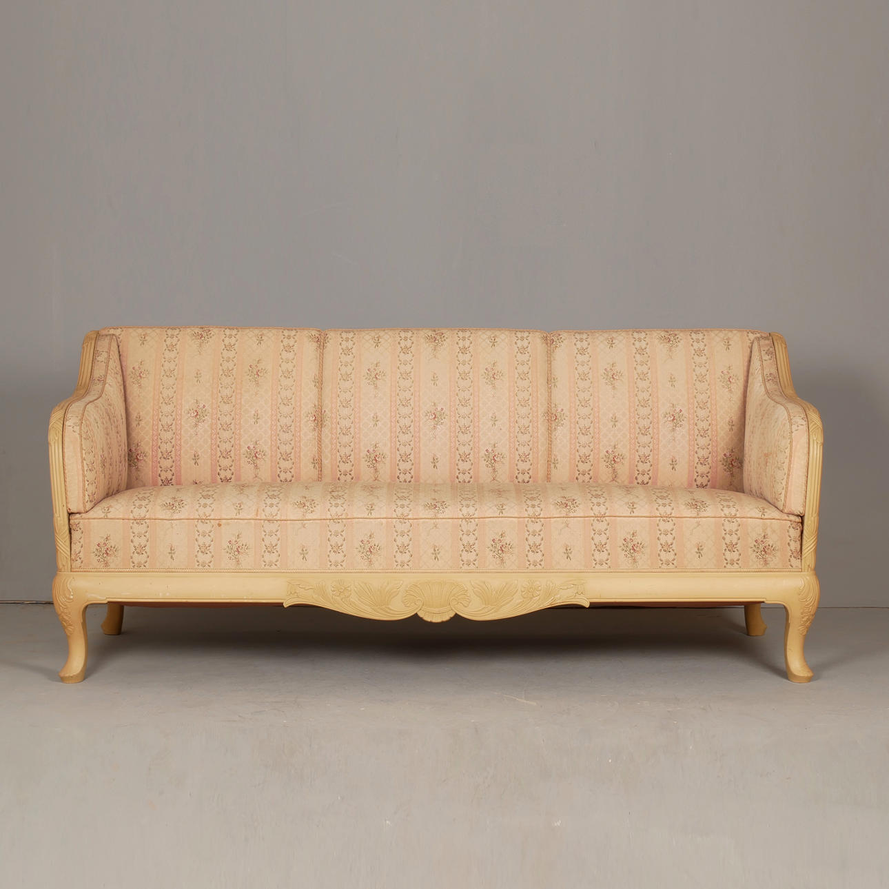 Length 193 cm, seat height approx. 45 cm, back height 85 cm, depth approx. 80 cm. Part of larger salon group with a total of 9 parts. Badge marked.
