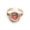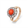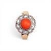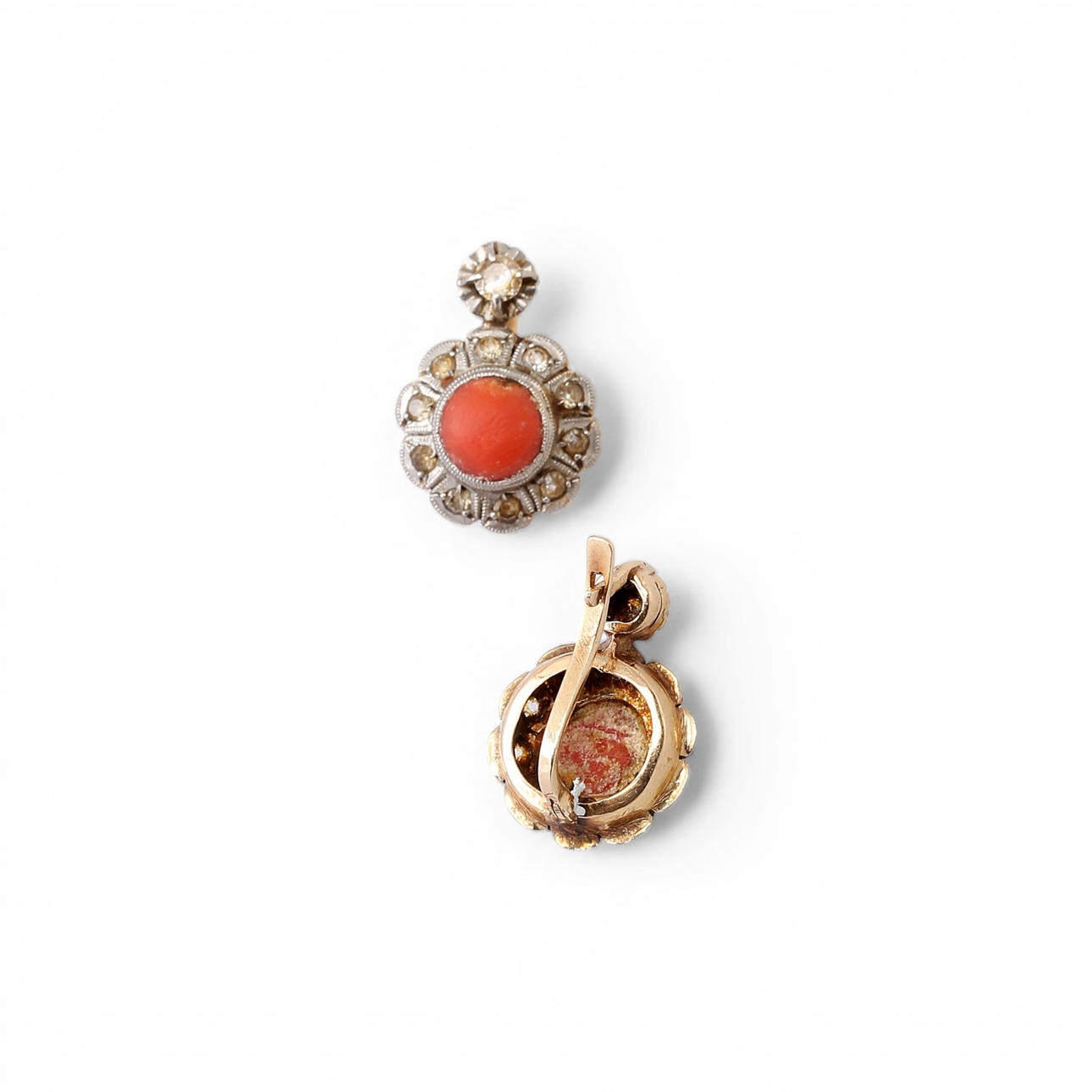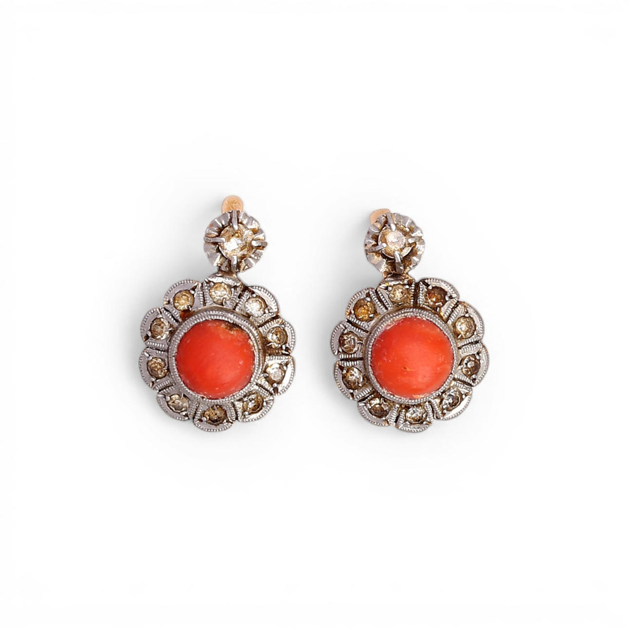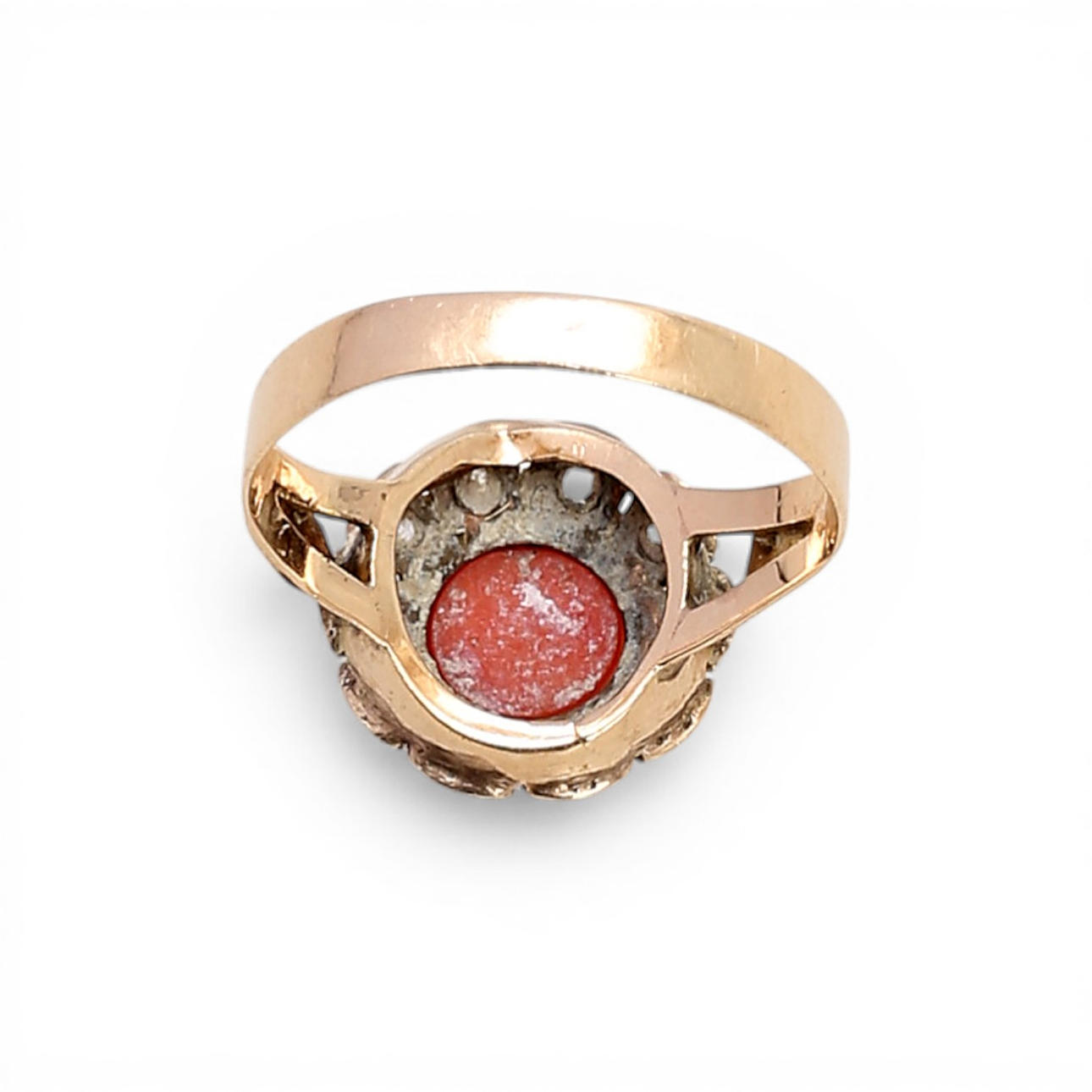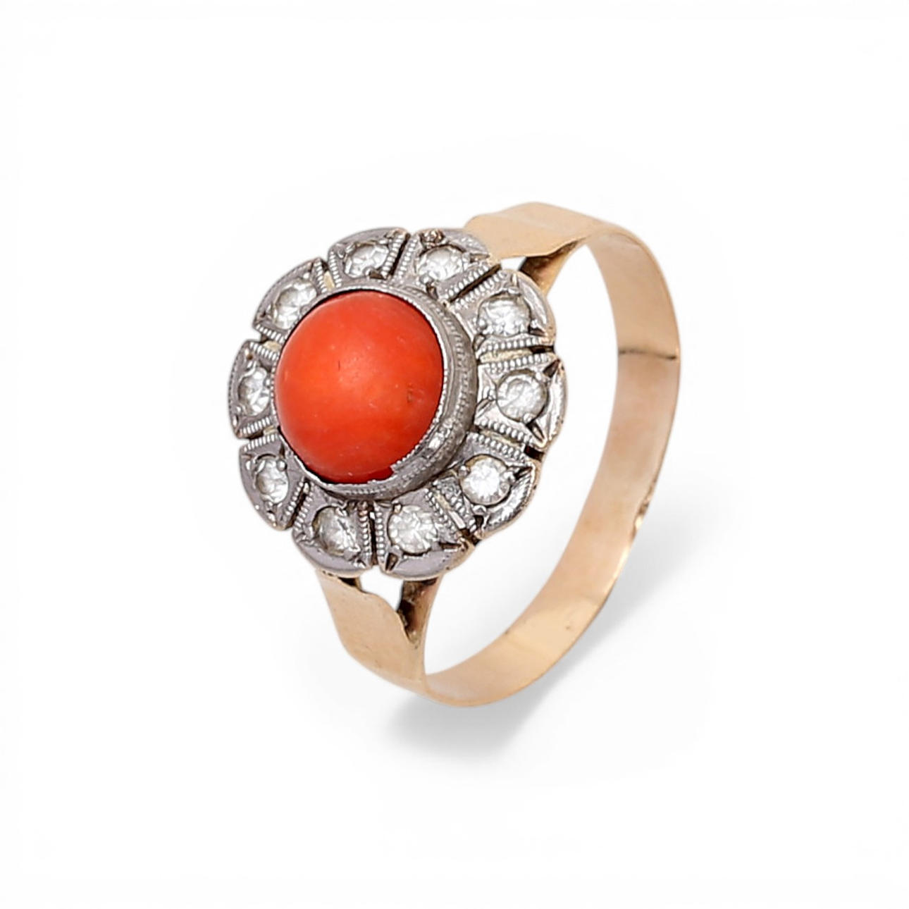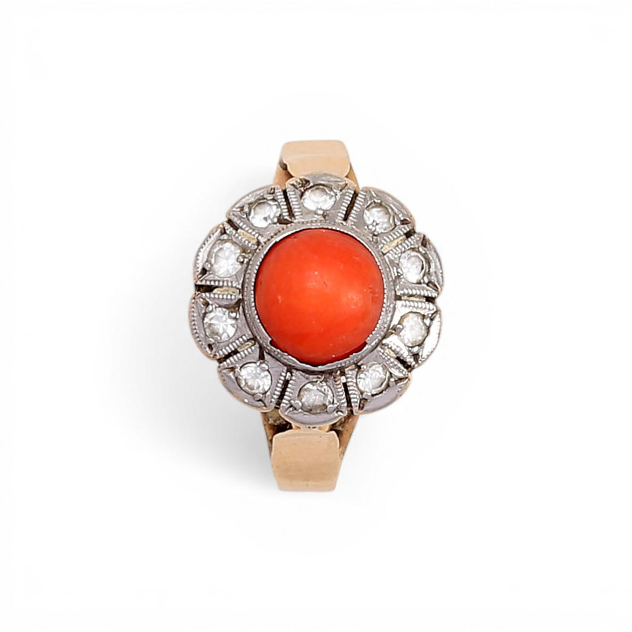18K gold and white gold, round cabochon-cut “corallium” coral and diamonds simile. Earrings: 1.6 cm. Ring size 11/51. 4.5 gr.