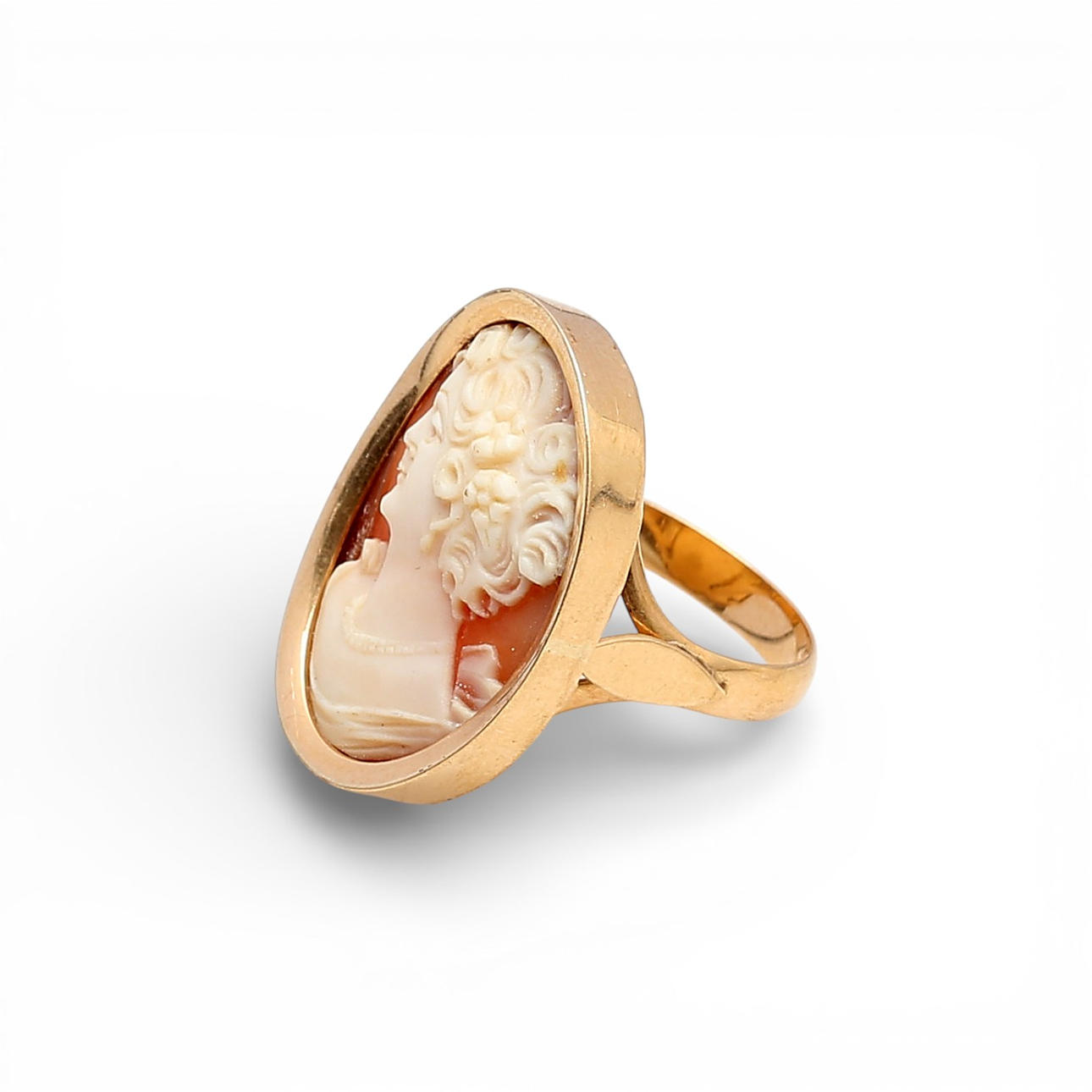 18K gold and carved shell cameo depicting a lady. Size 13/53. 6.8 gr.