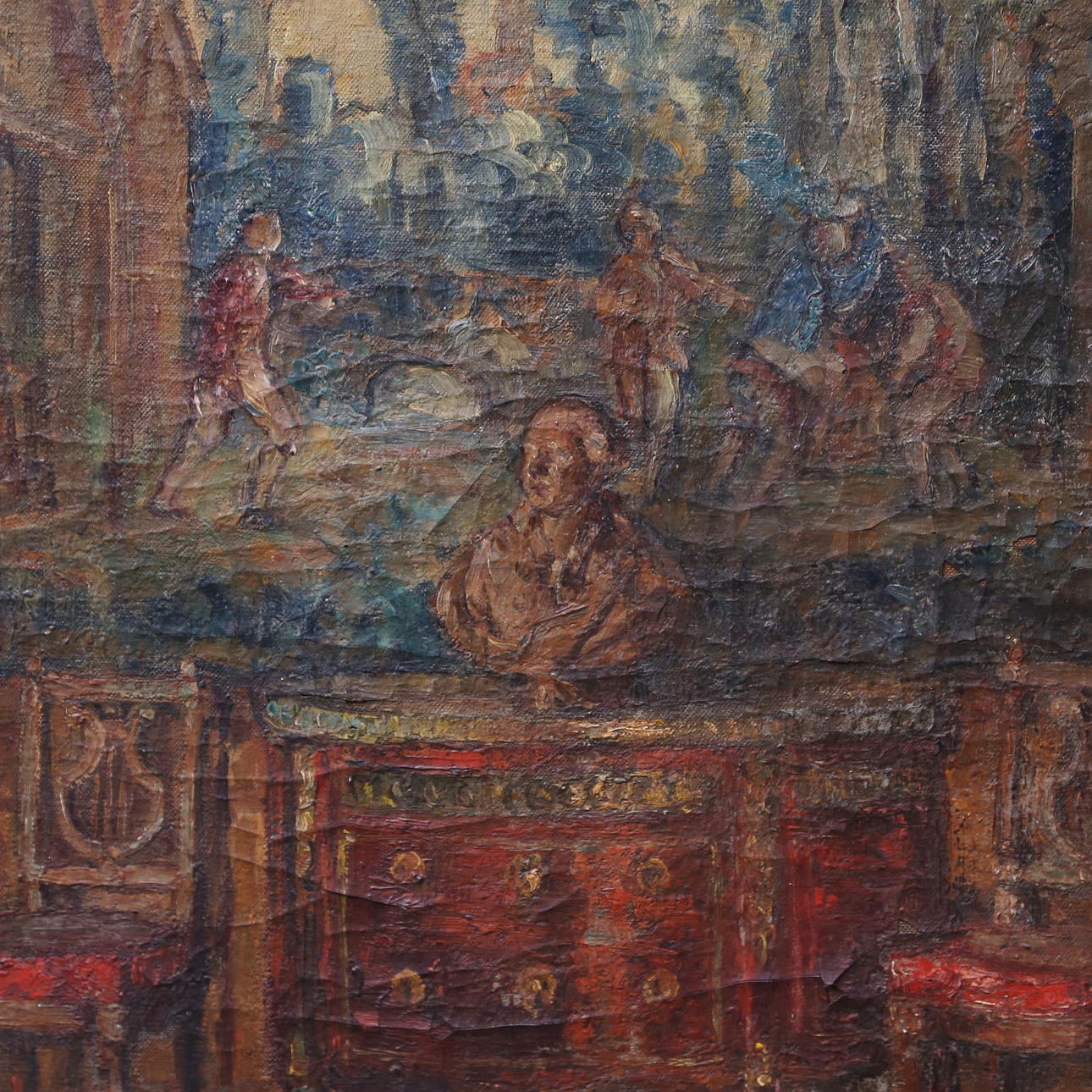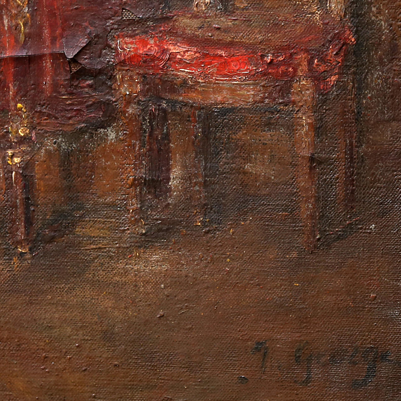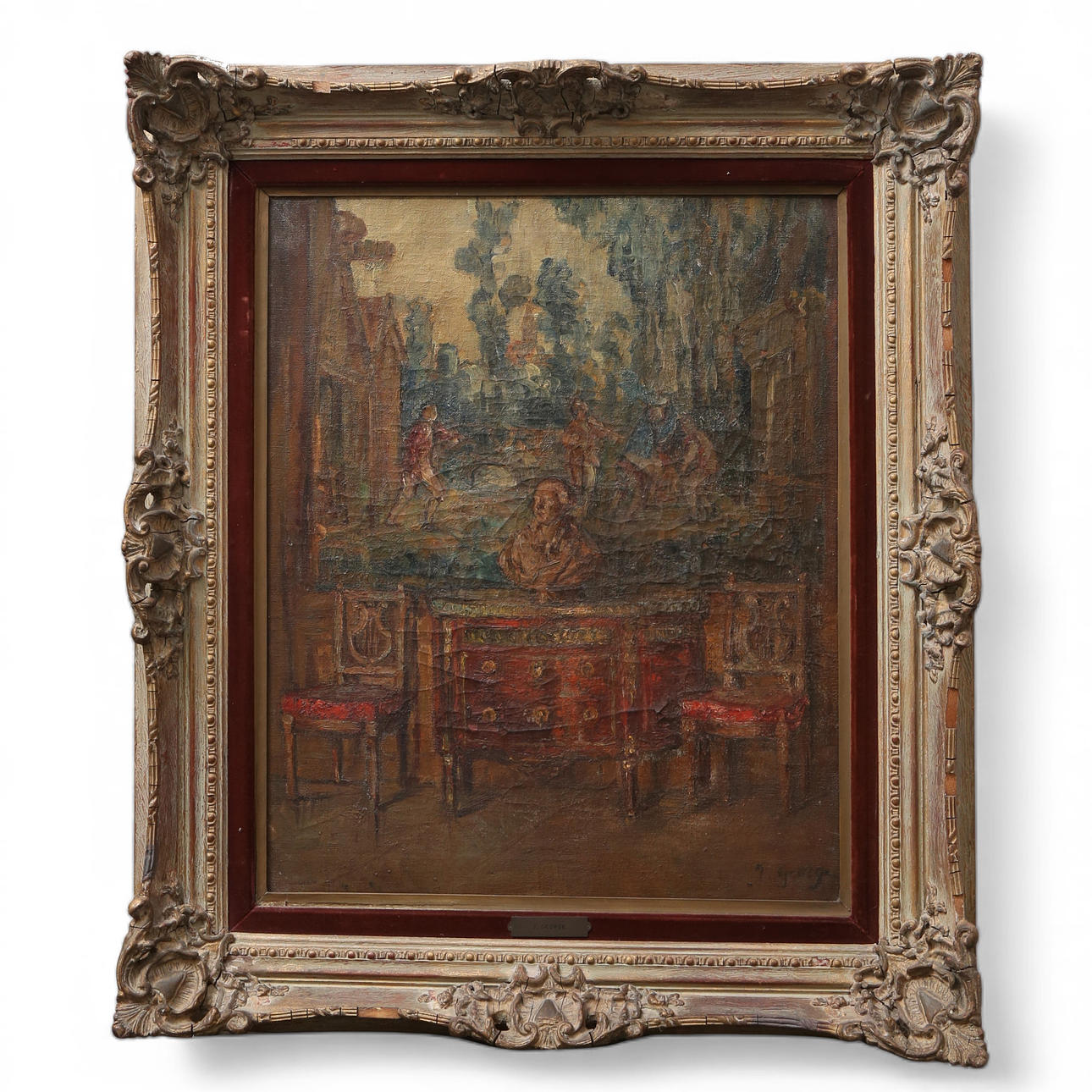 Juliette George, a French painter who died in 1966, is known for her detailed oil paintings of bourgeois interiors and floral scenes. She was a student of Jules Adler and exhibited regularly at the Salon des Artistes Français in Paris, where she won the silver medal in 1944 and later the gold medal.