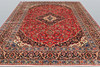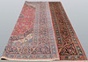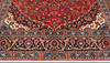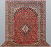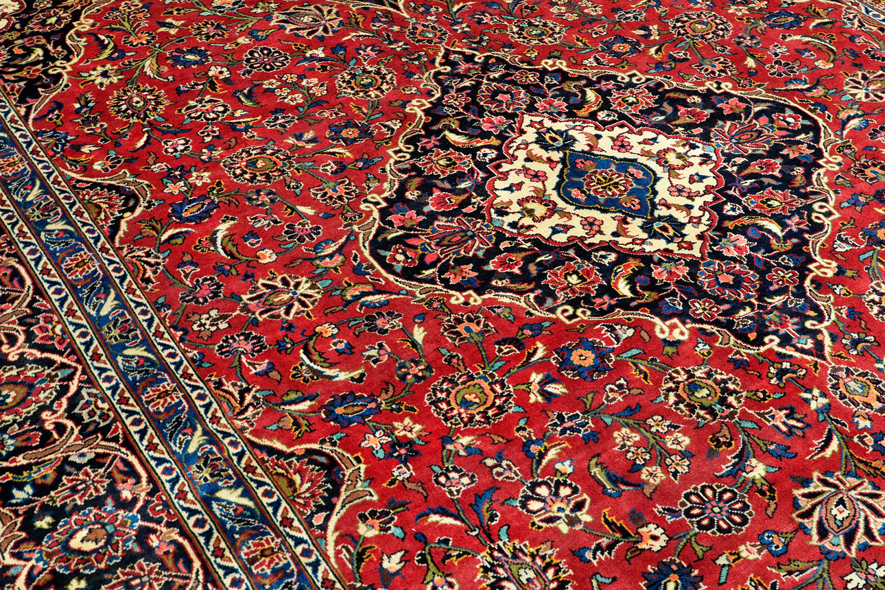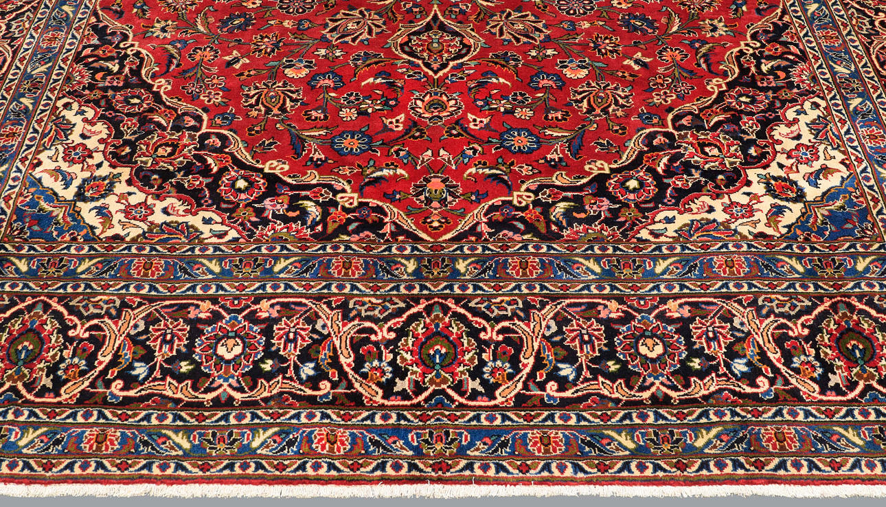Keshan with a red bottom color and a centrally placed medallion with details in blue, beige and green. The center field is covered in floral ornamentation, palmettes and arabesques in similar shades, and the corner portions follow the same pattern structure. The border has a dark bottom and consists of repeated palmette tendrils. The forelock is made of wool and the warp is of cotton.