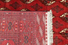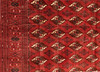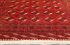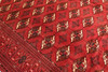 Turkeman with red ground colour and a repeated pattern of octagonal pools in dark red, black and beige tones. The border has a red base with geometric motifs in dark and light contrasts. The forelock is made of wool and the warp is of cotton.