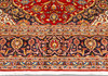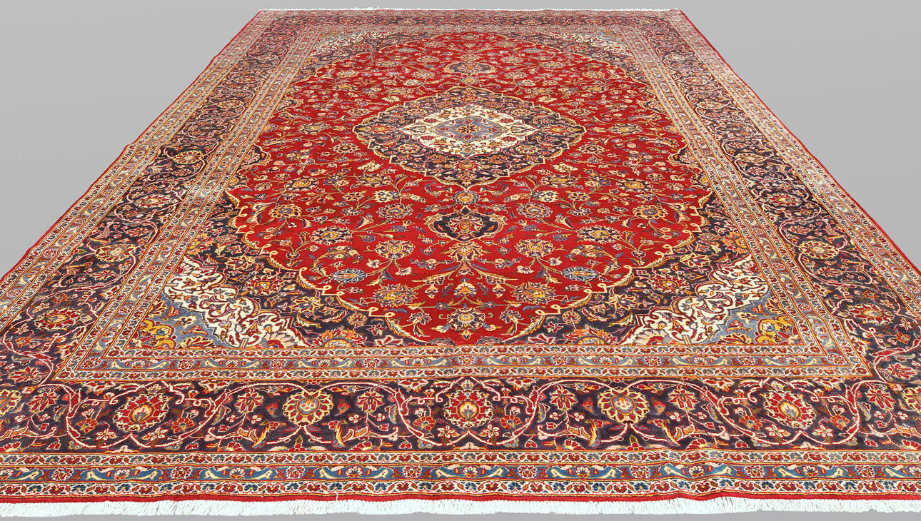 Keshan with a red bottom color and a centrally placed medallion with details in blue, beige and yellow. The center field is covered in floral ornamentation, palmettes and arabesques in similar shades, and the corner portions follow the same pattern structure. The border has a dark bottom and consists of repeated palmette tendrils. The forelock is made of wool and the warp is of cotton.