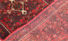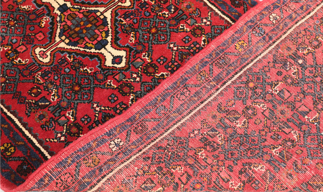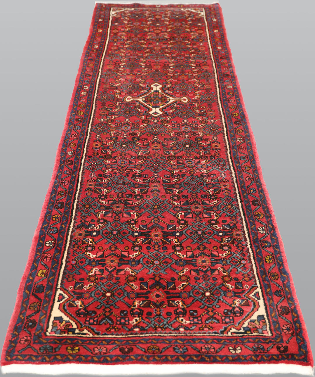 Hamadan gallery model with red base color and a geometric medallion in dark blue, beige and red tones. The center field is dominated by repeated rhombus and cross motifs in symmetrical order. The border has a red base and additional geometric decor. The forelock is made of wool and the warp is of cotton.