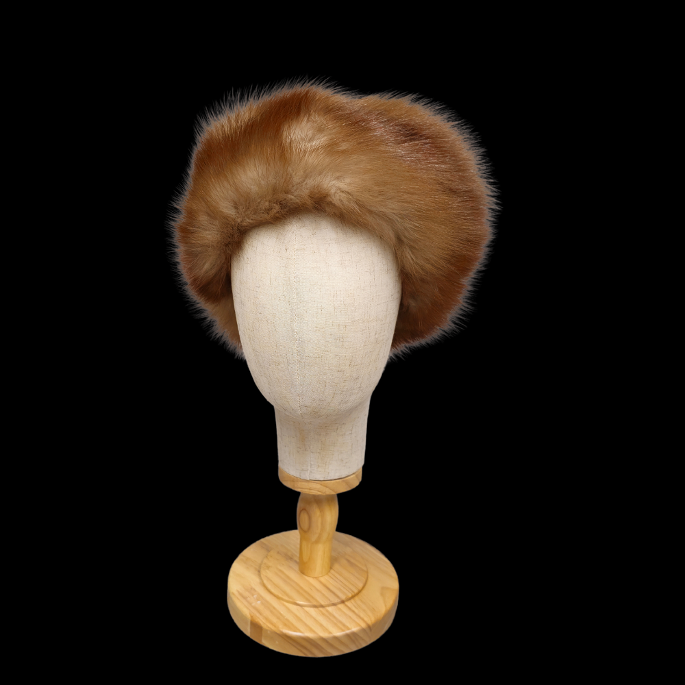 CHOCOLATE-COLORED MINK LEATHER HAT.