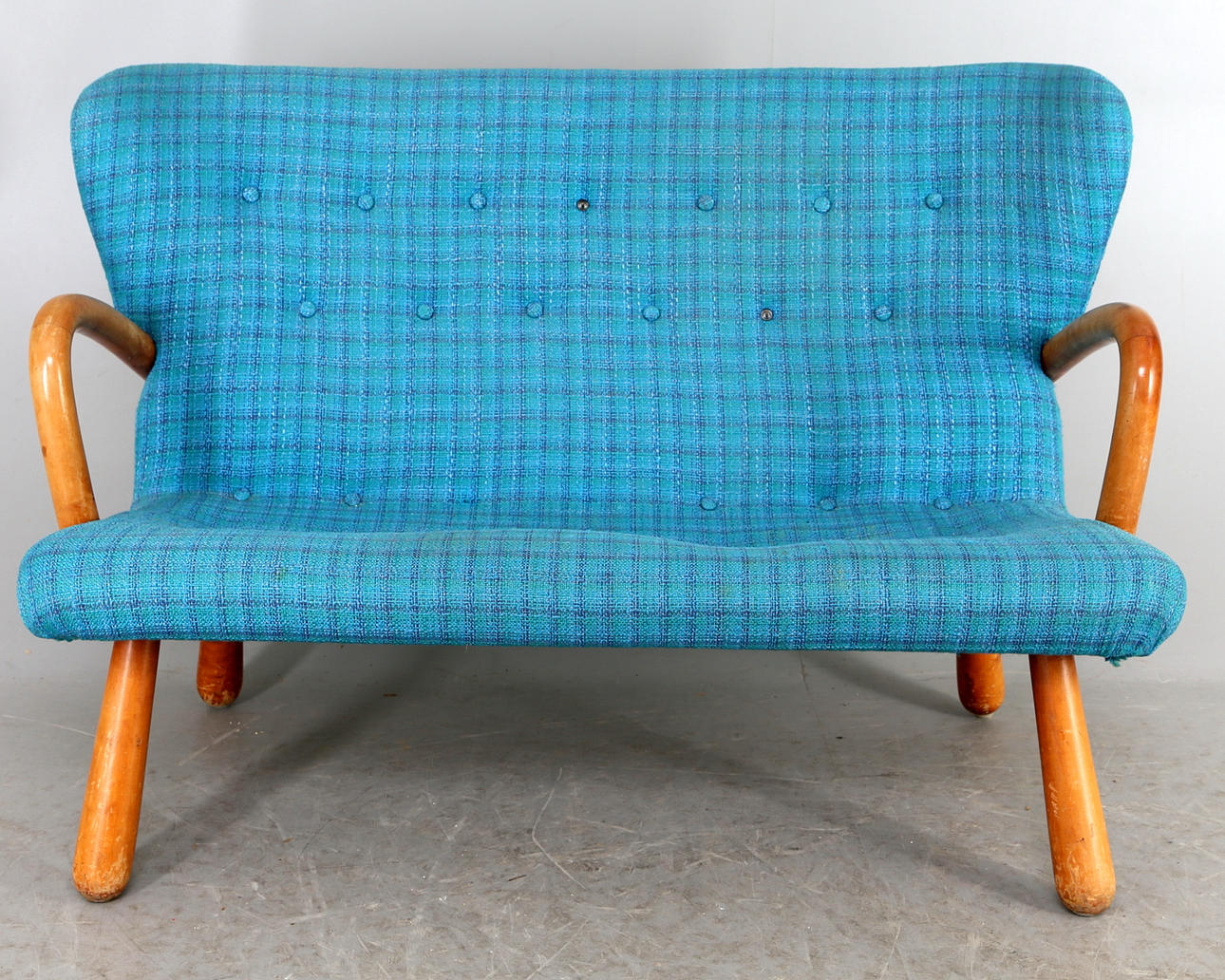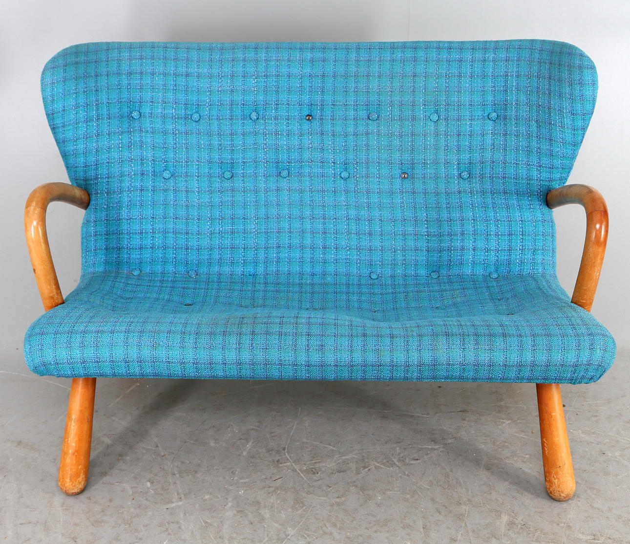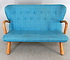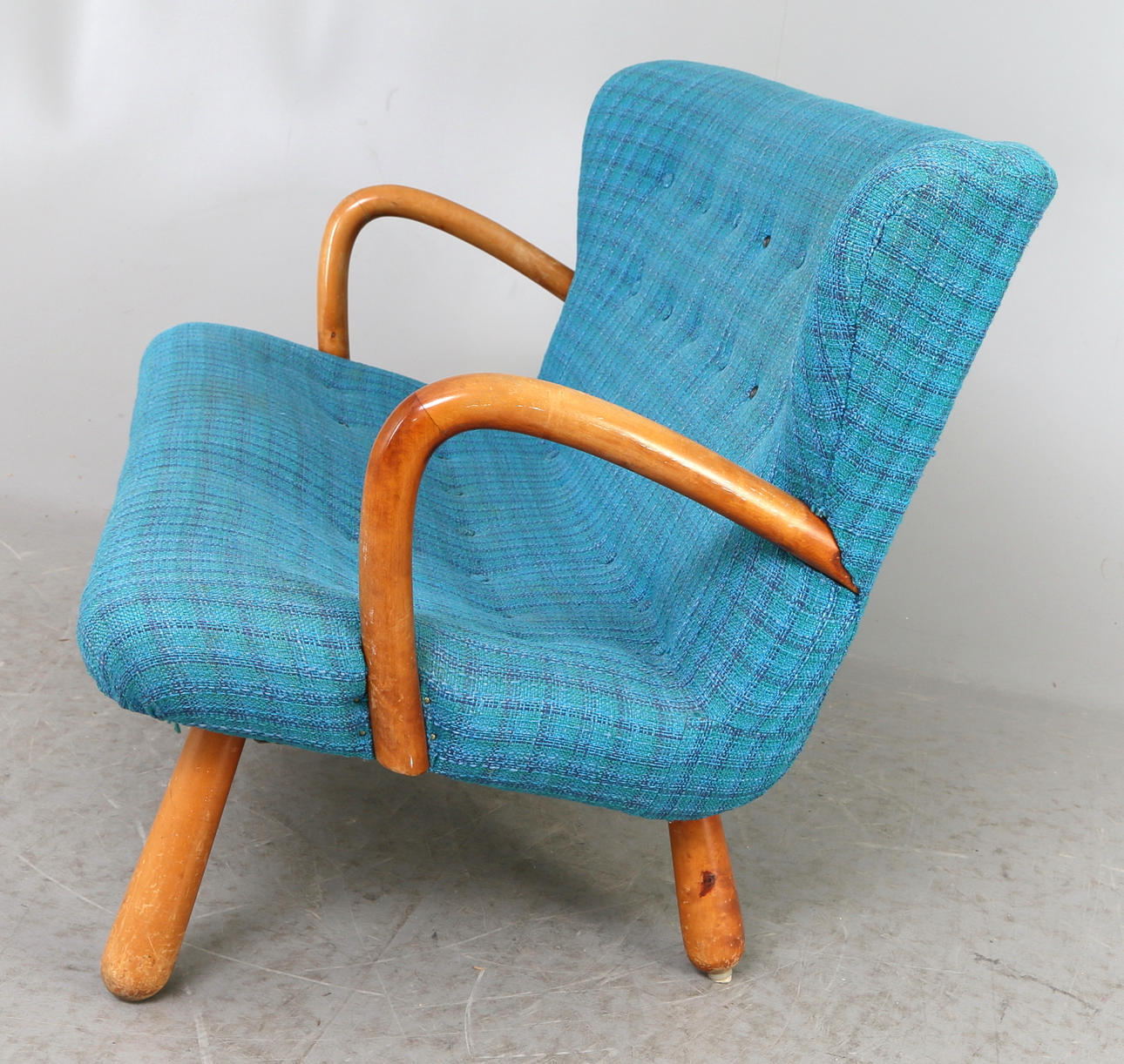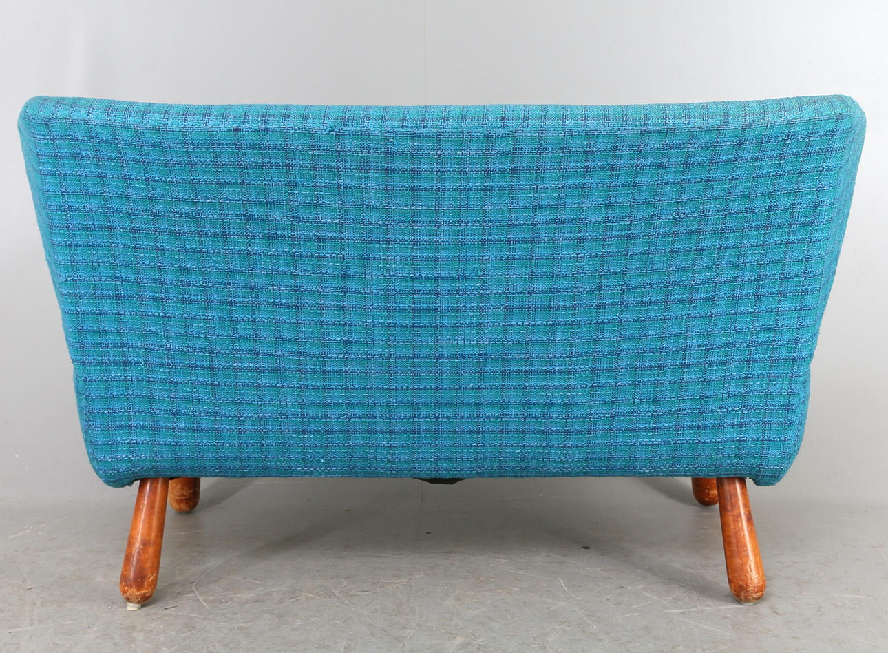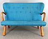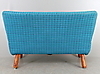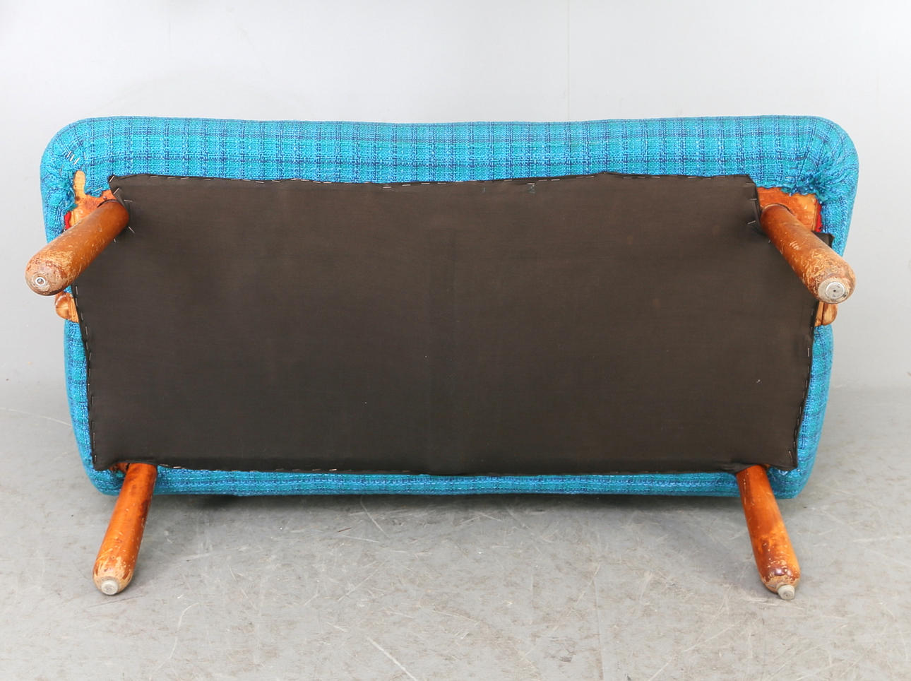 Red original fabric underneath. Reportedly purchased at IKEA in the 1950s. Back height 79cm. Length 116. See also armchair Ikea.