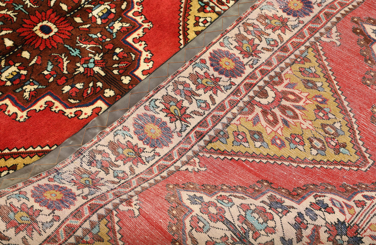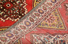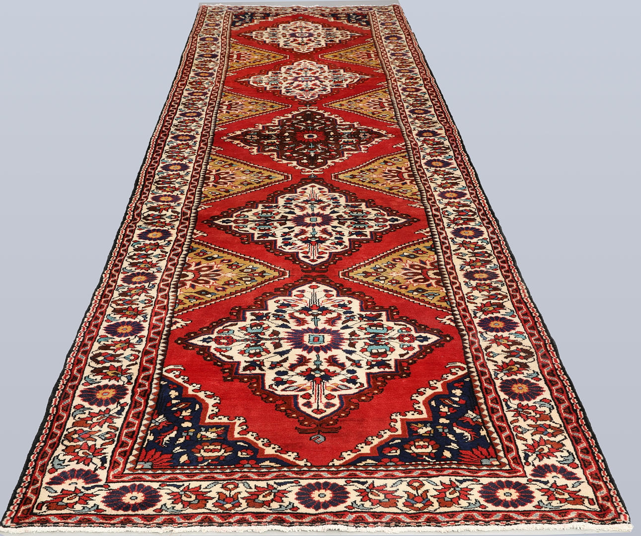 Hamadan gallery model with red base color and a vertically repeated row of rhombo-shaped medallions in beige, blue and brown tones. The center field is decorated with geometric and stylized floral motifs in symmetrical repetition. The border has bright bottom with additional floral and geometric ornamentation. The forelock is made of wool and the warp is of cotton.