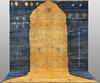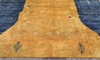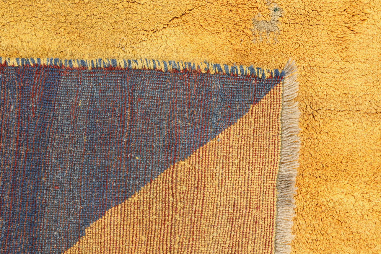 Figural Gabbeh with yellow and blue base color as well as decor of small stylized animal and plant forms in light and blue tones. The forelock is made of wool and the warp is of cotton.