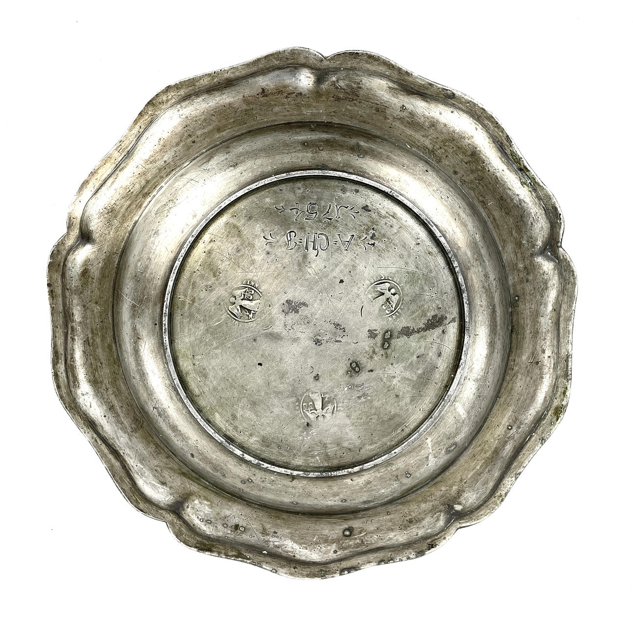 Tin barrel, three stamps and engraved underneath “A.CH.H 1754". Diameter approx. 23 cm, height 3,5 cm.
