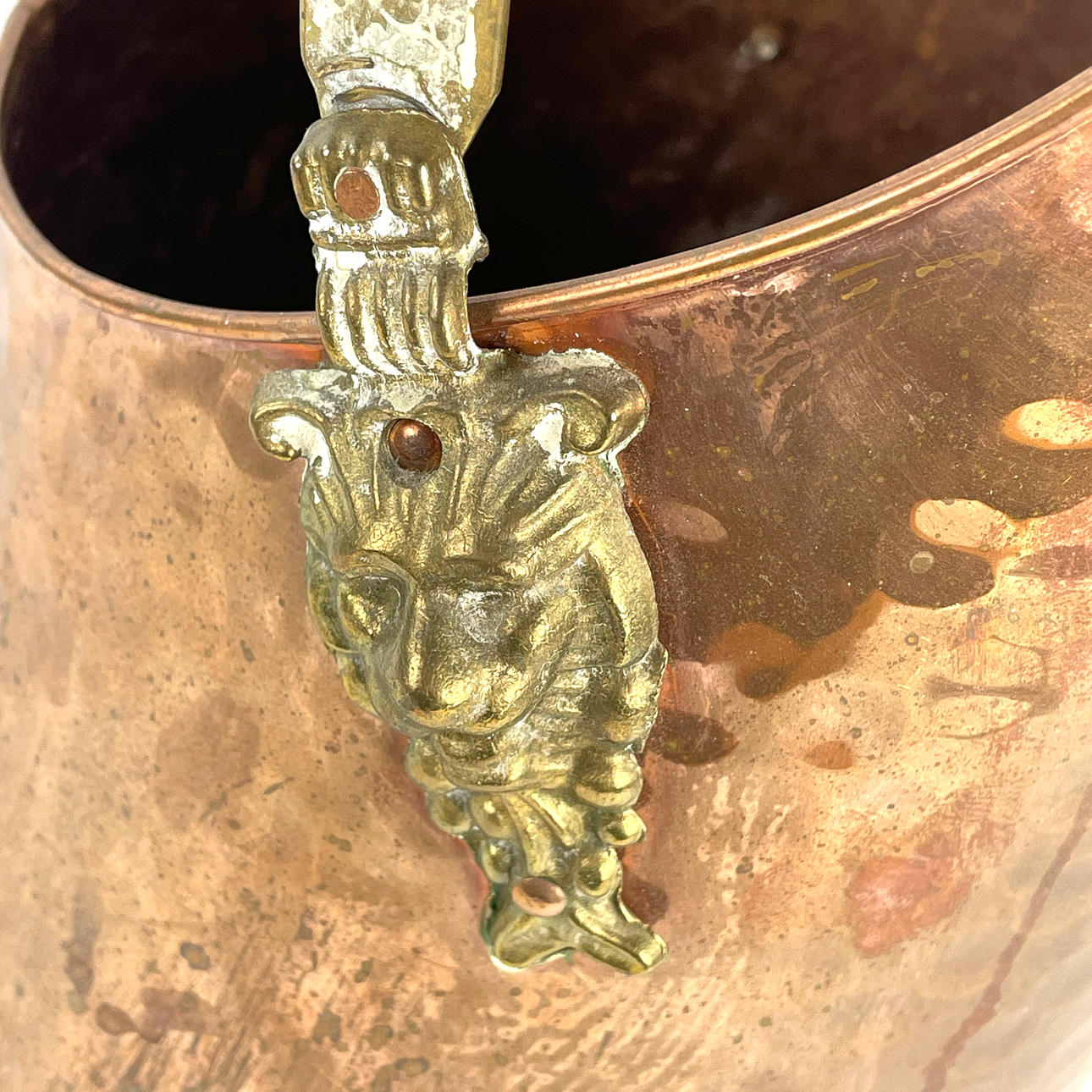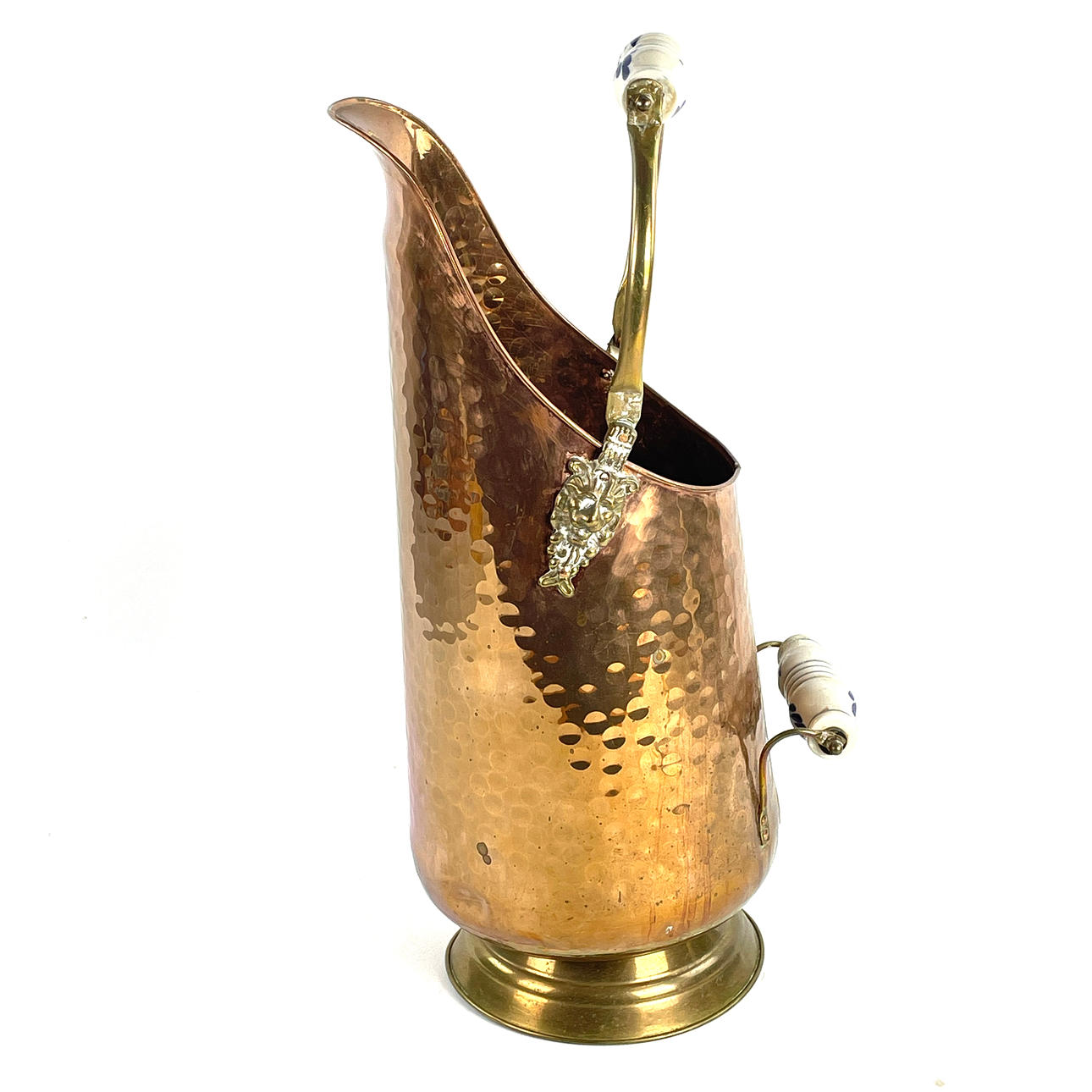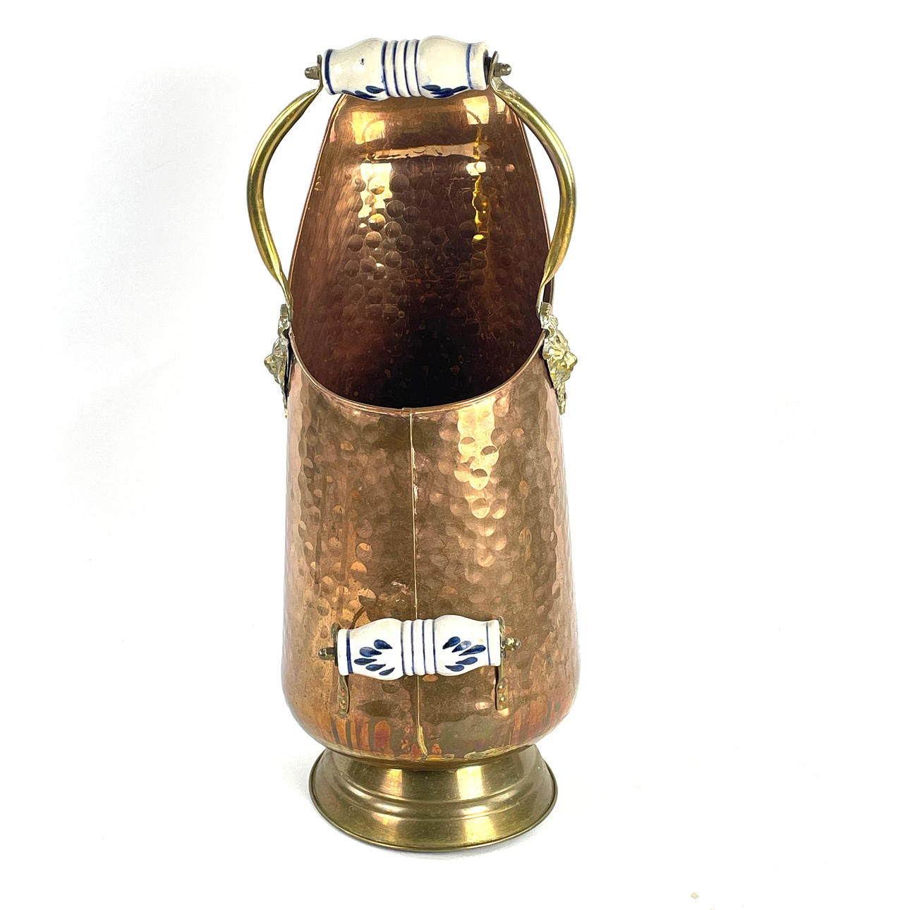 Charcoal catcher in hammered copper, with brass lion mascarons and handles in blue-white porcelain.