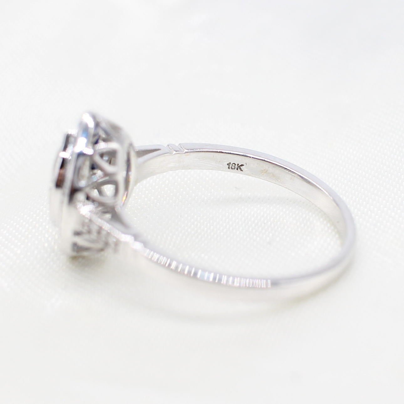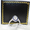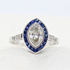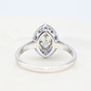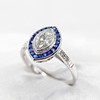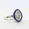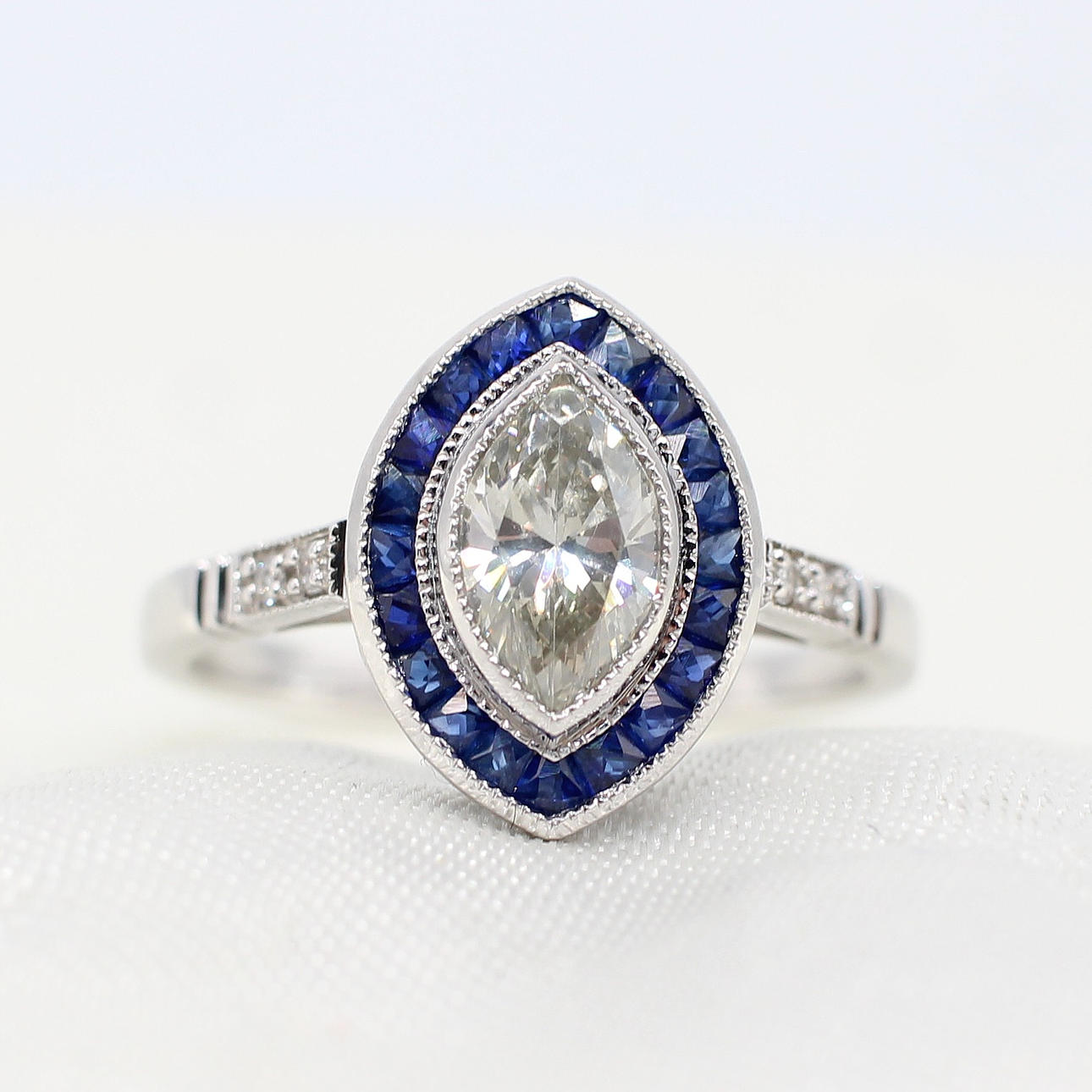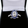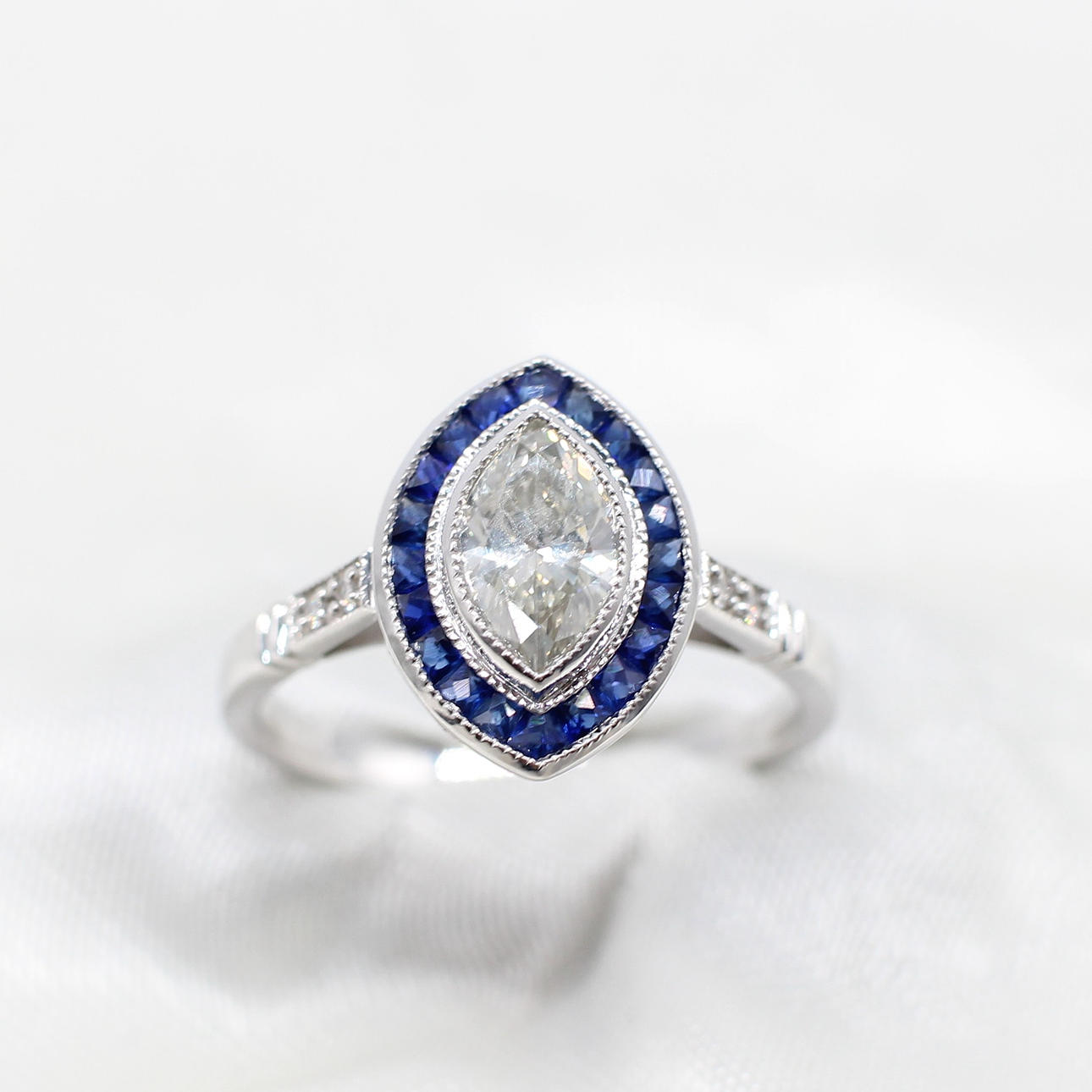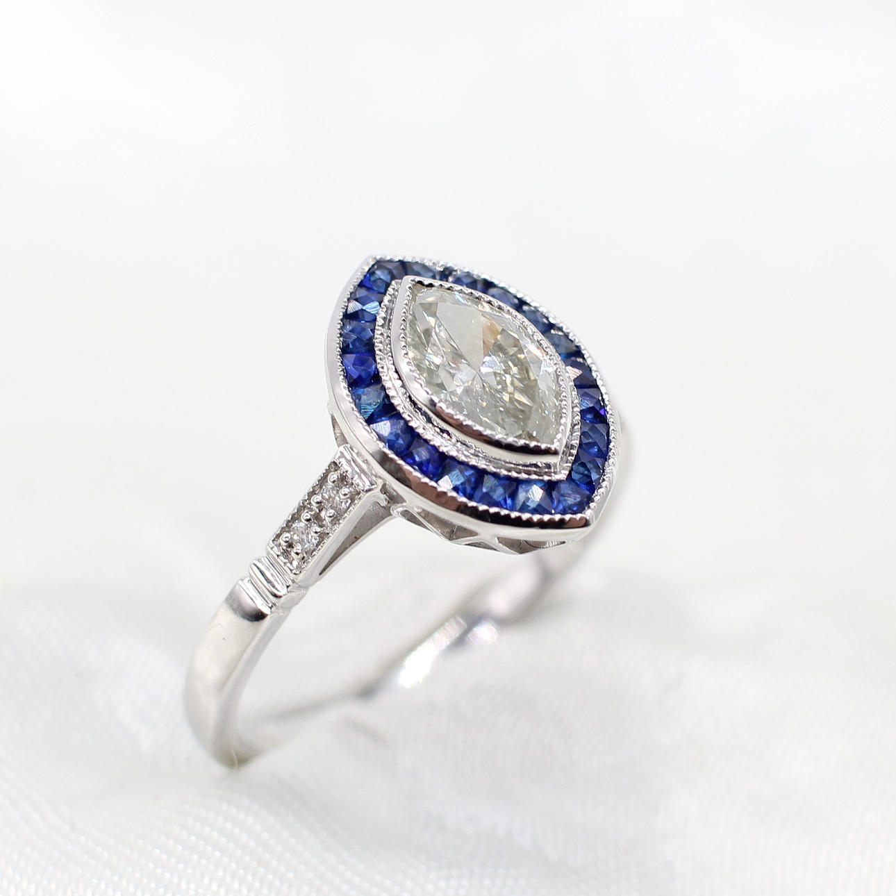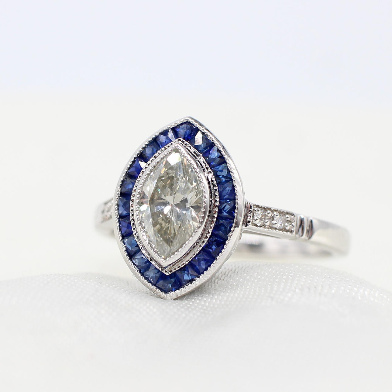 An 18K (stamped, tested as 18K) white gold marquise shape ring set with a central marquise diamond surrounded by calibre cut sapphires and further diamonds to the shoulders.