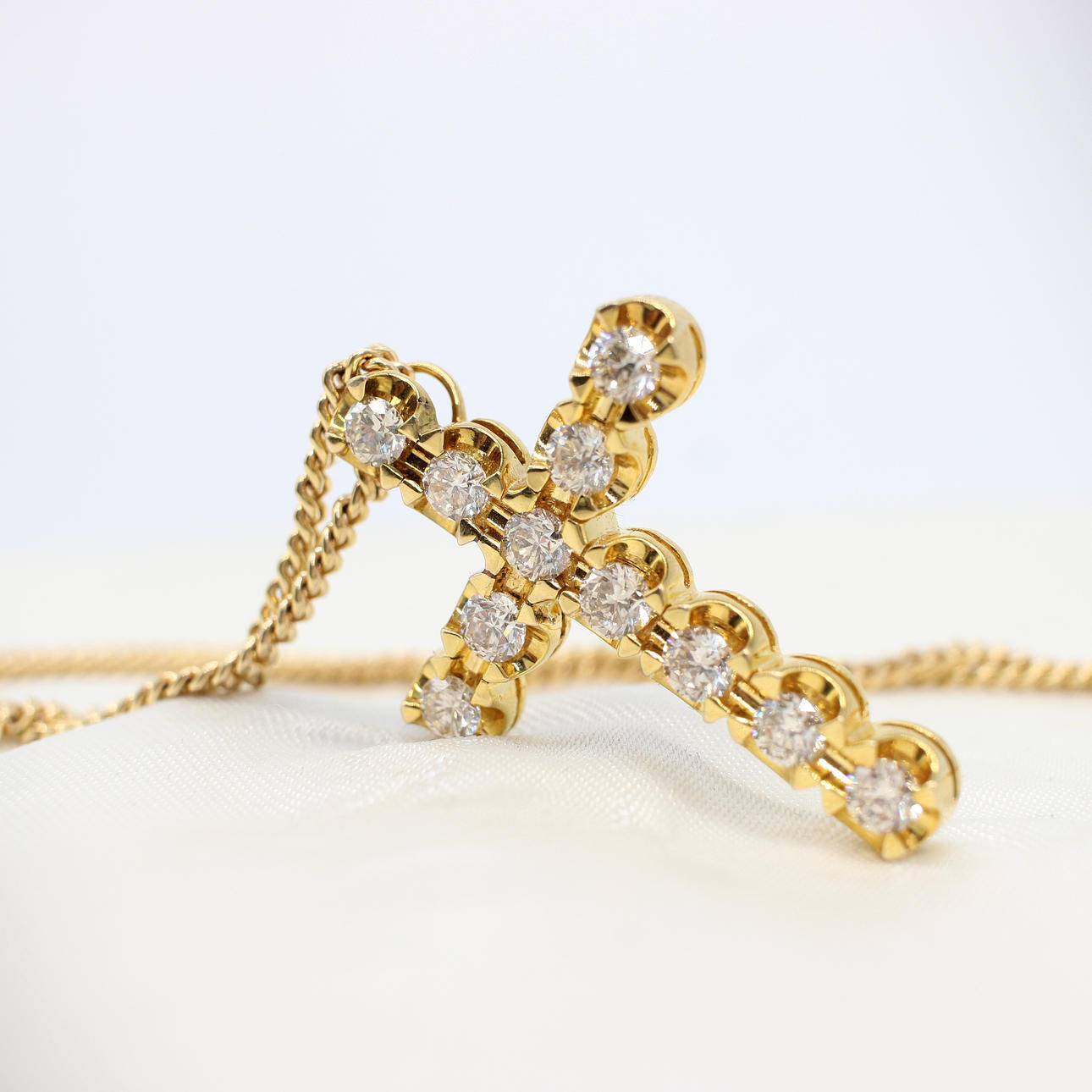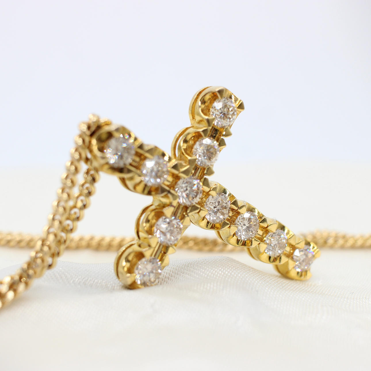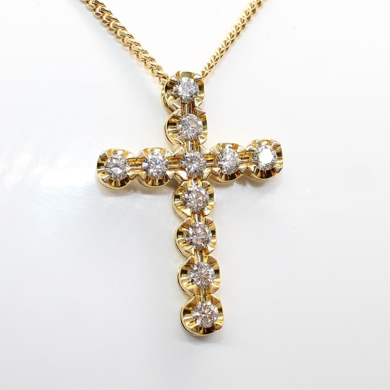 A large stunning 11 x Individual round brilliant cut diamond set cross pendant and chain in 9k yellow gold (stamped 375) totalling 2.70 carats and weighing 17.10gm collectively.