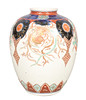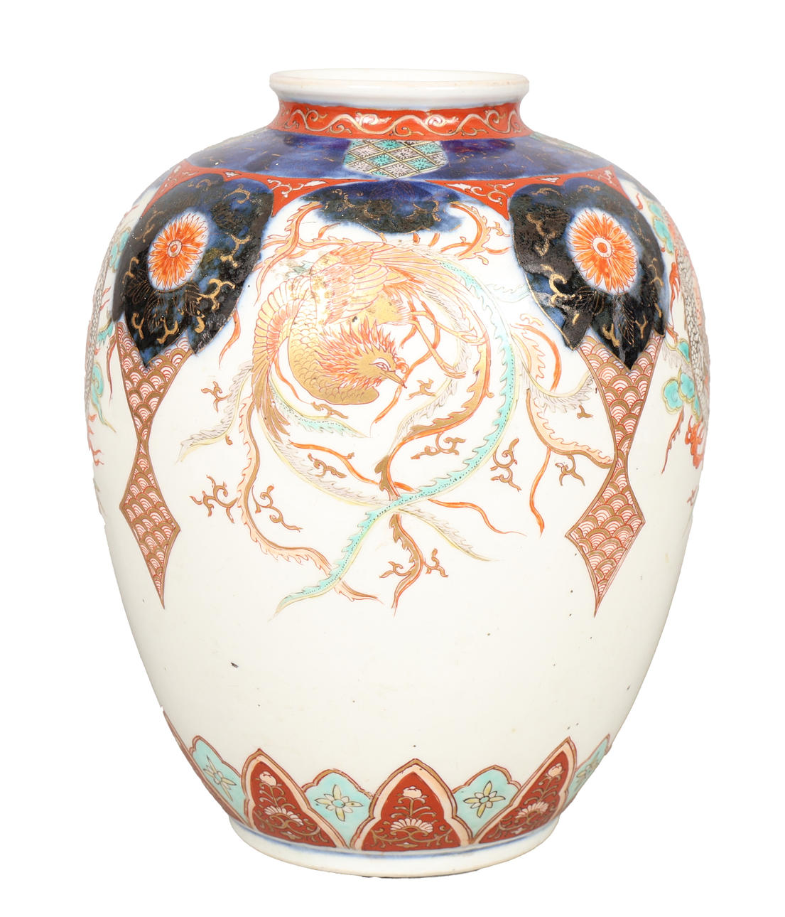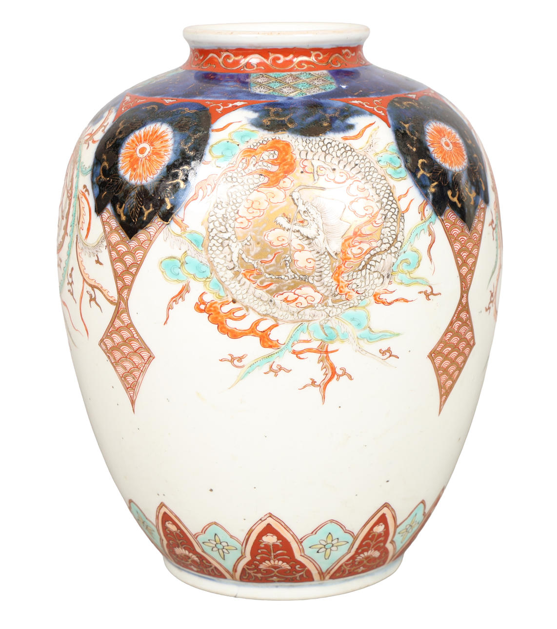 The vase with imari decorated shoulders above four cartouches containing depictions of dragons and phoenixes, 25cm high, 20cm diameter.