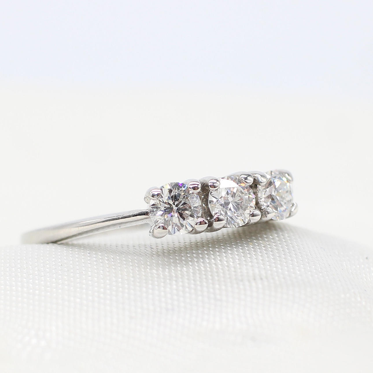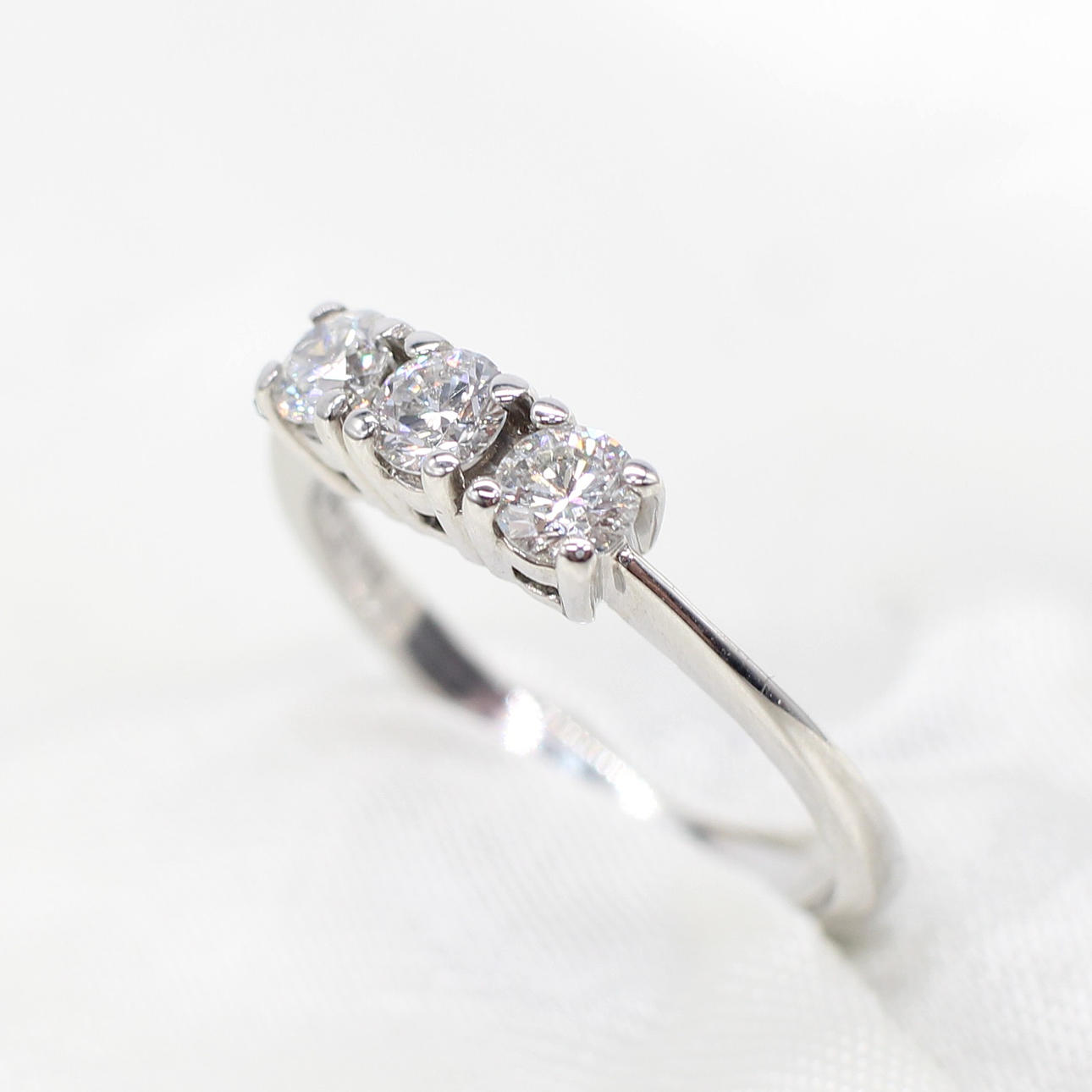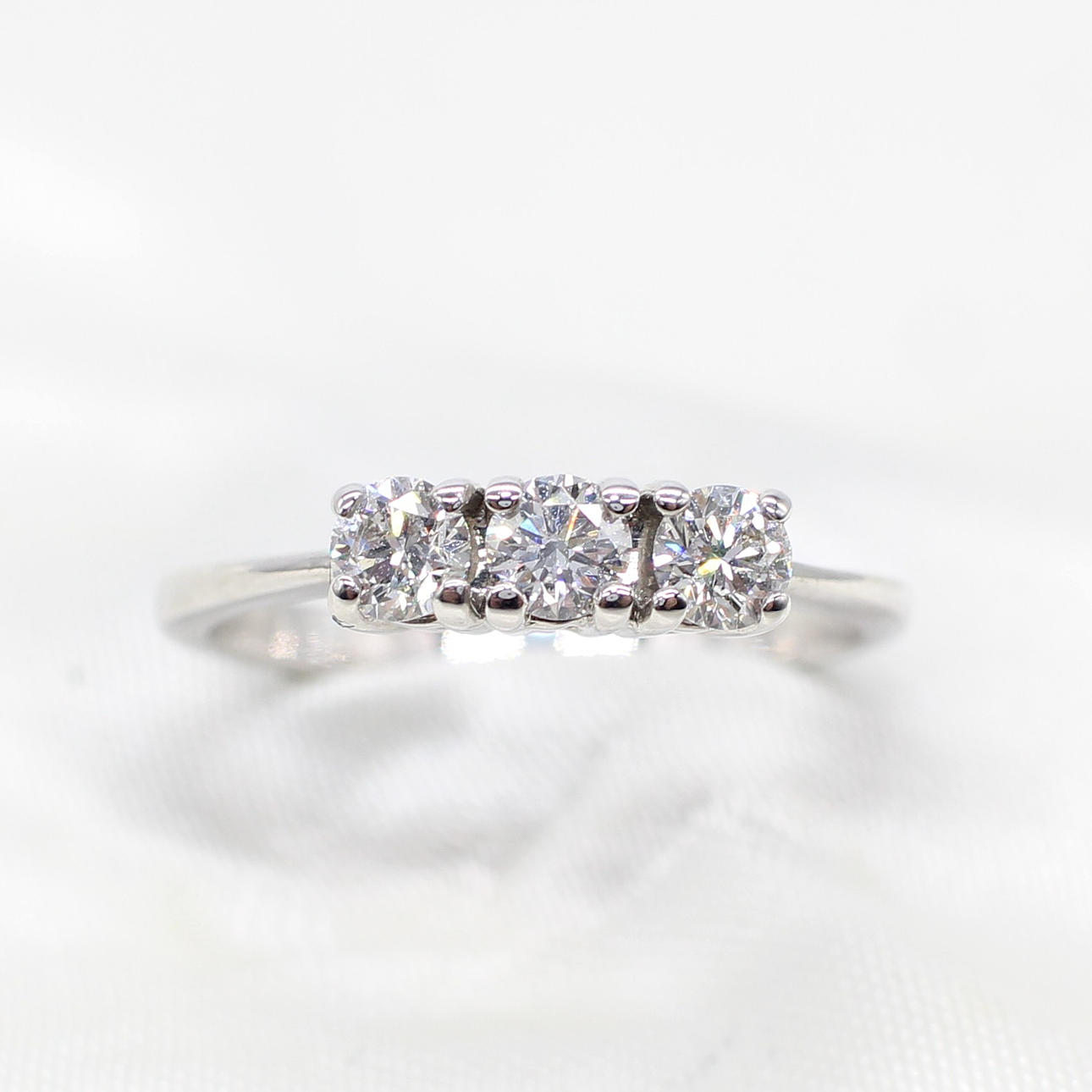 An 18K white gold (hallmarked) round brilliant cut diamond trilogy ring.