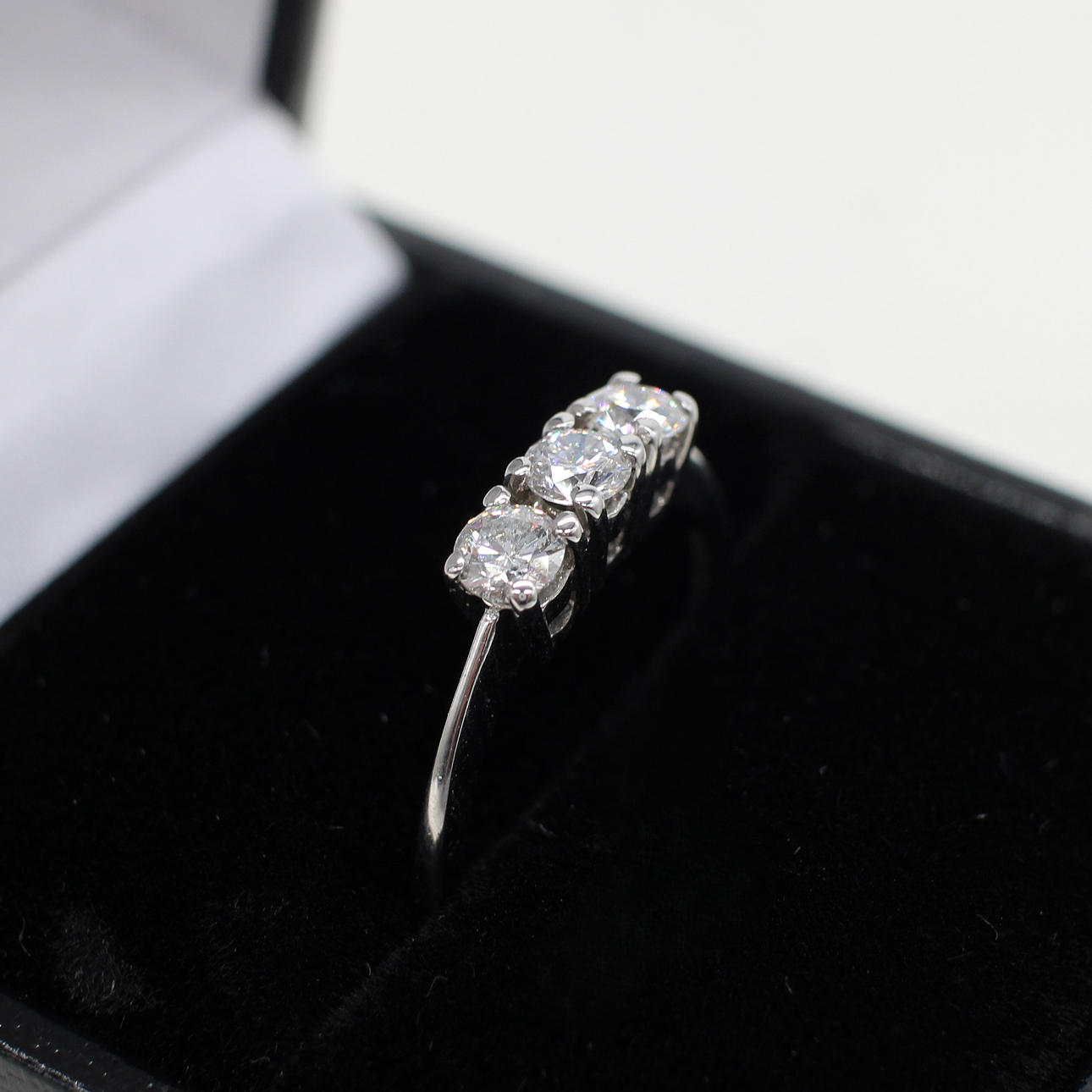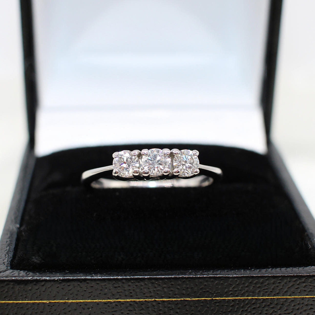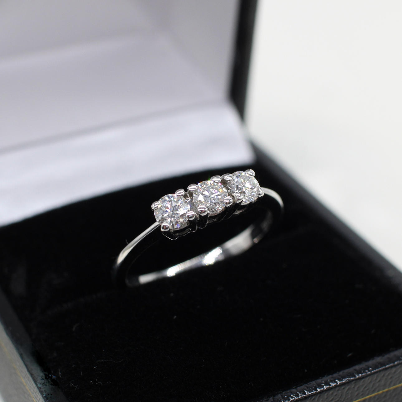 An 18K white gold (hallmarked) round brilliant cut diamond trilogy ring.