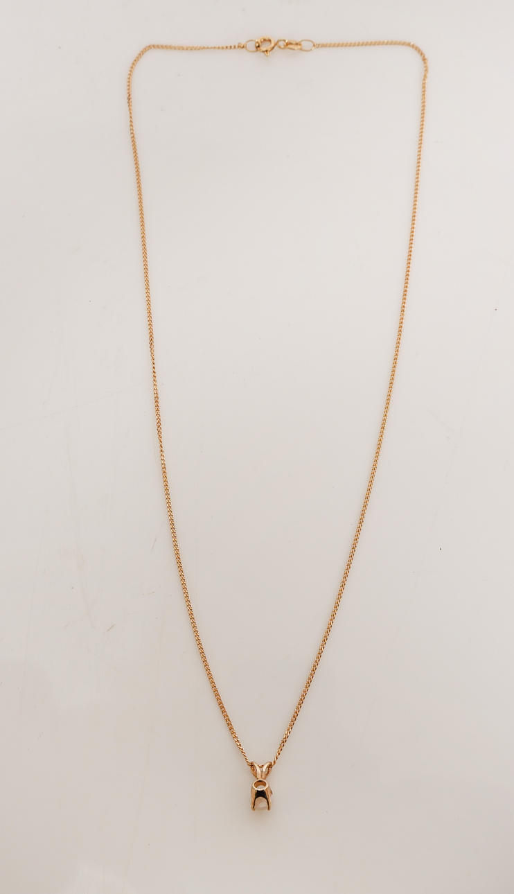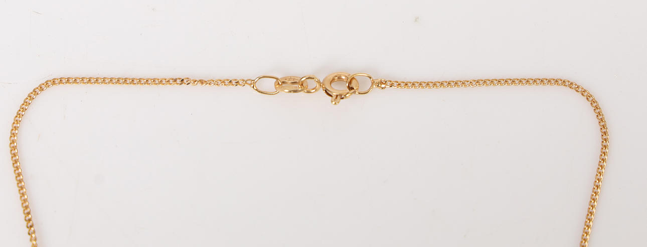 Suspended from a 9ct yellow gold fine chain. Length 16". Chain has a UK hallmark.