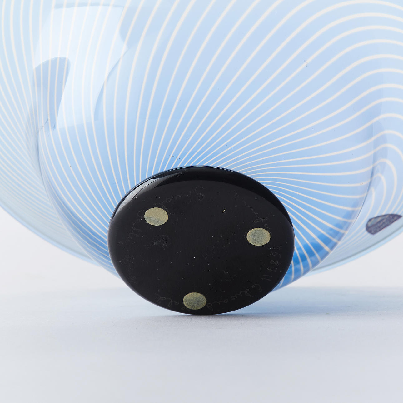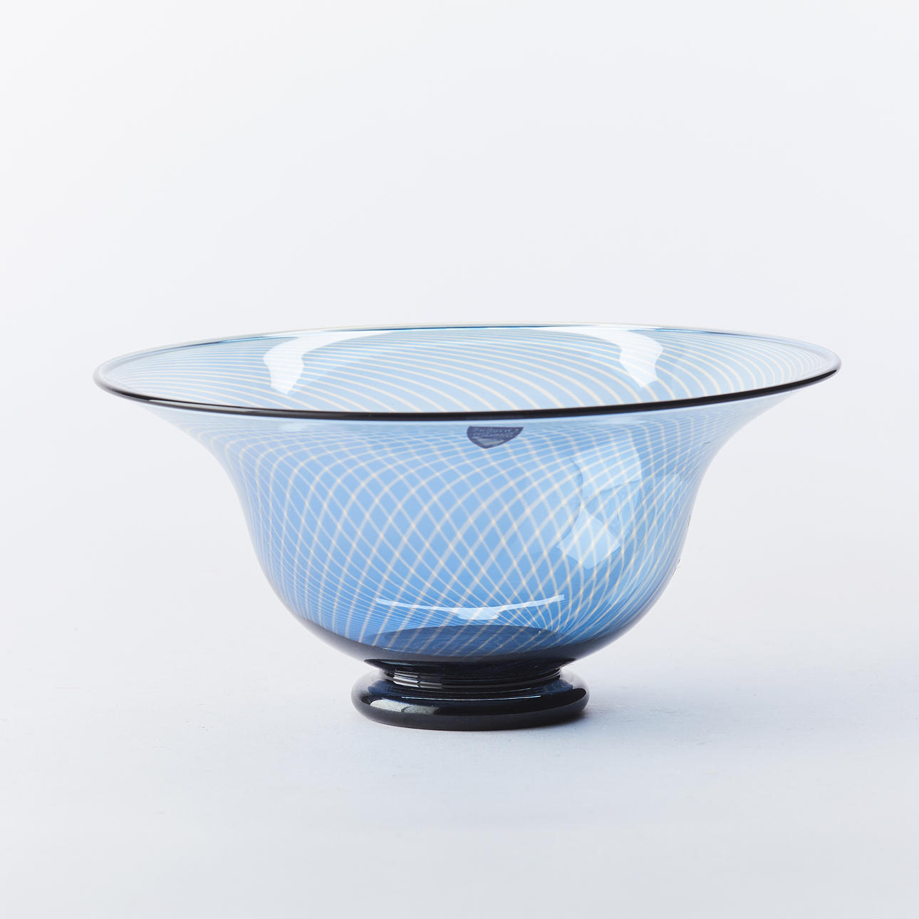 Signed Orrefors 958711 Edward Hald Grail Gallery 48-86. Decor of blue stripes. Slipgrail. H 8,5, Ø 18 cm.