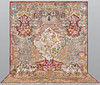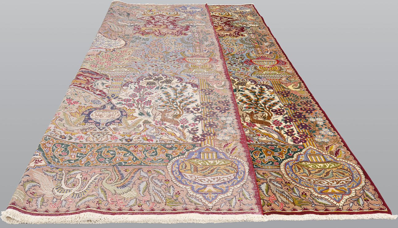 Figural Kashmar with a motif depicting a richly decorated garden scene. The midfield is dominated by an area with trees, plants, birds and animals in various positions. Around this field is a myriad of details where deer, birds, horses and architectural elements such as pavilions and fountains recur.