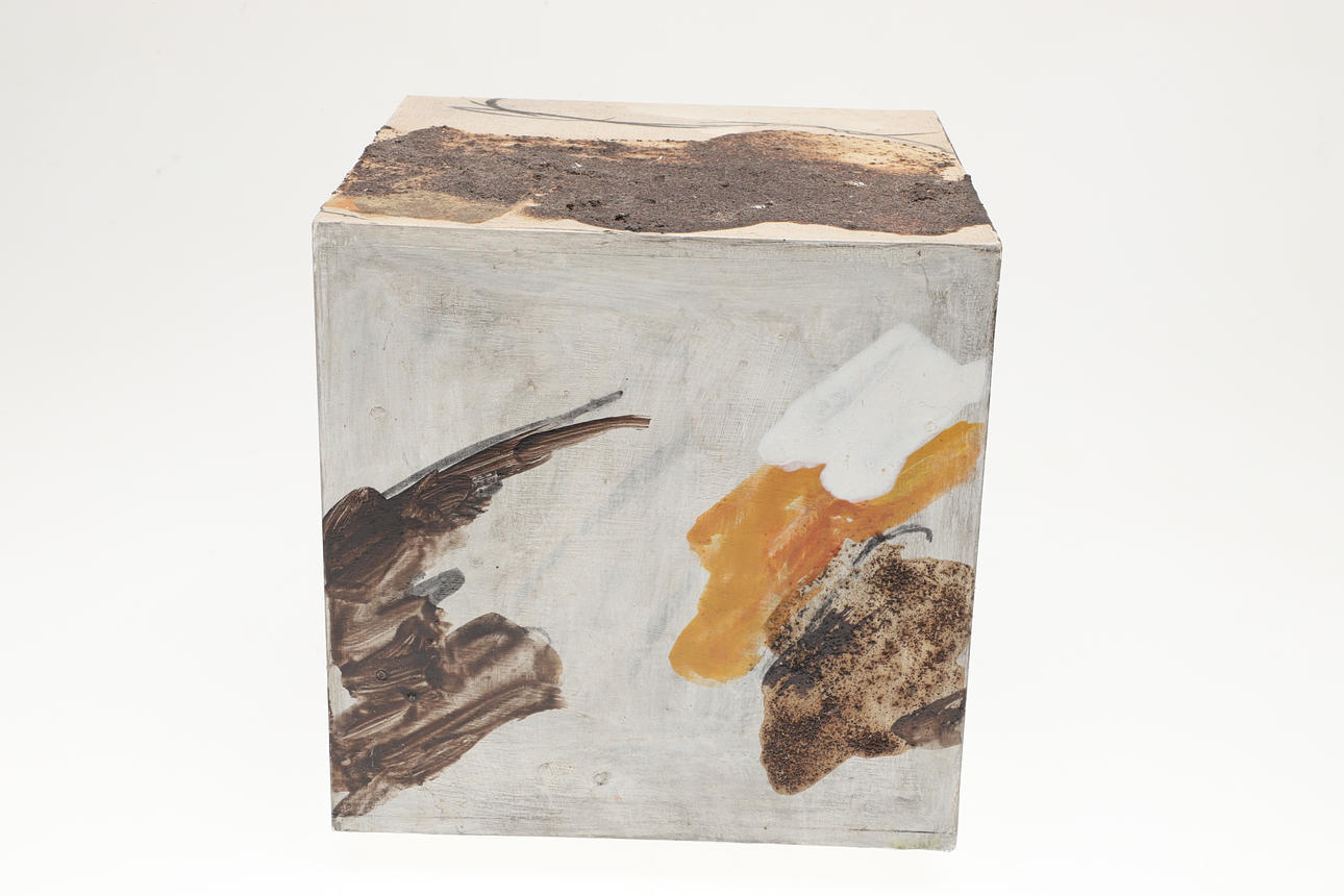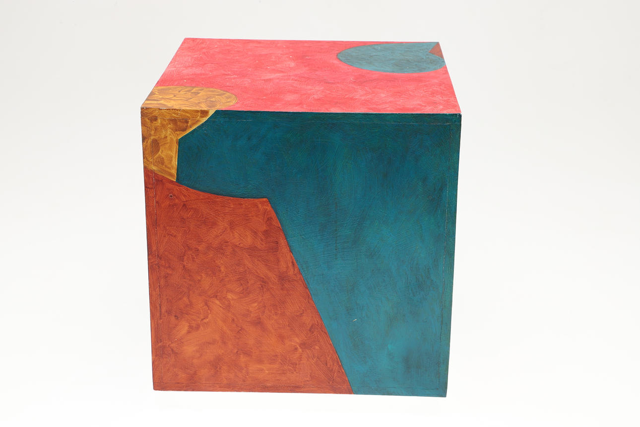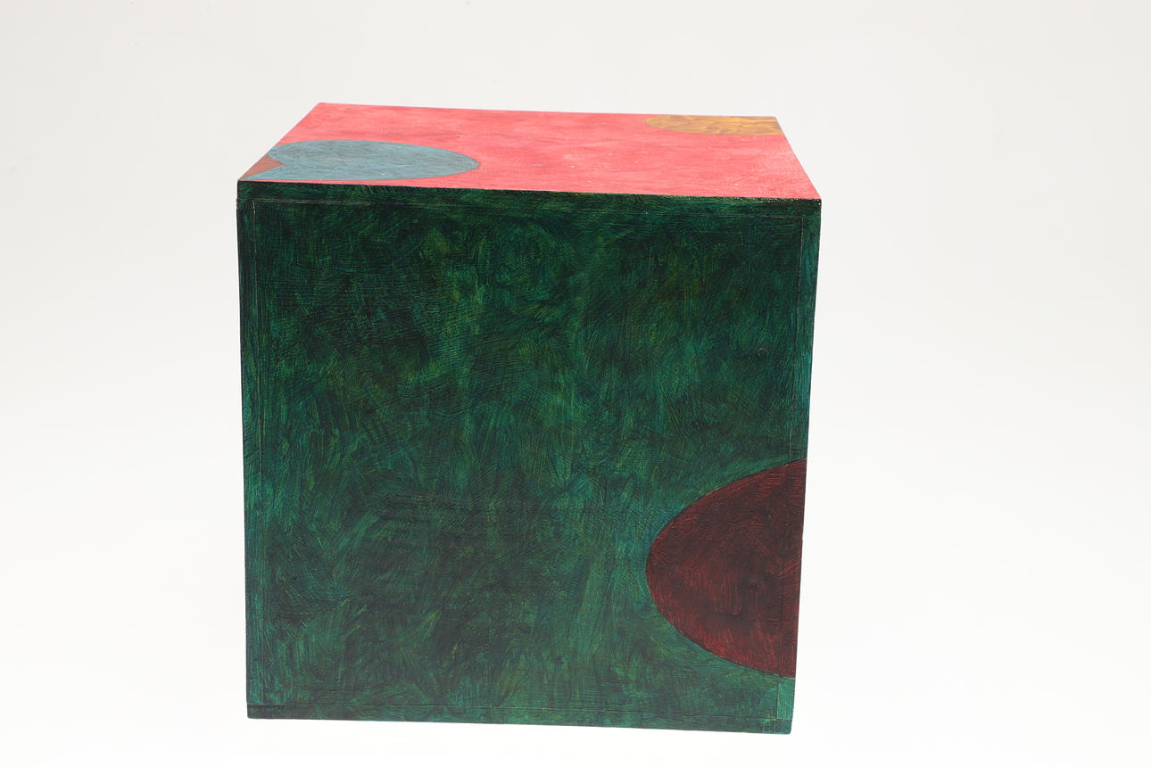 Including a wooden cube with painted decoration, signed and dated 1990 (22cms high, top 20.5cms square). Also with an unsigned wooden cube (22cms high, top 20.5cms square). (2).