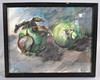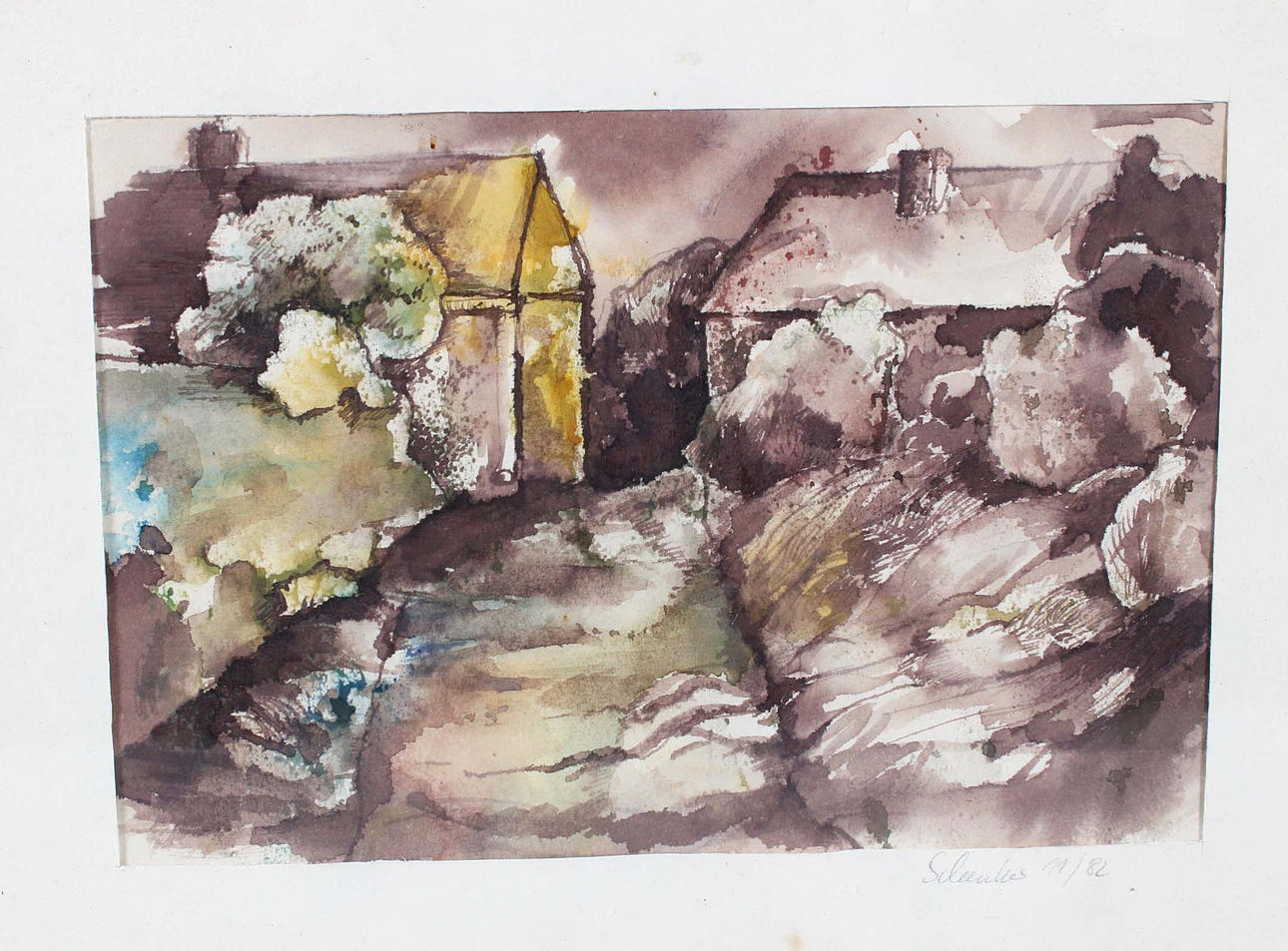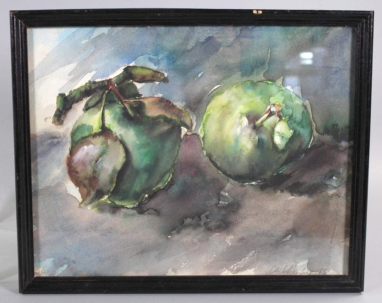 Watercolor, signed in pencil lower right *Chr. Schenker (19) 83*, here a still life with two green apples, leaf ca. 30 x 24 cm, in a black-painted wooden frame approx. 32 x 26 cm plus a watercolor, signed in pencil on the right below the picture field *Schenker 11/82*, village view, a path bordered by trees in the middle and leading to two houses, page ca. 22 x 15 cm, passe-partout behind glass in a simple wooden frame ca. 32 x 26 cm Ges. 2 pieces.