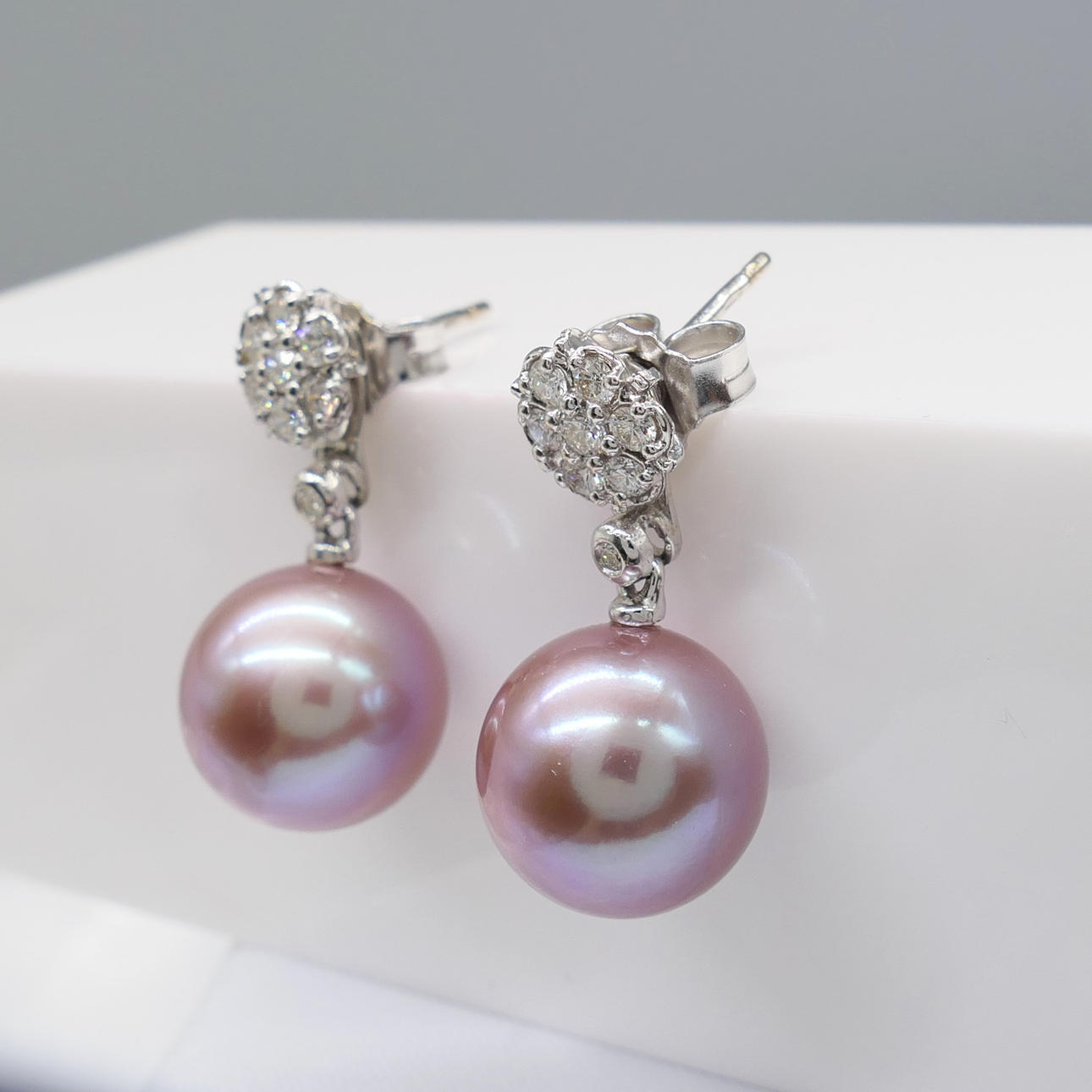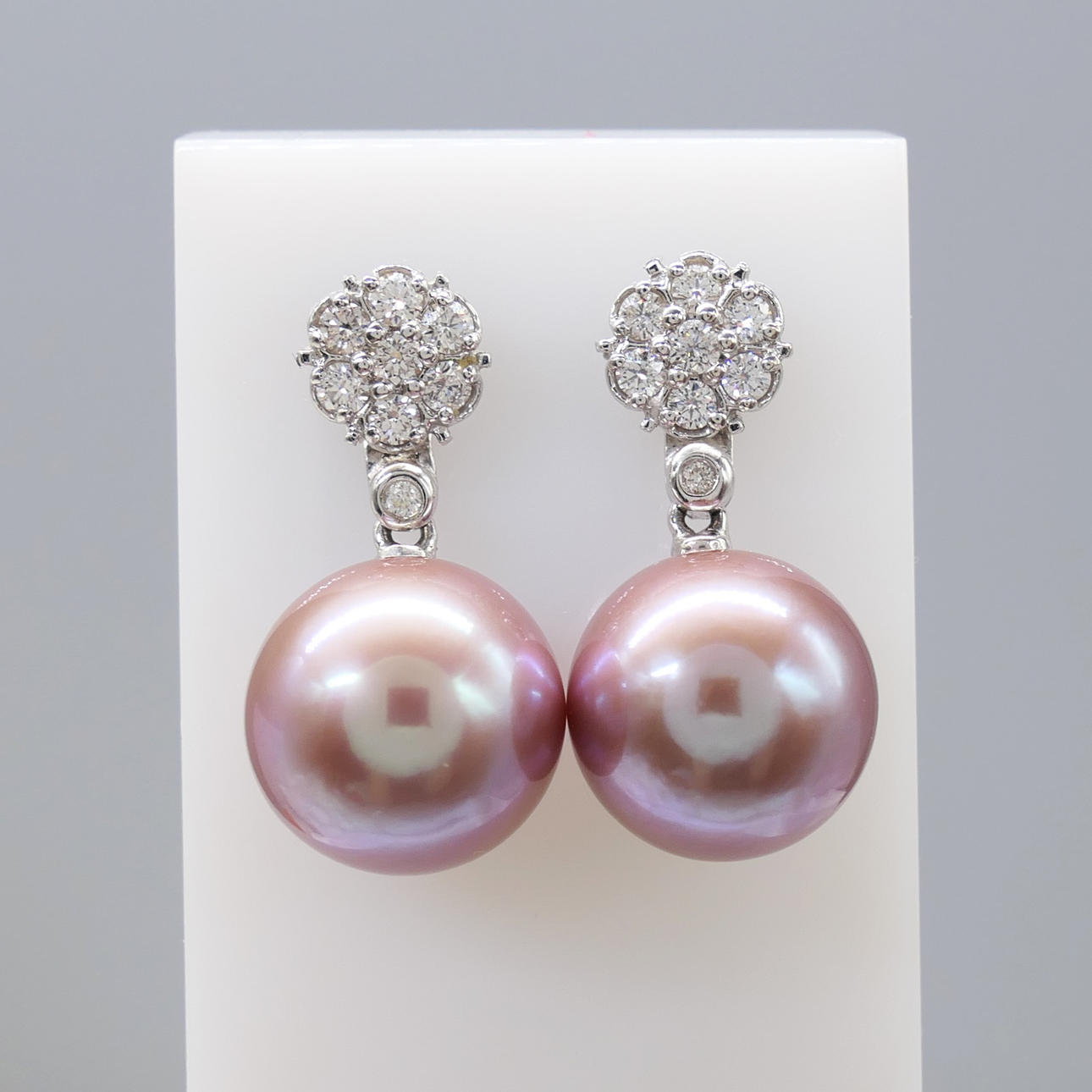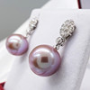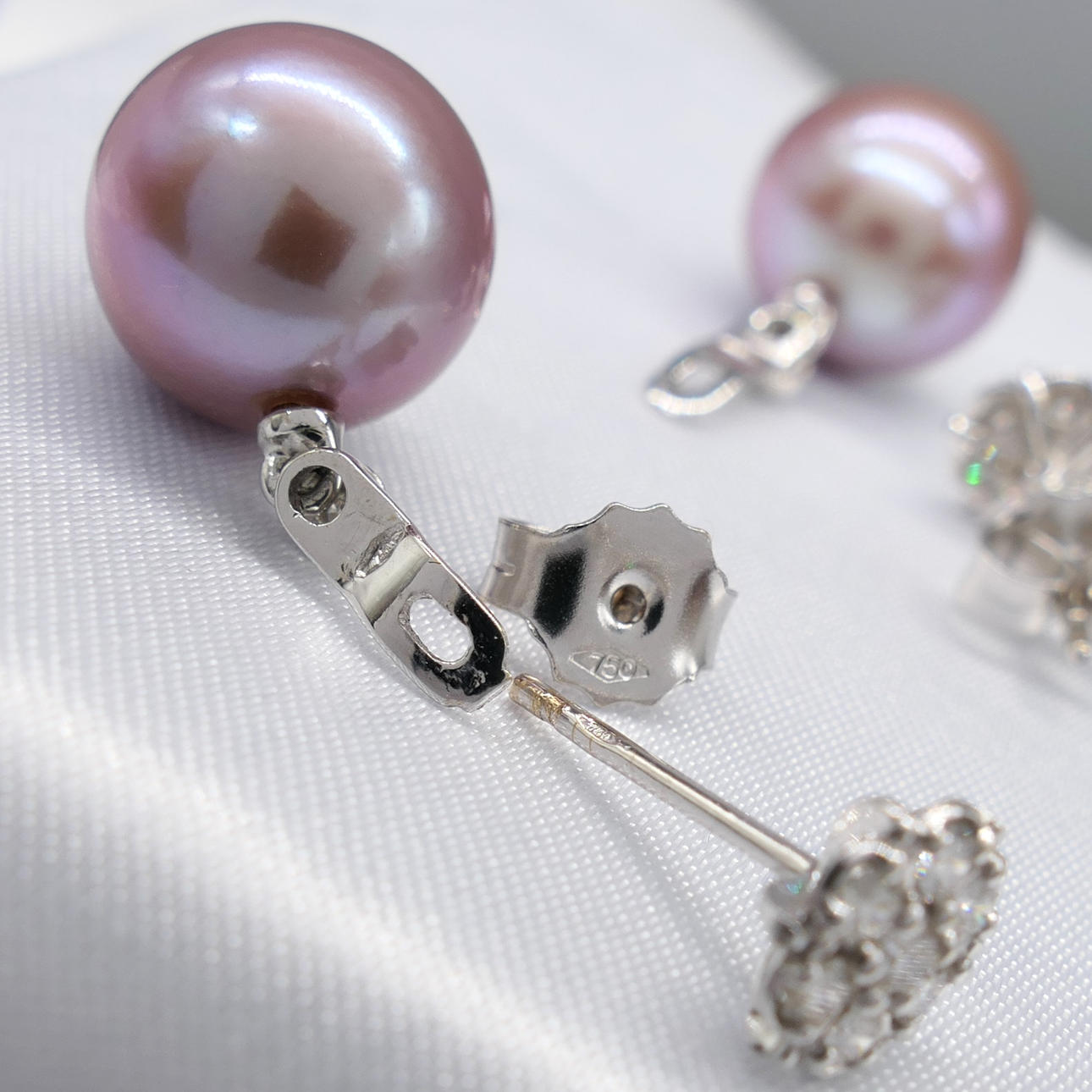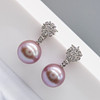 A pair of pinkish grey cultured Tahitian pearl earrings with detachable diamond daisy bales, in 18k white gold