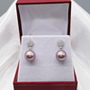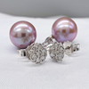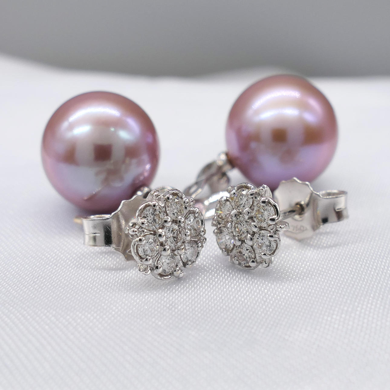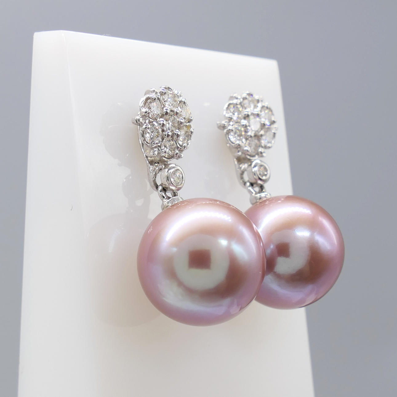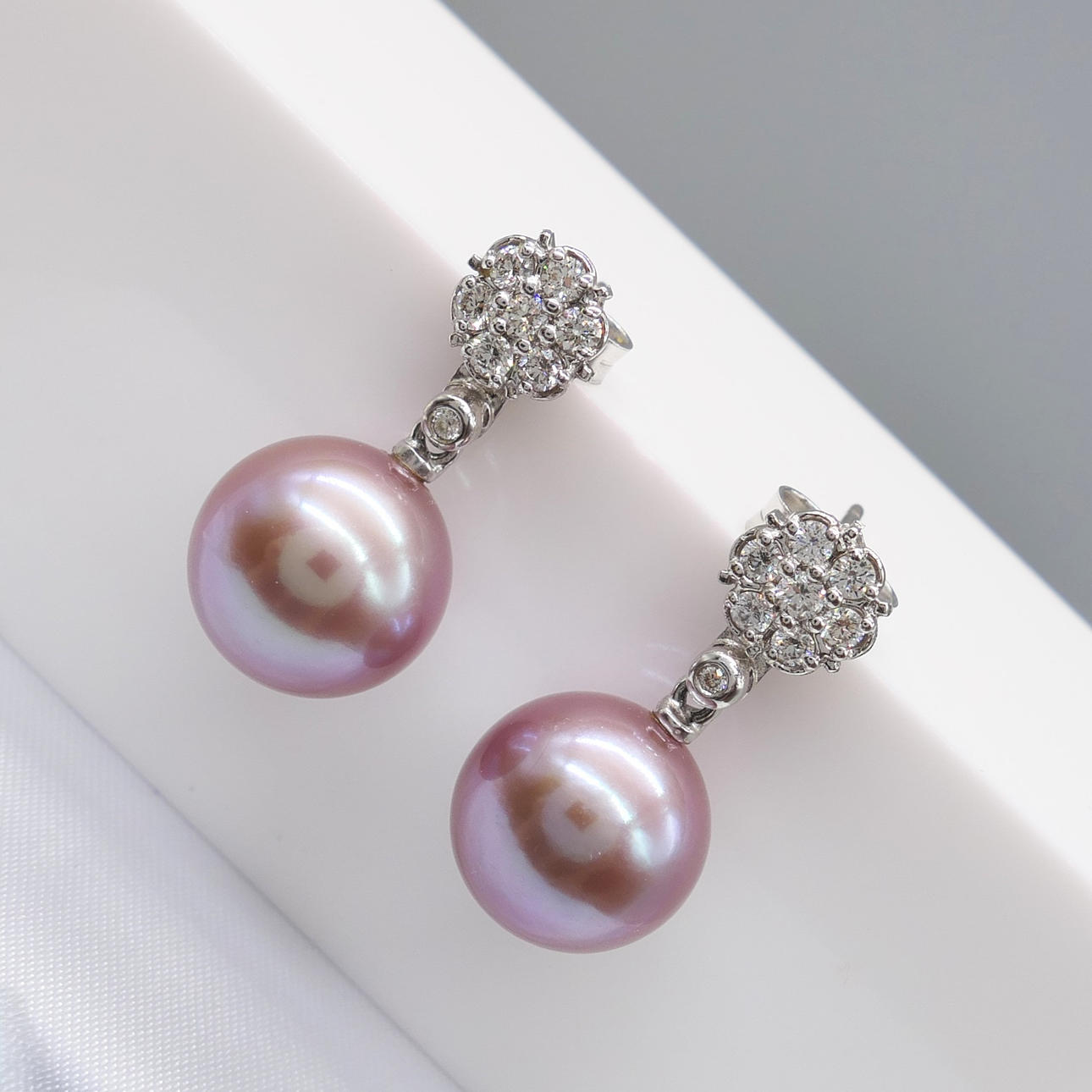 A pair of pinkish grey cultured Tahitian pearl earrings with detachable diamond daisy bales, in 18k white gold