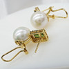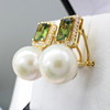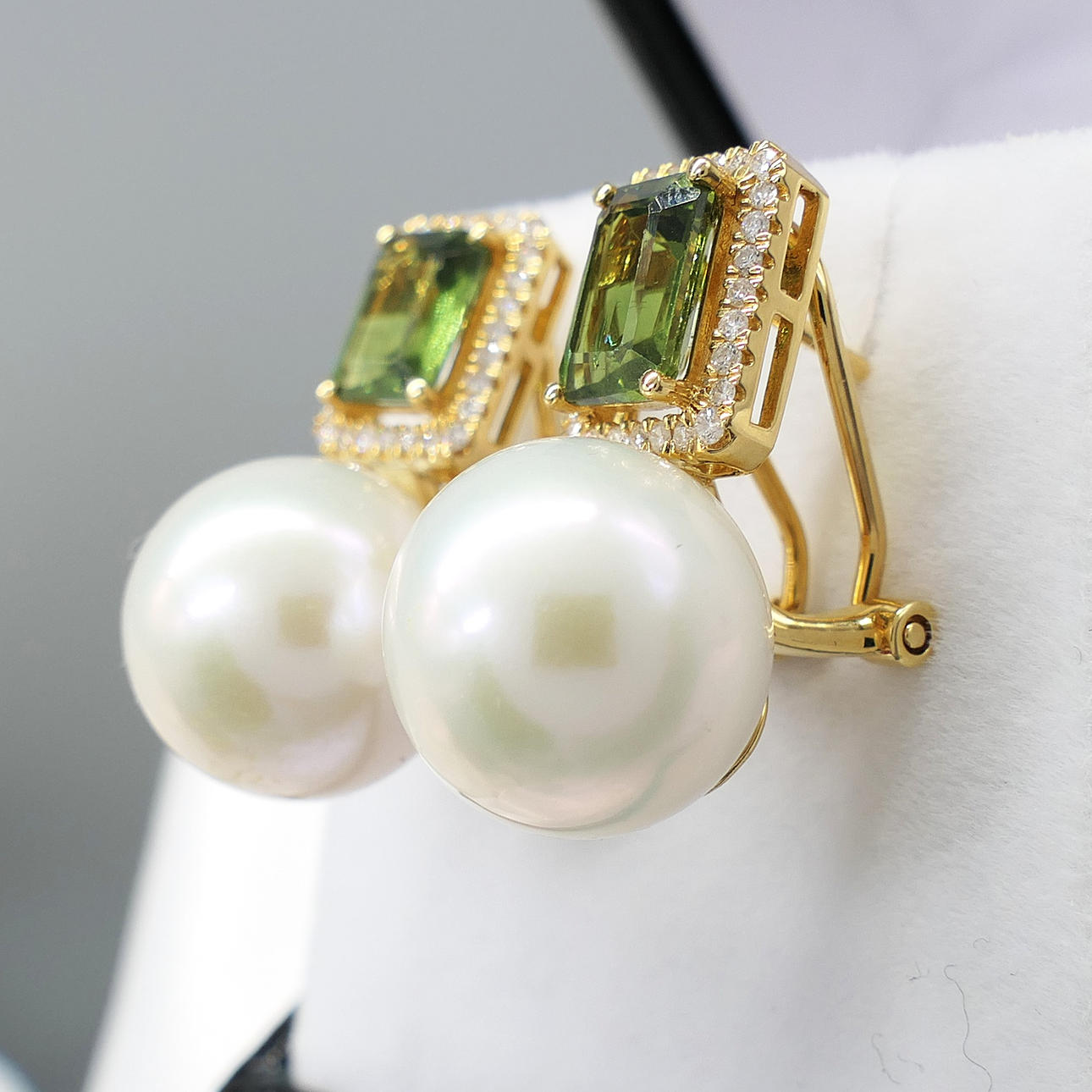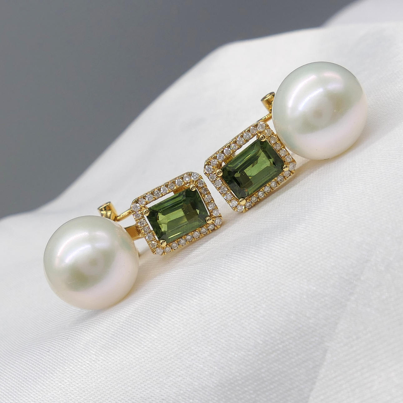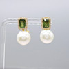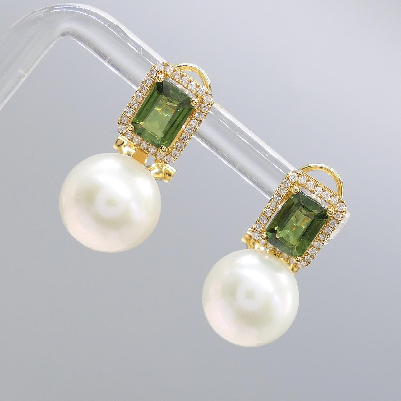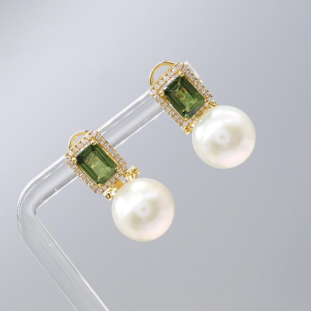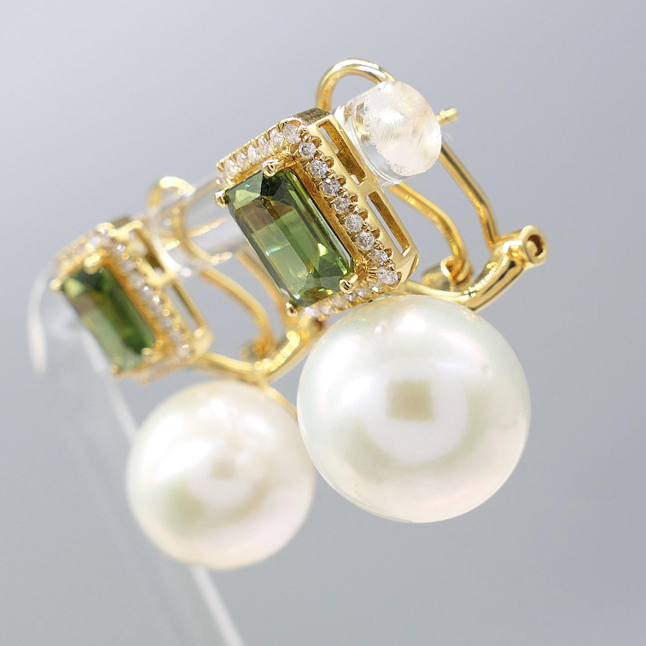 A pair of 18k yellow gold pearl, tourmaline and diamond earrings with French-style clips and a gift box