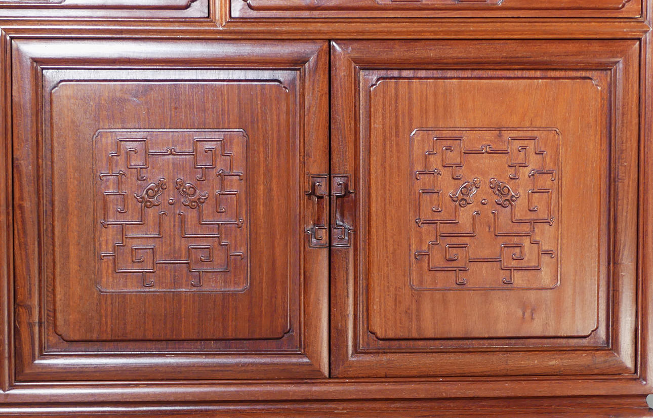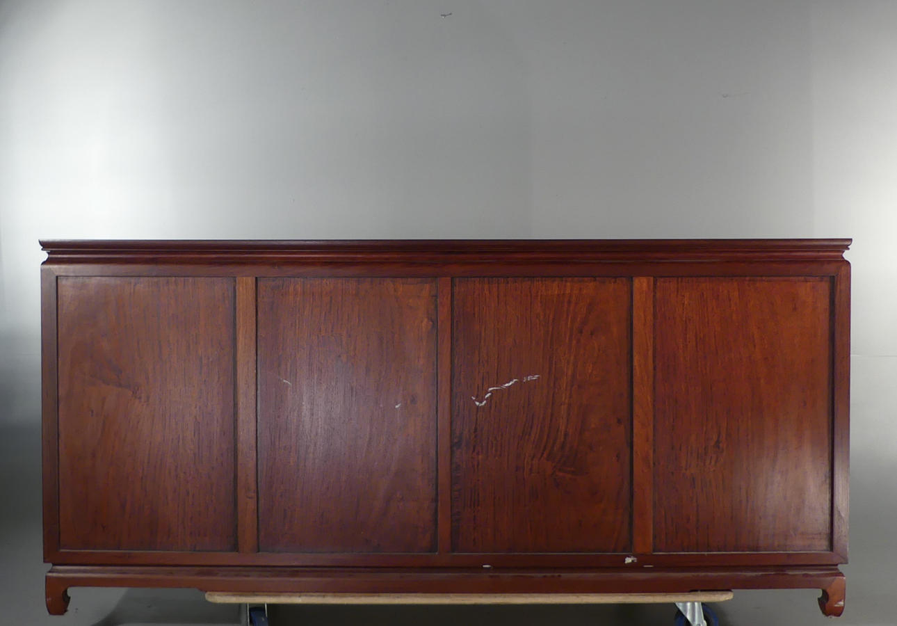 Three drawers, two cabinets with double doors. Length 182,5 cm, depth 48,5 cm, height 86 cm.