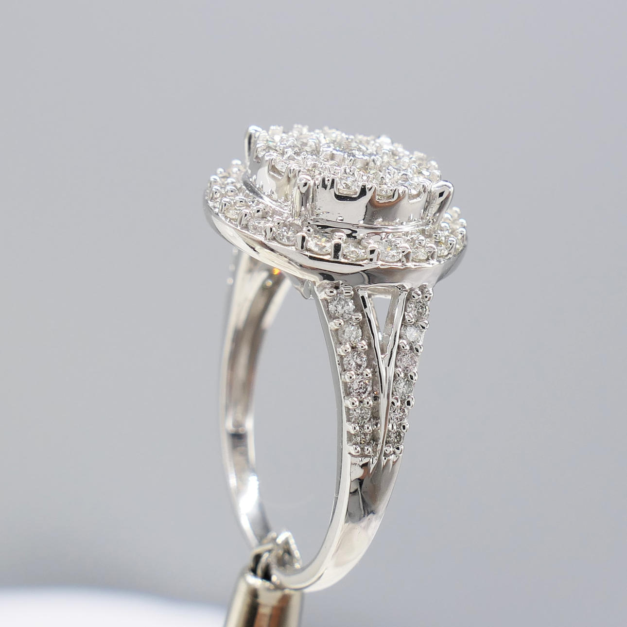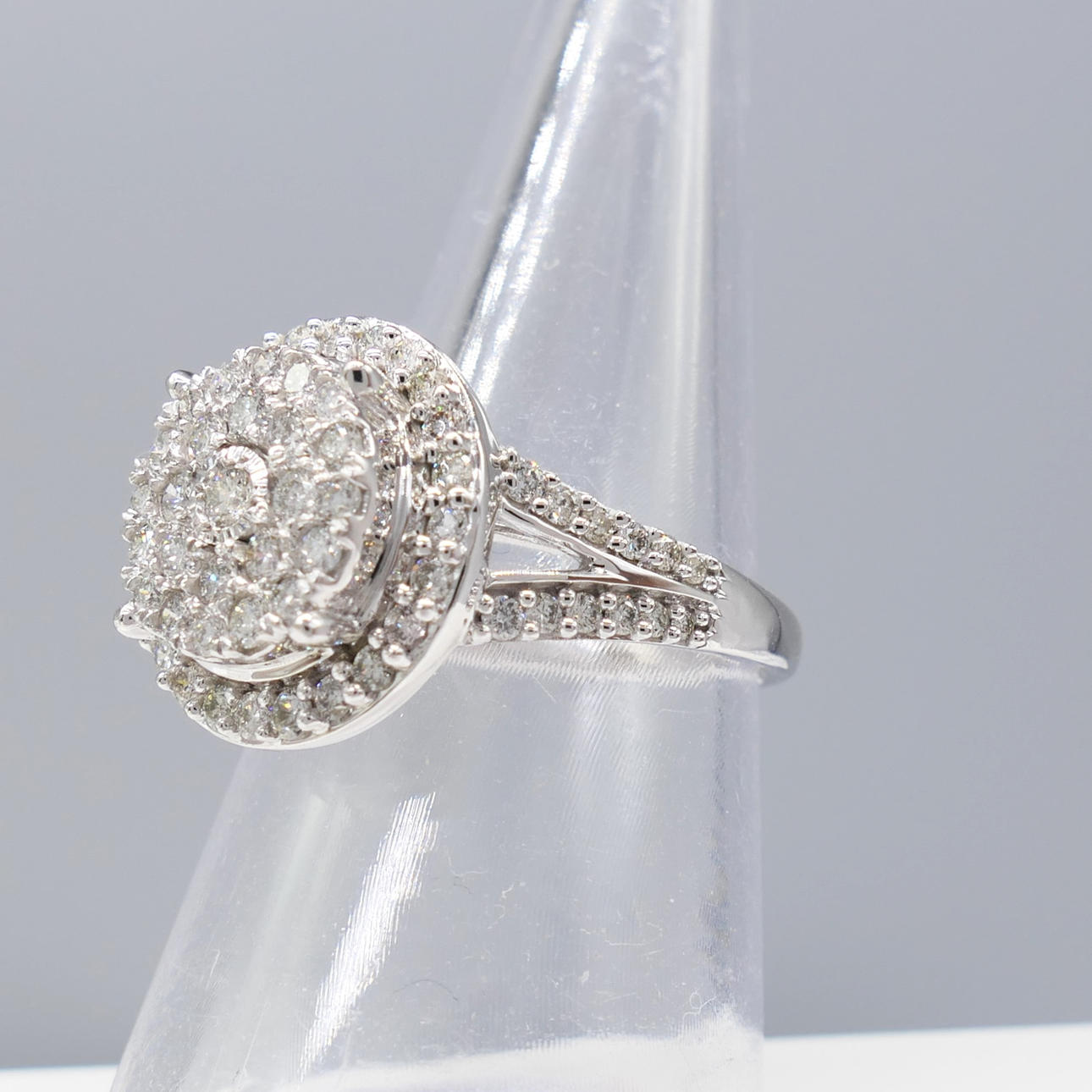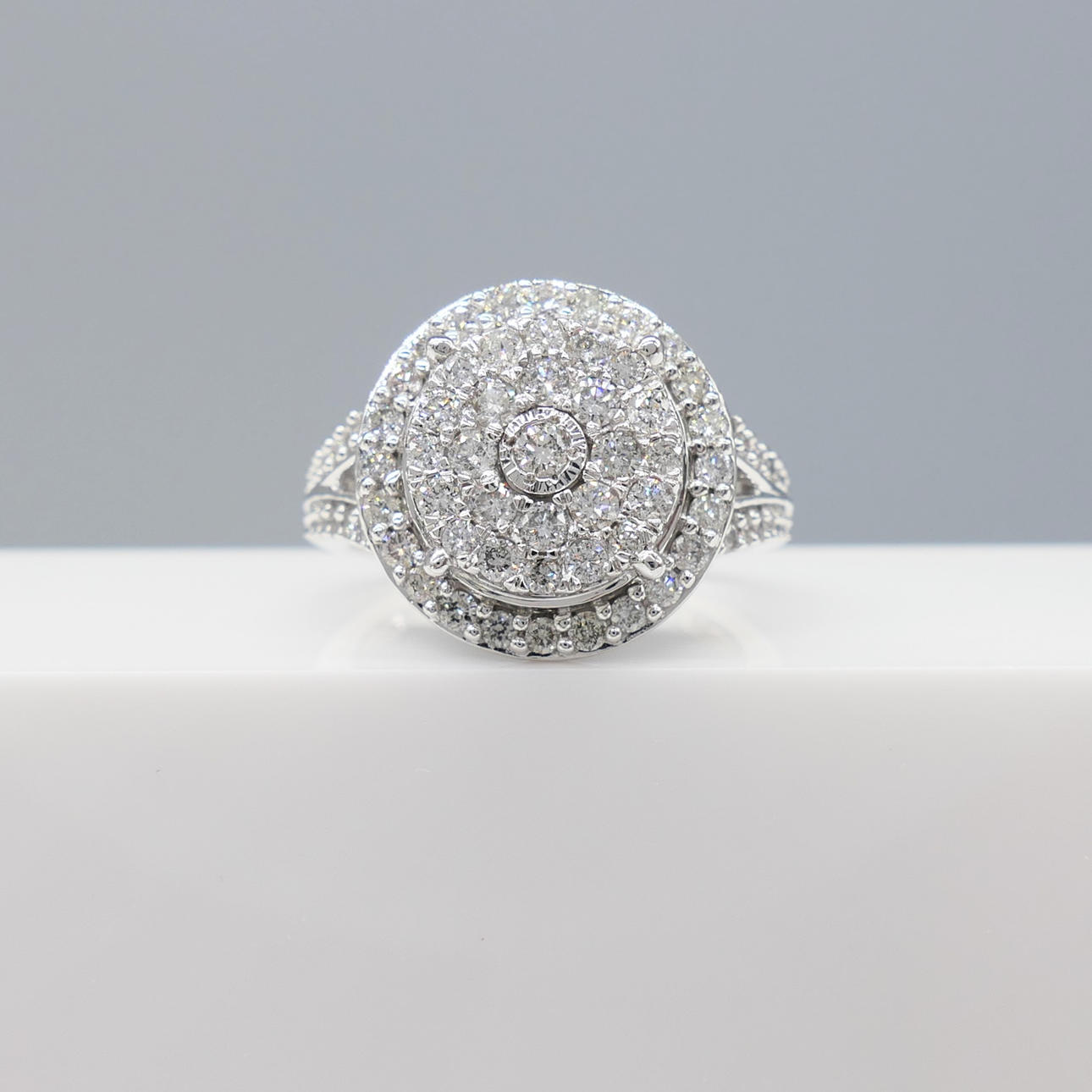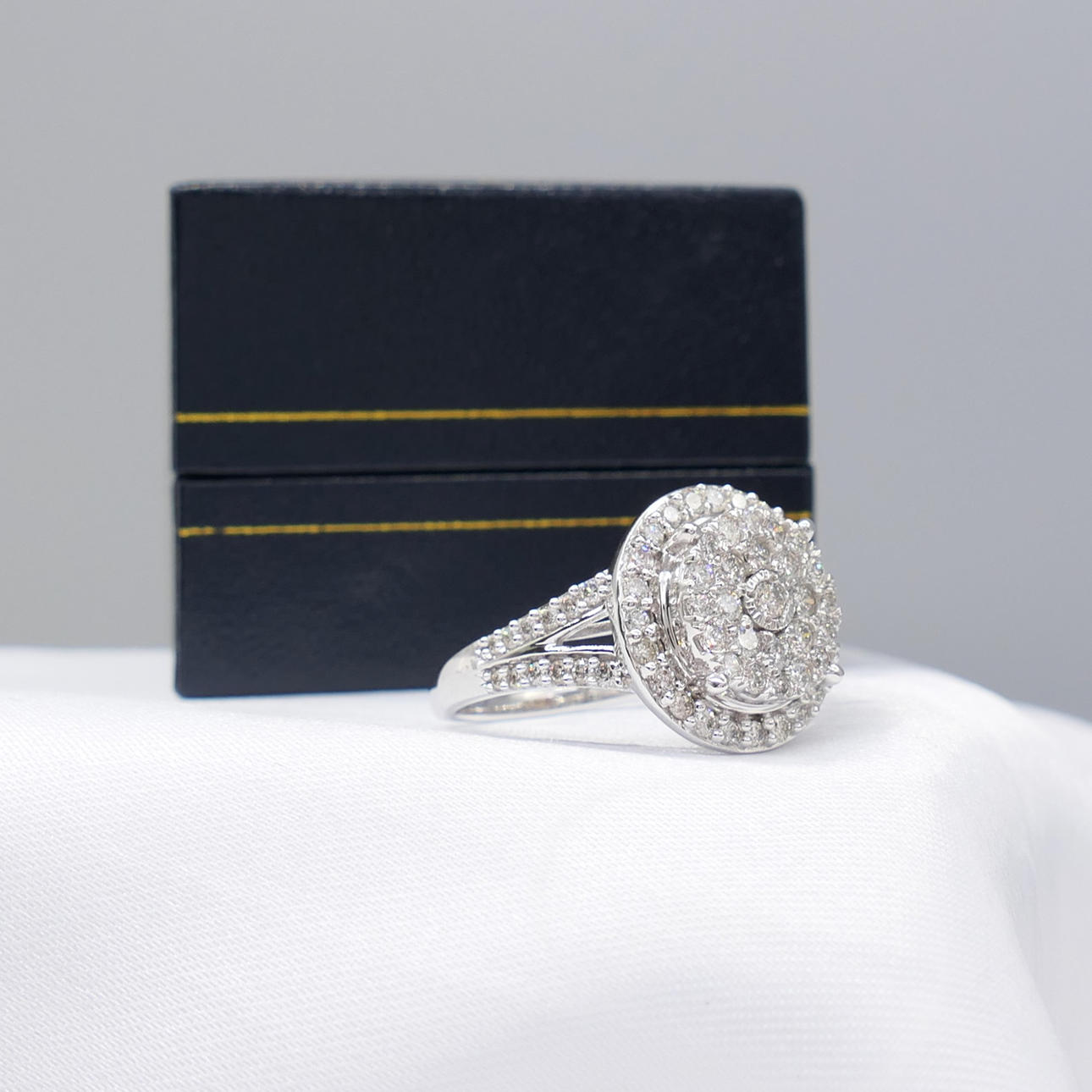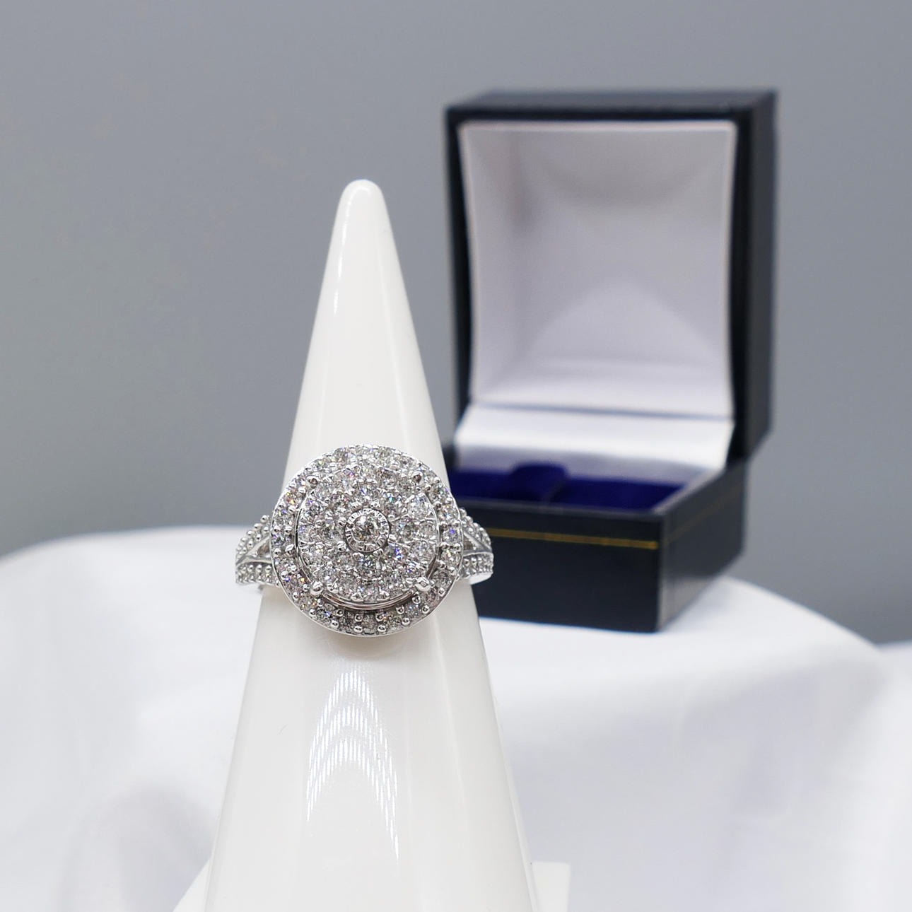 A dazzling white gold cluster ring set with diamonds totalling 1.00 carats. Supplied with a gift box