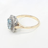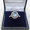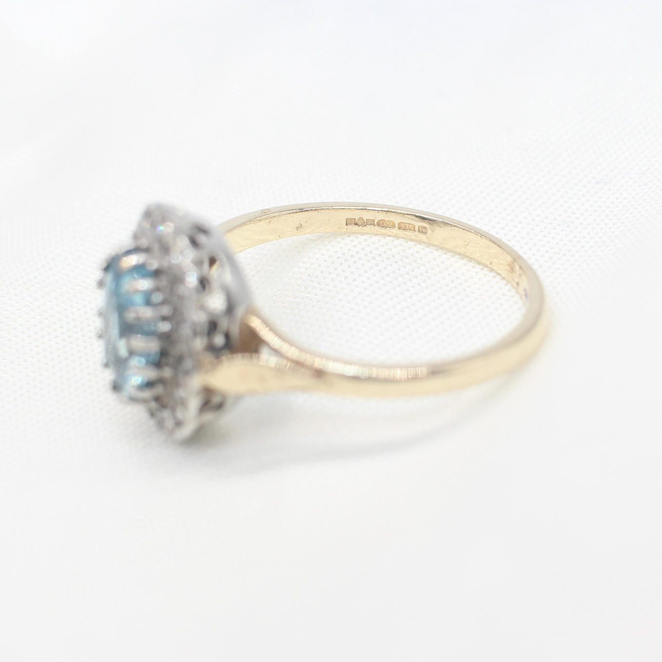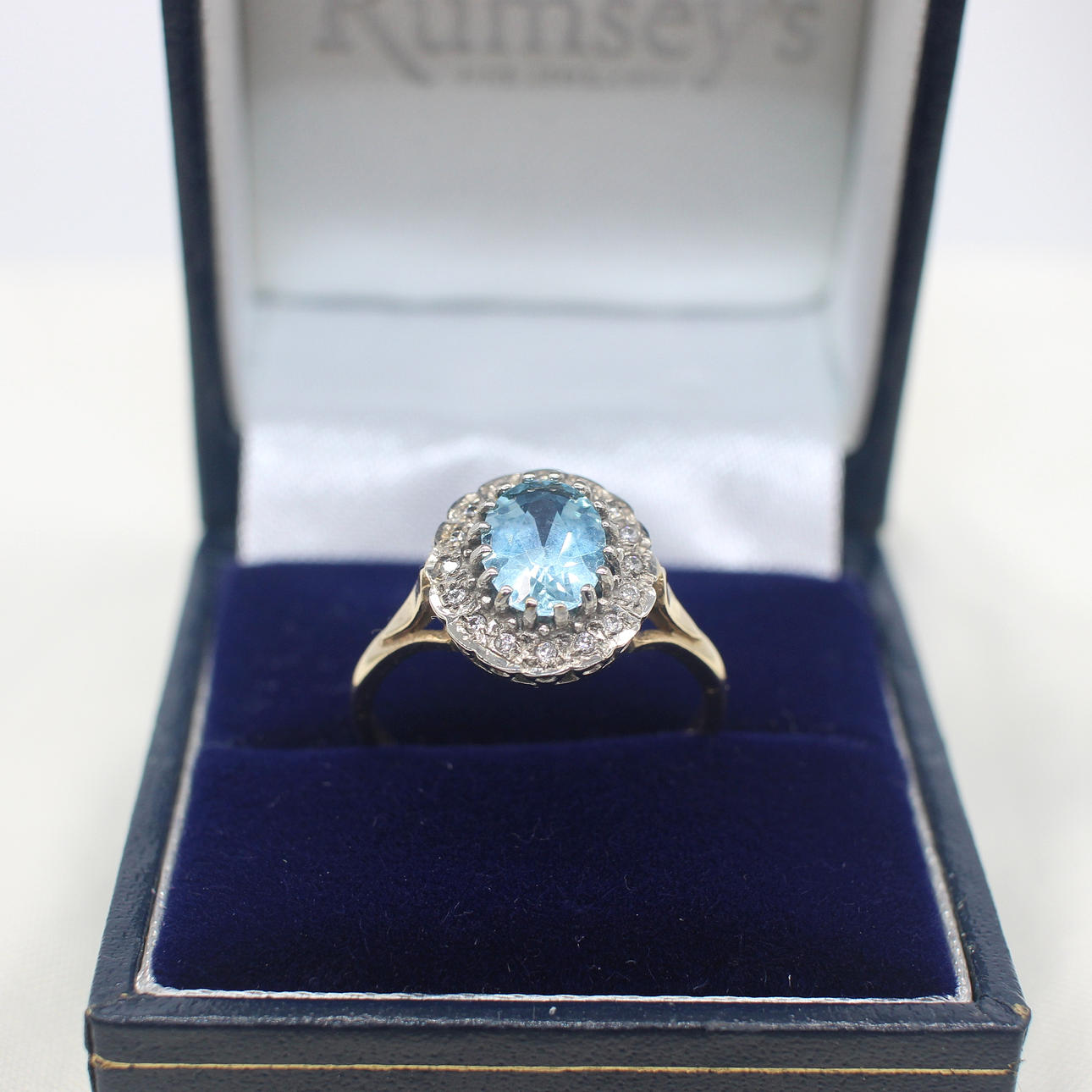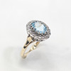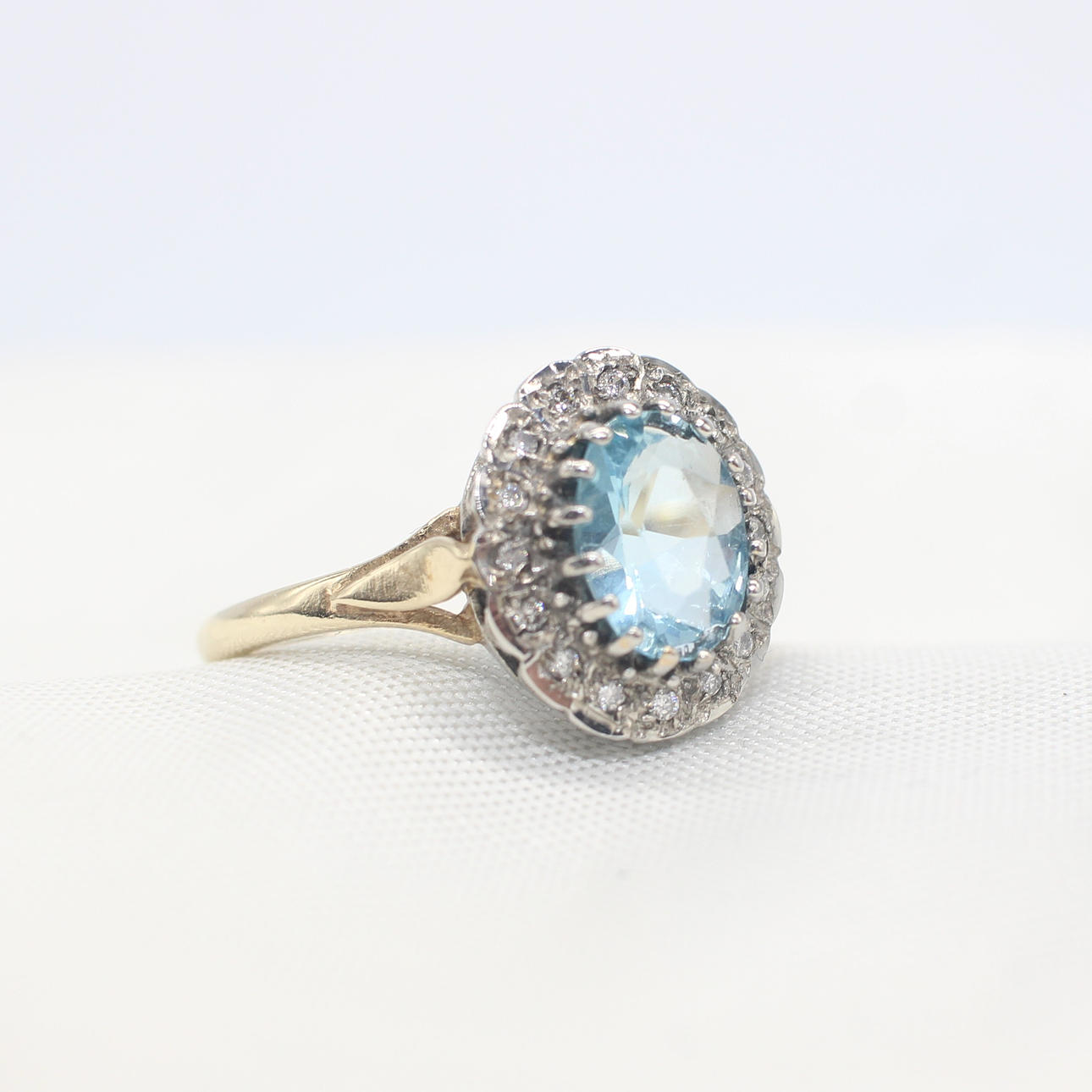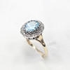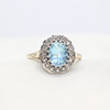 A 9ct Vintage Style Yellow And White Gold (Hallmarked) Ring Set With An Oval Blue Topaz And Surrounded By A Halo Of Round Brilliant Cut Diamonds