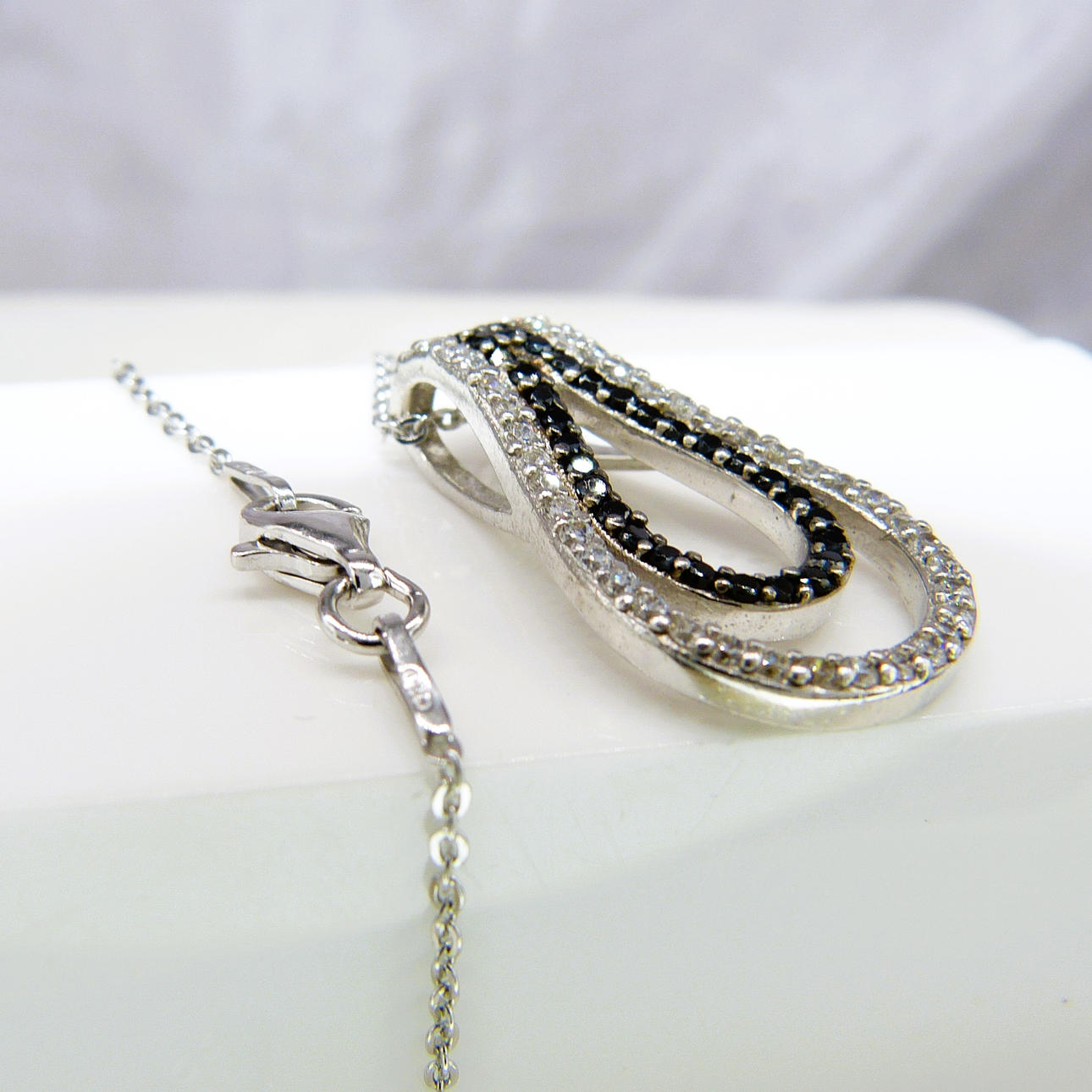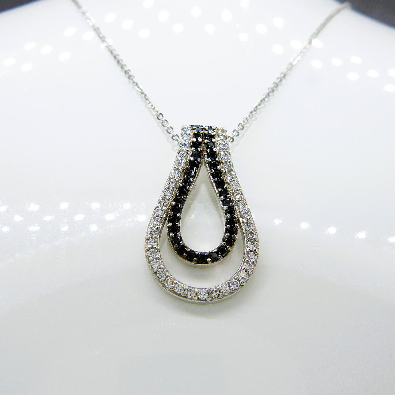 A Silver, Double Pear Shaped Hoop Pendant Set With Black And White Cubic Zirconia On A Silver Chain (Stamped 925)