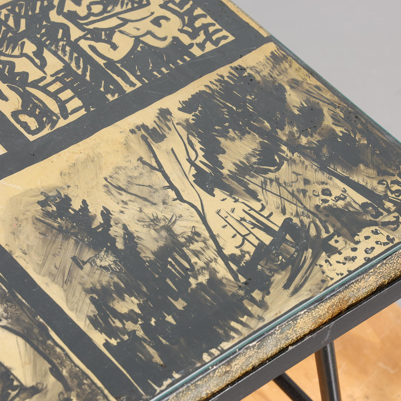Normal wear and tear, scratches on the glass top, cracked furniture feet, visible glue residues under the glass top.